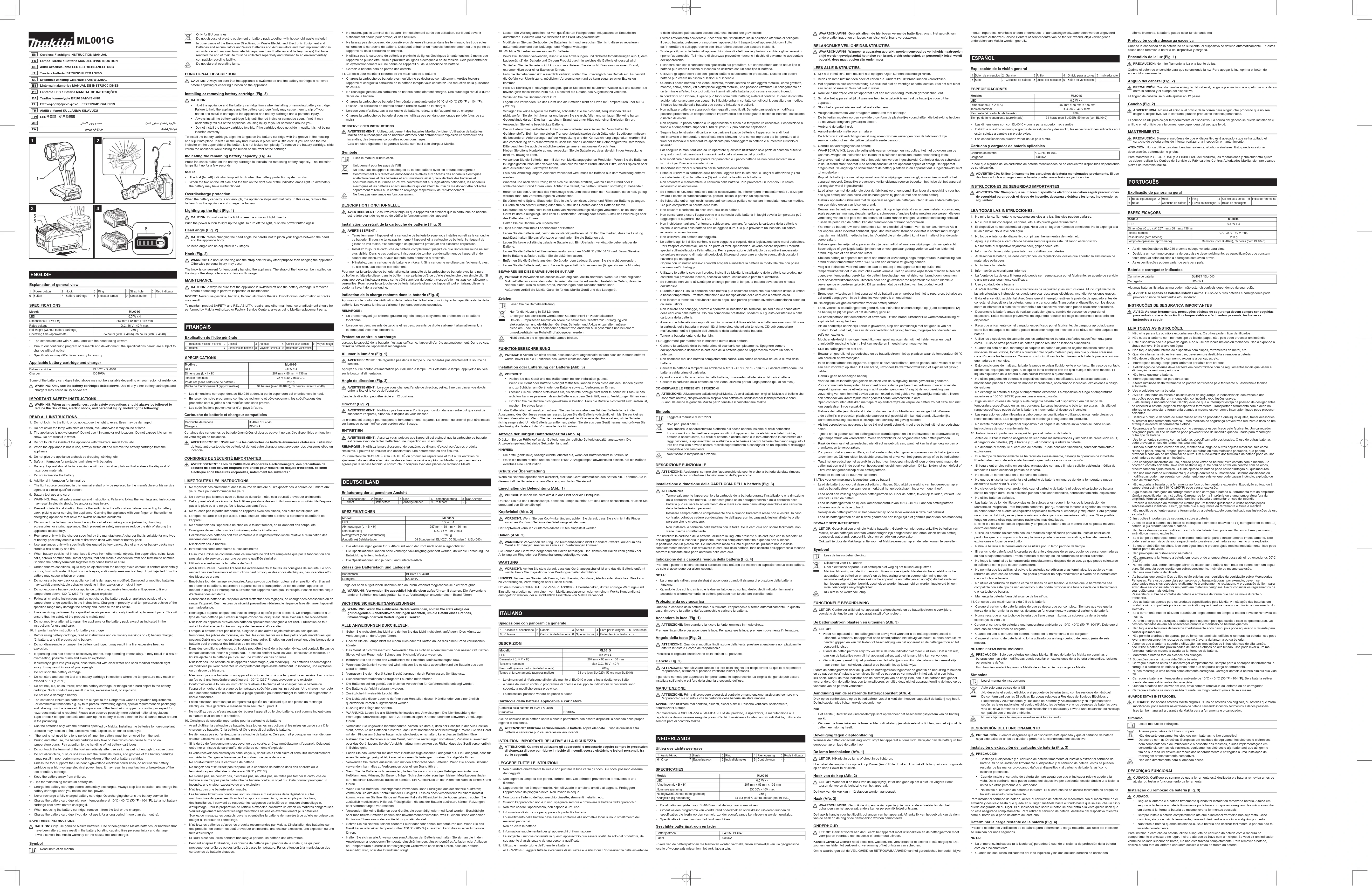 est retirée avant de tenter d'effectuer une inspection ou un entretien.REMARQUE : N’utilisez jamais d’essence, de benzène, de diluant, d’alcool ou d’autres produits similaires. Il pourrait en résulter une décoloration, une déformation ou des fissures.Pour maintenir la SÉCURITÉ et la FIABILITÉ du produit, les réparations et tout autre entretien ou ajustement doivent être effectués par des centres de service agréés par Makita ou par des centres agréés par le service technique constructeur, toujours avec des pièces de rechange Makita. DEUTSCHLAND Erläuterung der allgemeinen Ansicht 1 Einschaltknopf 2 Haken 3 Ring 4 Riemenhalterung 5 Rot-Anzeige 6 Knopf 7 Batteriefach 8 Anzeigelampen 9 Prüfknopf - - SPEZIFIKATIONEN Modell: ML001GLED 0,5 W x 4Abmessungen (L × B × H) 287 mm × 88 mm × 136 mmNennspannung D.C. 36 V - 40 V maxNettogewicht (ohne Batteriefach) 280 g(Ungefähre) Betriebsdauer 34 Stunden (mit BL4025), 55 Stunden (mit BL4040)• Die Abmessungen gelten für BL4040 und wenn der Kopf nach oben ausgerichtet ist.