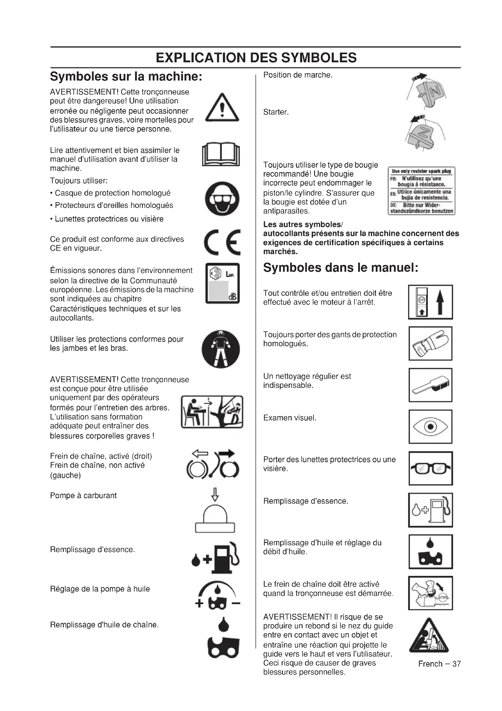 French – 37 Symboles sur la machine: AVERTISSEMENT! Cette tronçonneuse peut être dangereuse! Une utilisation erronée ou négligente peut occasionner des blessures graves, voire mortelles pour l’utilisateur ou une tierce personne. Lire attentivement et bien assimiler le manuel d’utilisation avant d’utiliser la machine. Toujours utiliser: