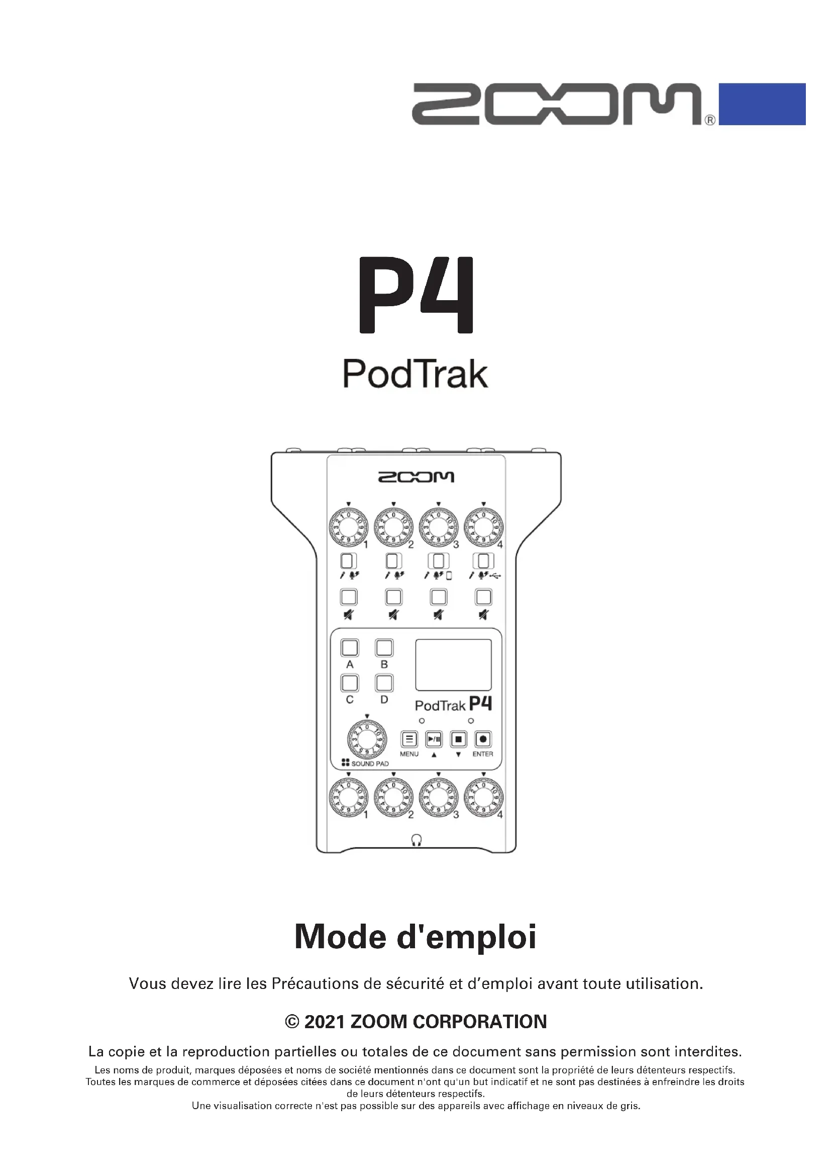 Vous devez lire les Précautions de sécurité et d’emploi avant toute utilisation. Mode d'emploi © 2021 ZOOM CORPORATION La copie et la reproduction partielles ou totales de ce document sans permission sont interdites. Les noms de produit, marques déposées et noms de société mentionnés dans ce document sont la propriété de leurs détenteurs respectifs. Toutes les marques de commerce et déposées citées dans ce document n'ont qu'un but indicatif et ne sont pas destinées à enfreindre les droits de leurs détenteurs respectifs.Une visualisation correcte n'est pas possible sur des appareils avec affichage en niveaux de gris.Remarques concernant ce mode d’emploi Vous pouvez avoir besoin de ce mode d'emploi dans le futur. Gardez-le en un lieu vous permettant d’y ac- céder facilement. Le contenu de ce document et les caractéristiques de ce produit sont sujets à modications sans préavis.