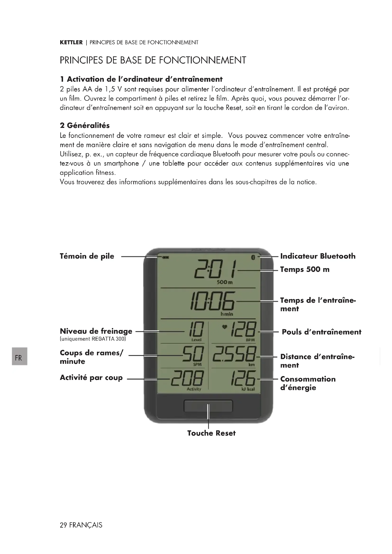 1 Activation de l’ordinateur d’entraînement 2 piles AA de 1,5 V sont requises pour alimenter l’ordinateur d’entraînement. Il est protégé par un film. Ouvrez le compartiment à piles et retirez le film. Après quoi, vous pouvez démarrer l’or- dinateur d’entraînement soit en appuyant sur la touche Reset, soit en tirant le cordon de l’aviron. 2 Généralités Le fonctionnement de votre rameur est clair et simple. Vous pouvez commencer votre entraîne- ment de manière claire et sans navigation de menu dans le mode d’entraînement central. Utilisez, p. ex., un capteur de fréquence cardiaque Bluetooth pour mesurer votre pouls ou connec- tez-vous à un smartphone / une tablette pour accéder aux contenus supplémentaires via une application fitness. Vous trouverez des informations supplémentaires dans les sous-chapitres de la notice. Témoin de pile Indicateur Bluetooth Temps de l’entraîne- ment Distance d’entraîne- ment Consommation d’énergie Niveau de freinage (uniquement REGATTA 300) Coups de rames/ minute Activité par coup Touche Reset Temps 500 m Pouls d’entraînementNAVIGATION D’ENTRAÎNEMENT | KETTLER FRANÇAIS