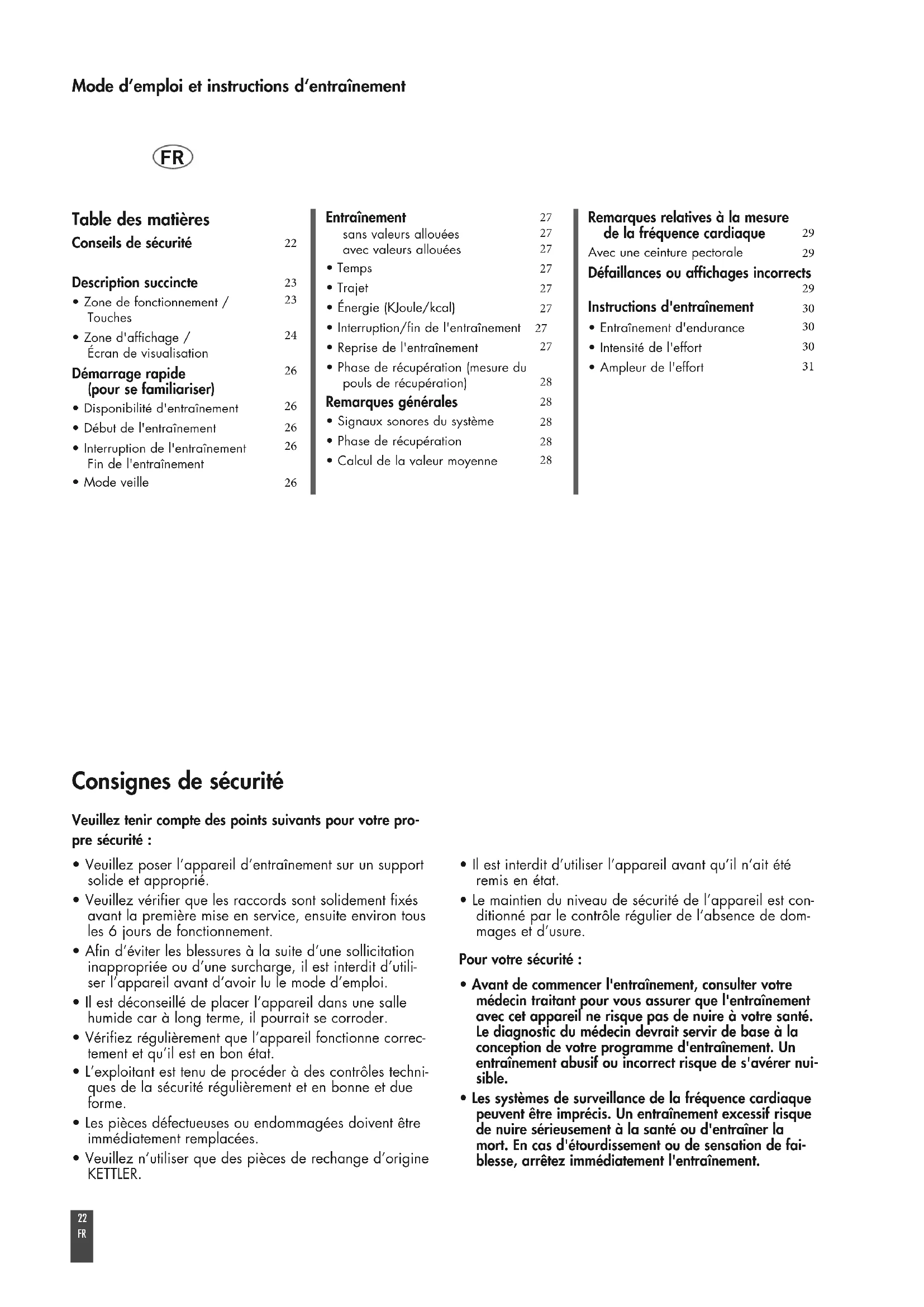 - Les systèmes de surveillance de la fréquence cardiaque peuvent être imprécis. Un entraînement excessif risque de nuire sérieusement à la santé ou d'entraîner la mort. En cas d'étourdissement ou de sensation de fai- blesse, arrêtez immédiatement l'entraînement. Table des matières Conseils de sécurité