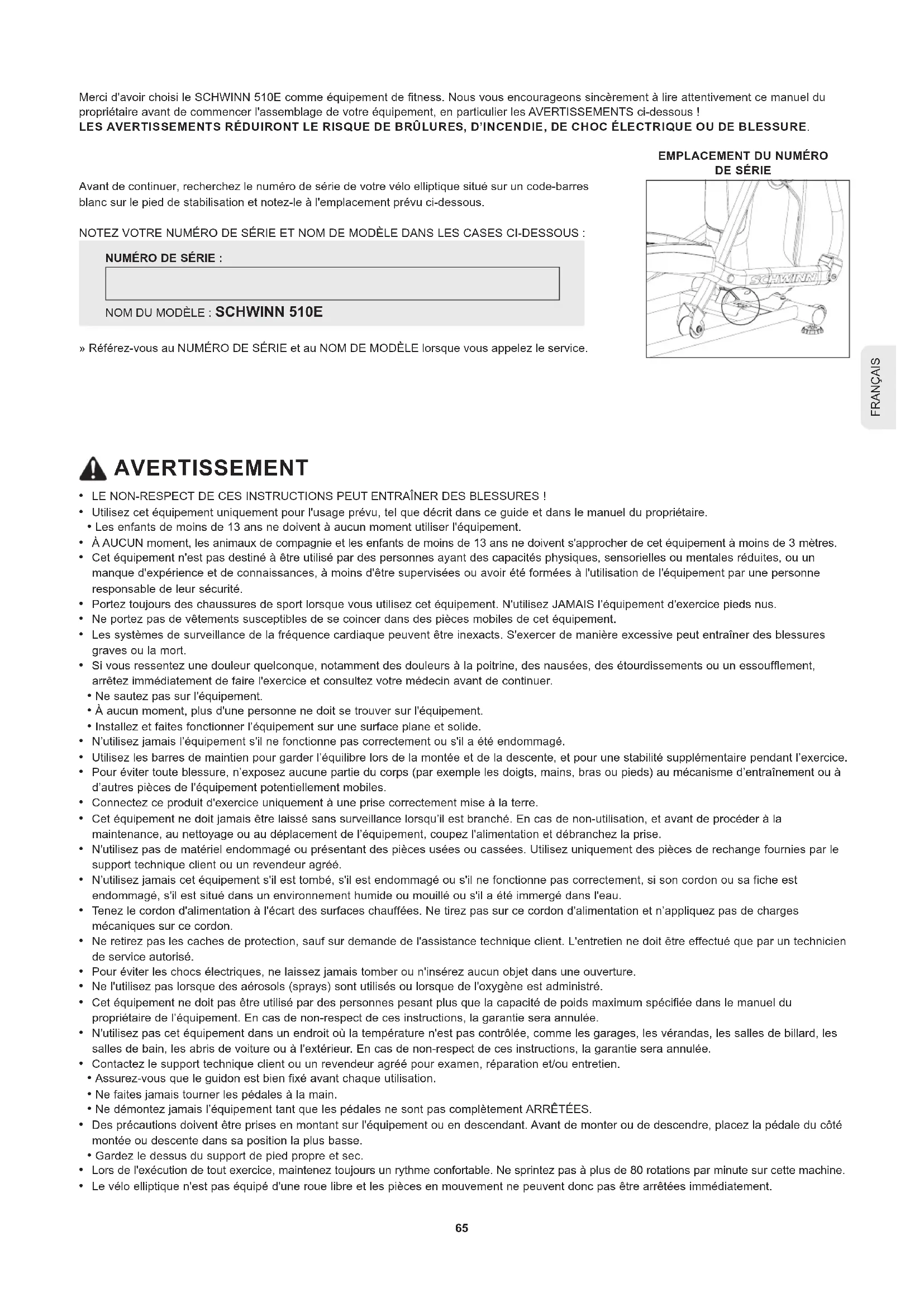 Merci d'avoir choisi le SCHWINN 510E comme équipement de fitness. Nous vous encourageons sincèrement à lire attentivement ce manuel du propriétaire avant de commencer l'assemblage de votre équipement, en particulier les AVERTISSEMENTS ci-dessous ! LES AVERTISSEMENTS RÉDUIRONT LE RISQUE DE BRÛLURES, D’INCENDIE, DE CHOC ÉLECTRIQUE OU DE BLESSURE. Avant de continuer, recherchez le numéro de série de votre vélo elliptique situé sur un code-barres blanc sur le pied de stabilisation et notez-le à l'emplacement prévu ci-dessous. NOTEZ VOTRE NUMÉRO DE SÉRIE ET NOM DE MODÈLE DANS LES CASES CI-DESSOUS :