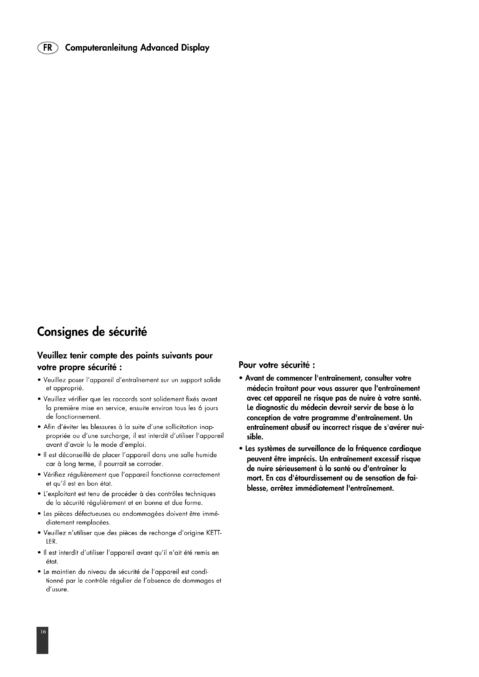 Le récepteur se trouve derrière l'affichage. Les ceintures pectorales ne font pas toujours partie des fournitures. Pour un entraînement se basant sur la fréquence cardiaque, nous conseillons l'utilisation d'une ceinture pectorale.Computeranleitung Advanced Display Établir une connexion avec un smartphone ou une tablette L'appareil de sport Kettler peut se raccorder au moyen de Bluetooth à des smartphones ou tablettes à partir de Bluetooth v4.0, ce qui permet l'entraînement avec KettMaps et d'autres APPs compatibles. La connexion s'établit à partir du menu de démarrage à l'option de menu Bluetooth setup. Sélectionnez cette option de menu par pression de la touche centrale. À l'écran suivant, l'appareil attend un signal de votre smartphone ou tablette. Veuillez vous assurer que Bluetooth est bien activé sur votre smart- phone ou votre tablette et que l'appareil est visible. Dès que l'ordinateur d'entraînement reconnaît votre smartphone ou votre tablette, il demande l'entrée d'un code d'authentification. Veuillez entrer ce code dans votre smartphone ou votre tablette. Lorsque l'accouplement est fructueux, la connexion Bluetooth est établie. Le processus d'identification n'est nécessaire que lors du premier accouplement. Remarque : une connexion avec un smartphone ou une tablette n'est possible que lorsque l'appareil est à l'arrêt. Le cas échéant, vous serez invité à vous arrêter. Utilisation de l'APP KettMaps KettMaps vous permet de charger de nombreux trajets sous forme de vidéos réalistes sur votre smart- phone ou tablette à titre de motivation d'entraînement. La version de base gratuite met déjà plusieurs trajets à votre disposition. Une taxe mensuelle modique vous offre l'accès total à la banque de données contenant plusieurs milliers de trajet. Pour plus d'informations, consultez www.kettlersport.com. Mise à jour du logiciel d'ordinateur À des intervalles non réguliers, Kettler met des mises à jour de logiciel pour l'ordinateur de l'appareil à votre disposition. Vous trouverez toutes les informations à ce sujet à www.kettlersport.com.