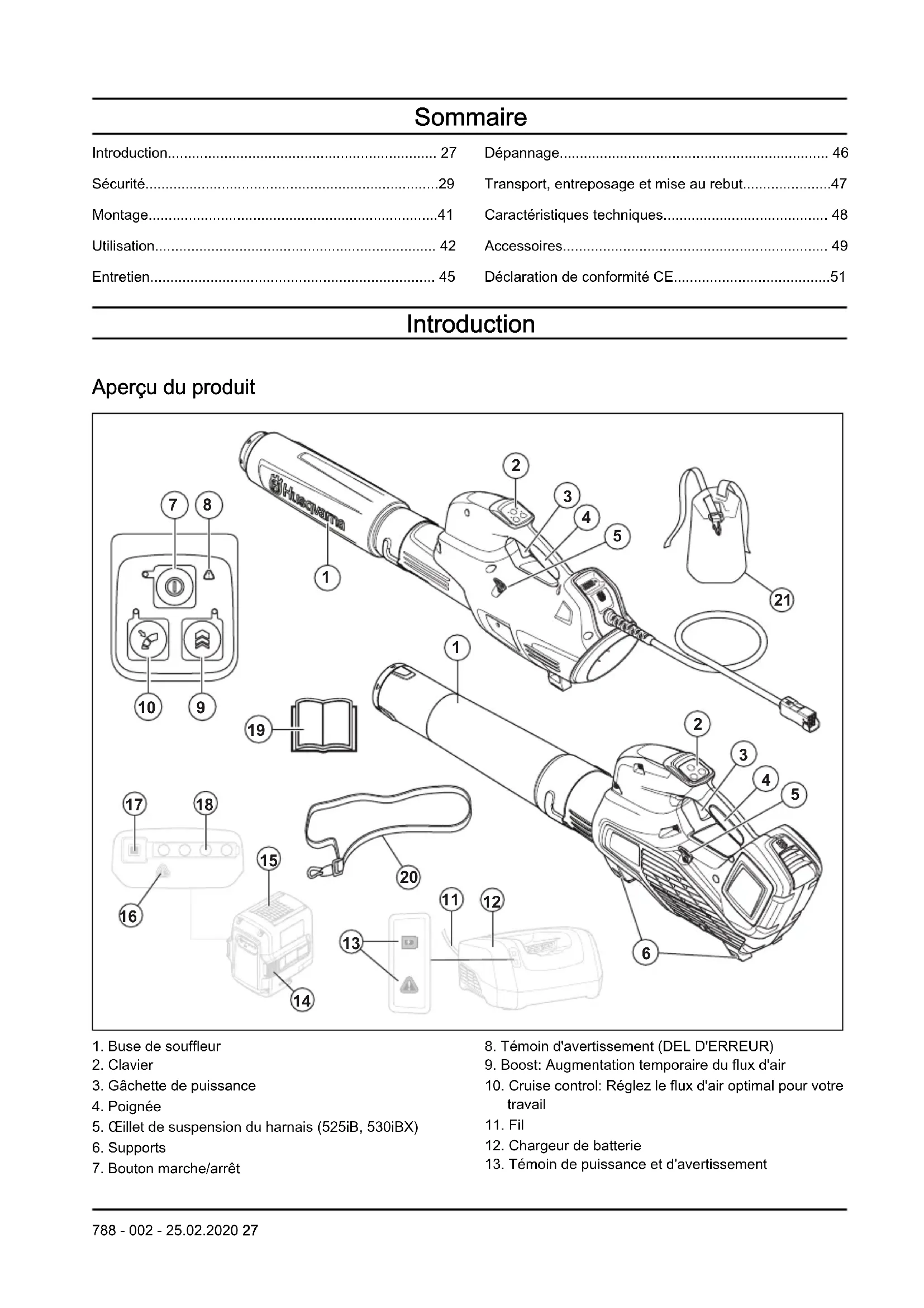 1. Buse de souffleur2. Clavier3. Gâchette de puissance4. Poignée5. Œillet de suspension du harnais (525iB, 530iBX)6. Supports7. Bouton marche/arrêt8. Témoin d'avertissement (DEL D'ERREUR)9. Boost: Augmentation temporaire du flux d'air10. Cruise control: Réglez le flux d'air optimal pour votretravail11. Fil12. Chargeur de batterie13. Témoin de puissance et d'avertissement788 - 002 - 25.02.2020 2714. Bouton de libération de la batterie