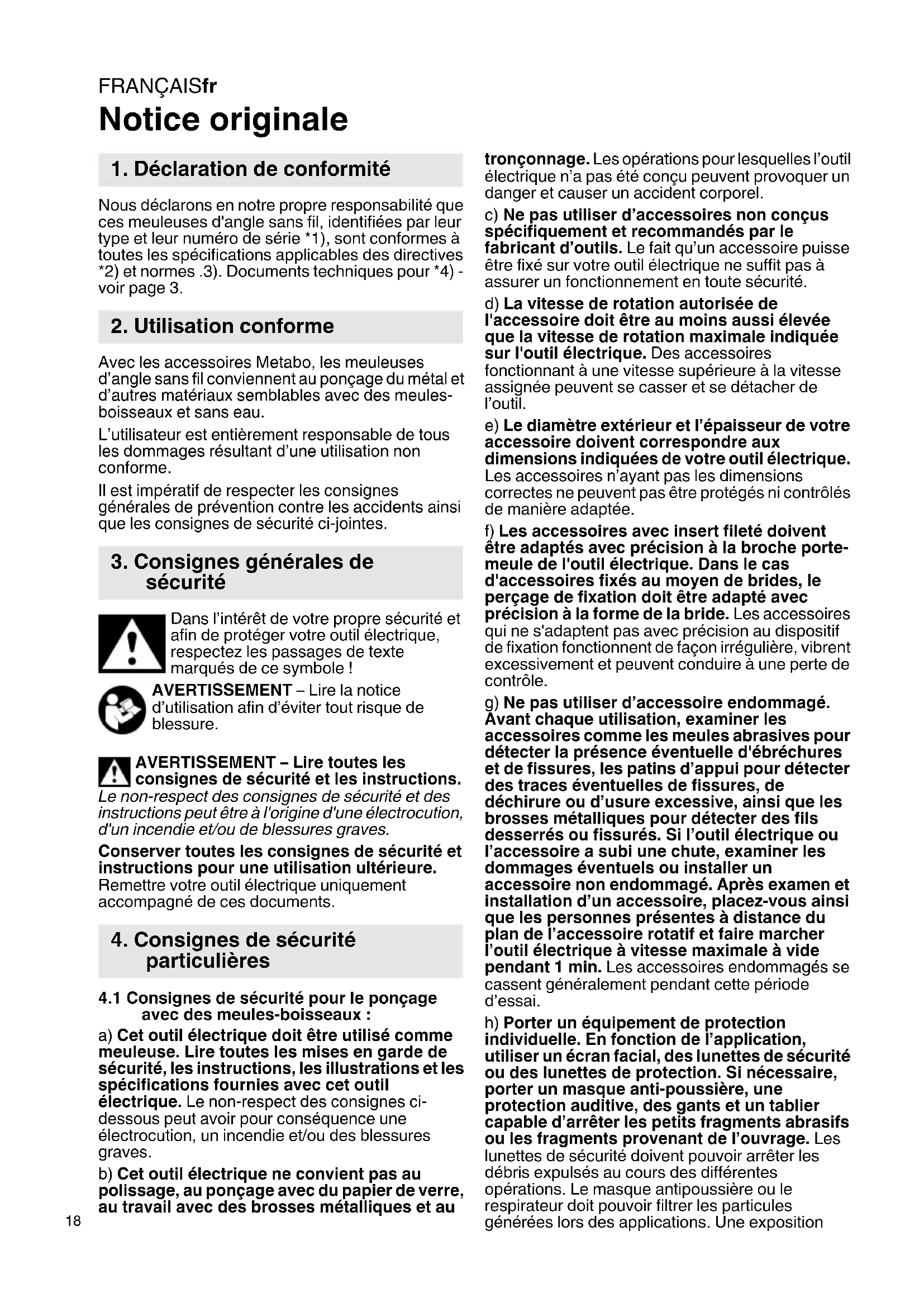 Notice originale Nous déclarons en notre propre responsabilité que ces meuleuses d'angle sans fil, identifiées par leur type et leur numéro de série *1), sont conformes à toutes les spécifications applicables des directives *2) et normes .3). Documents techniques pour *4) - voir page 3. Avec les accessoires Metabo, les meuleuses d’angle sans fil conviennent au ponçage du métal et d’autres matériaux semblables avec des meules- boisseaux et sans eau. L’utilisateur est entièrement responsable de tous les dommages résultant d’une utilisation non conforme. Il est impératif de respecter les consignes générales de prévention contre les accidents ainsi que les consignes de sécurité ci-jointes. Dans l’intérêt de votre propre sécurité et afin de protéger votre outil électrique, respectez les passages de texte marqués de ce symbole ! AVERTISSEMENT – Lire la notice d’utilisation afin d’éviter tout risque de blessure. AVERTISSEMENT – Lire toutes les consignes de sécurité et les instructions. Le non-respect des consignes de sécurité et des instructions peut être à l'origine d'une électrocution, d'un incendie et/ou de blessures graves. Conserver toutes les consignes de sécurité et instructions pour une utilisation ultérieure. Remettre votre outil électrique uniquement accompagné de ces documents.