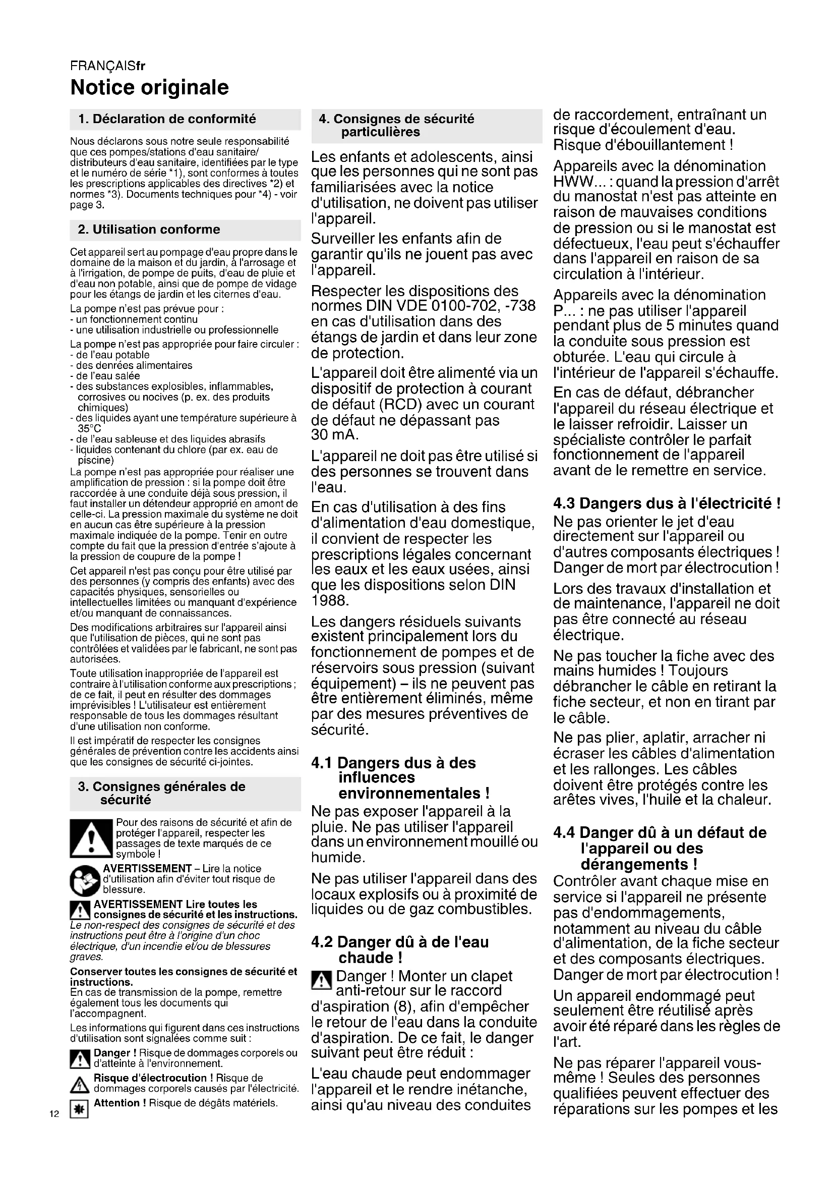 Notice originale Nous déclarons sous notre seule responsabilité que ces pompes/stations d'eau sanitaire/ distributeurs d'eau sanitaire, identifiées par le type et le numéro de série *1), sont conformes à toutes les prescriptions applicables des directives *2) et normes *3). Documents techniques pour *4) - voir page 3. Cet appareil sert au pompage d'eau propre dans le domaine de la maison et du jardin, à l'arrosage et à l'irrigation, de pompe de puits, d'eau de pluie et d'eau non potable, ainsi que de pompe de vidage pour les étangs de jardin et les citernes d'eau. La pompe n’est pas prévue pour : - un fonctionnement continu - une utilisation industrielle ou professionnelle La pompe n’est pas appropriée pour faire circuler : - de l’eau potable - des denrées alimentaires - de l’eau salée - des substances explosibles, inflammables, corrosives ou nocives (p. ex. des produits chimiques) - des liquides ayant une température supérieure à 35°C - de l’eau sableuse et des liquides abrasifs - liquides contenant du chlore (par ex. eau de piscine) La pompe n’est pas appropriée pour réaliser une amplification de pression : si la pompe doit être raccordée à une conduite déjà sous pression, il faut installer un détendeur approprié en amont de celle-ci. La pression maximale du système ne doit en aucun cas être supérieure à la pression maximale indiquée de la pompe. Tenir en outre compte du fait que la pression d'entrée s’ajoute à la pression de coupure de la pompe ! Cet appareil n'est pas conçu pour être utilisé par des personnes (y compris des enfants) avec des capacités physiques, sensorielles ou intellectuelles limitées ou manquant d'expérience et/ou manquant de connaissances. Des modifications arbitraires sur l'appareil ainsi que l'utilisation de pièces, qui ne sont pas contrôlées et validées par le fabricant, ne sont pas autorisées. Toute utilisation inappropriée de l'appareil est contraire à l'utilisation conforme aux prescriptions ; de ce fait, il peut en résulter des dommages imprévisibles ! L'utilisateur est entièrement responsable de tous les dommages résultant d'une utilisation non conforme. Il est impératif de respecter les consignes générales de prévention contre les accidents ainsi que les consignes de sécurité ci-jointes. Pour des raisons de sécurité et afin de protéger l'appareil, respecter les passages de texte marqués de ce symbole ! AVERTISSEMENT – Lire la notice d'utilisation afin d'éviter tout risque de blessure. AVERTISSEMENT Lire toutes les consignes de sécurité et les instructions. Le non-respect des consignes de sécurité et des instructions peut être à l'origine d'un choc électrique, d'un incendie et/ou de blessures graves. Conserver toutes les consignes de sécurité et instructions. En cas de transmission de la pompe, remettre également tous les documents qui l’accompagnent. Les informations qui figurent dans ces instructions d'utilisation sont signalées comme suit : Danger ! Risque de dommages corporels ou d'atteinte à l'environnement. Risque d'électrocution ! Risque de dommages corporels causés par l'électricité. Attention ! Risque de dégâts matériels. Les enfants et adolescents, ainsi que les personnes qui ne sont pas familiarisées avec la notice d'utilisation, ne doivent pas utiliser l'appareil. Surveiller les enfants afin de garantir qu'ils ne jouent pas avec l'appareil. Respecter les dispositions des normes DIN VDE 0100-702, -738 en cas d'utilisation dans des étangs de jardin et dans leur zone de protection. L'appareil doit être alimenté via un dispositif de protection à courant de défaut (RCD) avec un courant de défaut ne dépassant pas 30 mA. L'appareil ne doit pas être utilisé si des personnes se trouvent dans l'eau. En cas d'utilisation à des fins d'alimentation d'eau domestique, il convient de respecter les prescriptions légales concernant les eaux et les eaux usées, ainsi que les dispositions selon DIN