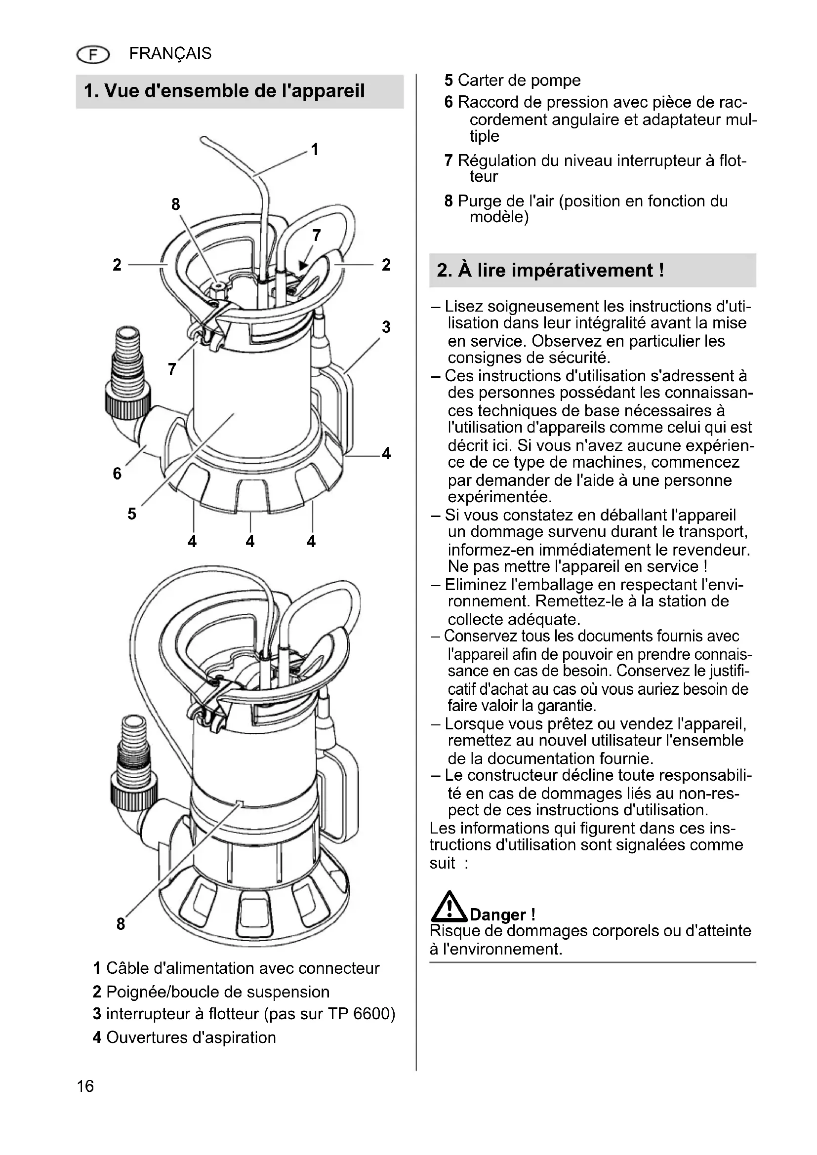 1 Câble d'alimentation avec connecteur 2 Poignée/boucle de suspension 3 interrupteur à flotteur (pas sur TP 6600) 4 Ouvertures d'aspiration