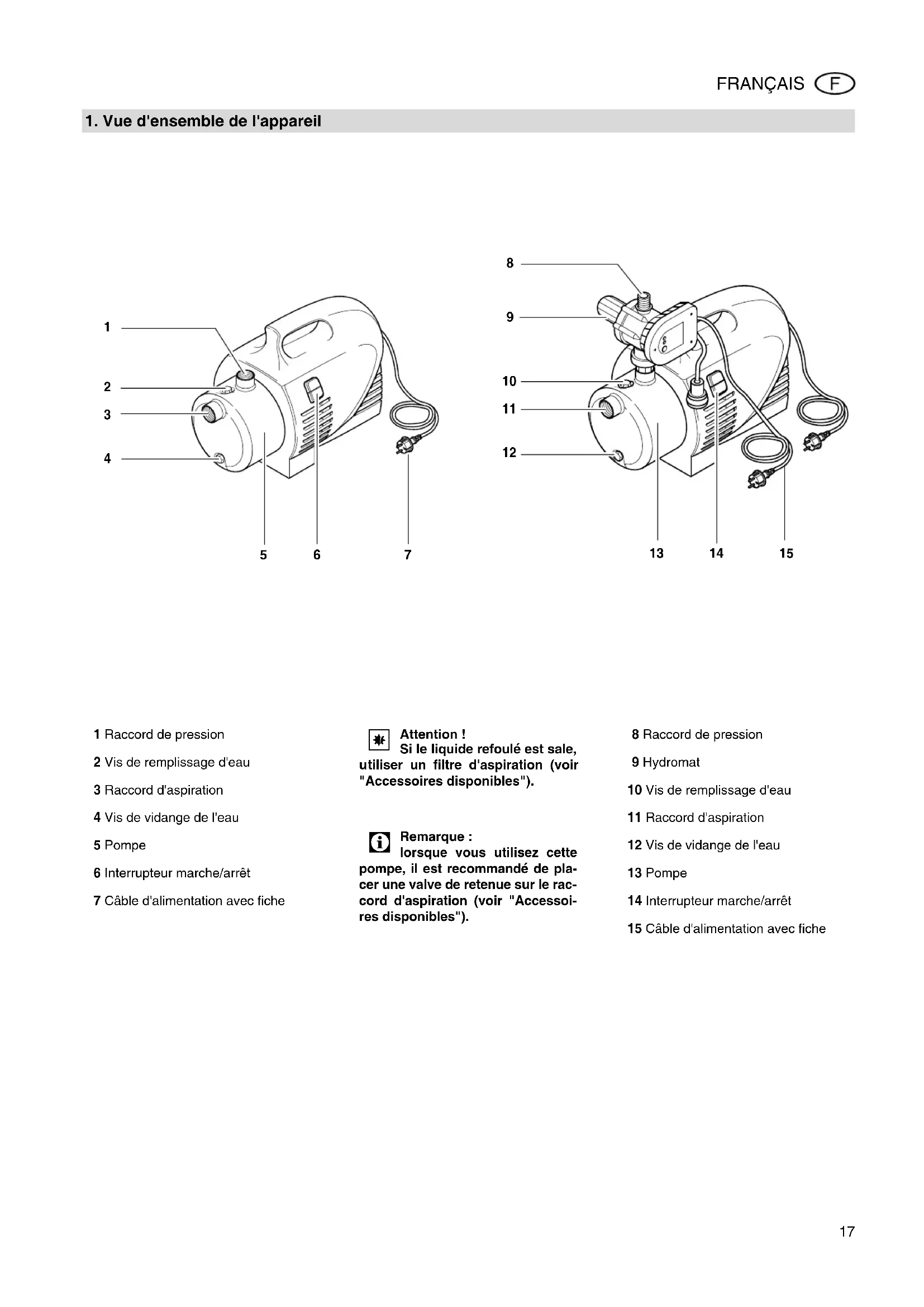 mpe, il est recommandé de pla- cer une valve de retenue sur le rac- cord d'aspiration (voir "Accessoi- res disponibles"). 8 Raccord de pression 9 Hydromat 10 Vis de remplissage d'eau 11 Raccord d'aspiration 12 Vis de vidange de l'eau 13 Pompe 14 Interrupteur marche/arrêt 15 Câble d'alimentation avec fiche XP0029F2.fm Instructions d'utilisation FRANÇAIS18 FRANÇAIS