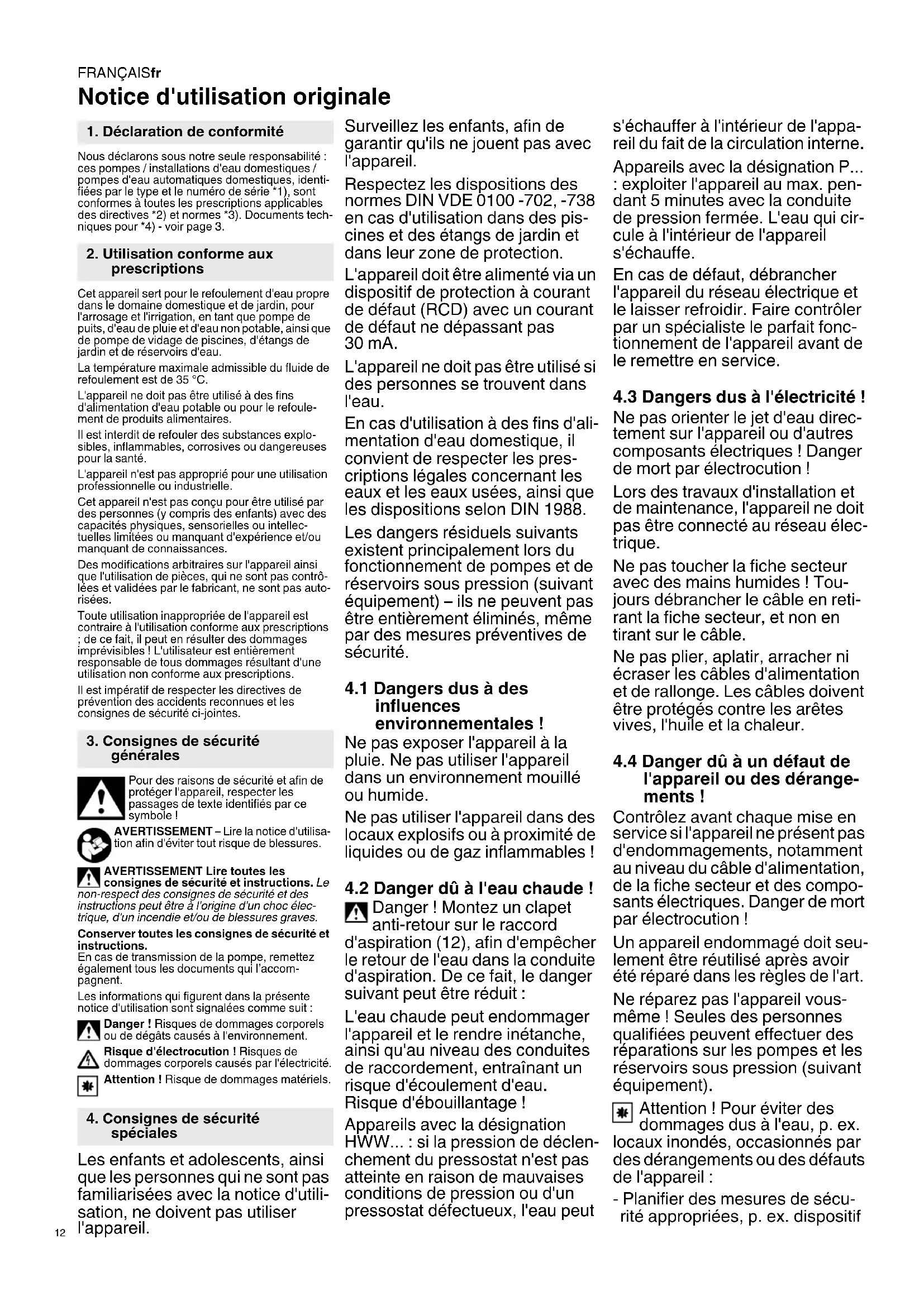 Notice d'utilisation originale Nous déclarons sous notre seule responsabilité : ces pompes / installations d'eau domestiques / pompes d'eau automatiques domestiques, identi- fiées par le type et le numéro de série *1), sont conformes à toutes les prescriptions applicables des directives *2) et normes *3). Documents tech- niques pour *4) - voir page 3. Cet appareil sert pour le refoulement d'eau propre dans le domaine domestique et de jardin, pour l'arrosage et l'irrigation, en tant que pompe de puits, d'eau de pluie et d'eau non potable, ainsi que de pompe de vidage de piscines, d'étangs de jardin et de réservoirs d'eau. La température maximale admissible du fluide de refoulement est de 35 °C. L'appareil ne doit pas être utilisé à des fins d'alimentation d'eau potable ou pour le refoule- ment de produits alimentaires. Il est interdit de refouler des substances explo- sibles, inflammables, corrosives ou dangereuses pour la santé. L'appareil n'est pas approprié pour une utilisation professionnelle ou industrielle. Cet appareil n'est pas conçu pour être utilisé par des personnes (y compris des enfants) avec des capacités physiques, sensorielles ou intellec- tuelles limitées ou manquant d'expérience et/ou manquant de connaissances. Des modifications arbitraires sur l'appareil ainsi que l'utilisation de pièces, qui ne sont pas contrô- lées et validées par le fabricant, ne sont pas auto- risées. Toute utilisation inappropriée de l'appareil est contraire à l'utilisation conforme aux prescriptions ; de ce fait, il peut en résulter des dommages imprévisibles ! L'utilisateur est entièrement responsable de tous dommages résultant d'une utilisation non conforme aux prescriptions. Il est impératif de respecter les directives de prévention des accidents reconnues et les consignes de sécurité ci-jointes. Pour des raisons de sécurité et afin de protéger l'appareil, respecter les passages de texte identifiés par ce symbole ! AVERTISSEMENT – Lire la notice d'utilisa- tion afin d'éviter tout risque de blessures. AVERTISSEMENT Lire toutes les consignes de sécurité et instructions. Le non-respect des consignes de sécurité et des instructions peut être à l'origine d'un choc élec- trique, d'un incendie et/ou de blessures graves. Conserver toutes les consignes de sécurité et instructions. En cas de transmission de la pompe, remettez également tous les documents qui l’accom- pagnent. Les informations qui figurent dans la présente notice d'utilisation sont signalées comme suit : Danger ! Risques de dommages corporels ou de dégâts causés à l'environnement. Risque d'électrocution ! Risques de dommages corporels causés par l'électricité. Attention ! Risque de dommages matériels. Les enfants et adolescents, ainsi que les personnes qui ne sont pas familiarisées avec la notice d'utili- sation, ne doivent pas utiliser l'appareil. Surveillez les enfants, afin de garantir qu'ils ne jouent pas avec l'appareil. Respectez les dispositions des normes DIN VDE 0100 -702, -738 en cas d'utilisation dans des pis- cines et des étangs de jardin et dans leur zone de protection. L'appareil doit être alimenté via un dispositif de protection à courant de défaut (RCD) avec un courant de défaut ne dépassant pas 30 mA. L'appareil ne doit pas être utilisé si des personnes se trouvent dans l'eau. En cas d'utilisation à des fins d'ali- mentation d'eau domestique, il convient de respecter les pres- criptions légales concernant les eaux et les eaux usées, ainsi que les dispositions selon DIN 1988. Les dangers résiduels suivants existent principalement lors du fonctionnement de pompes et de réservoirs sous pression (suivant équipement) – ils ne peuvent pas être entièrement éliminés, même par des mesures préventives de sécurité.