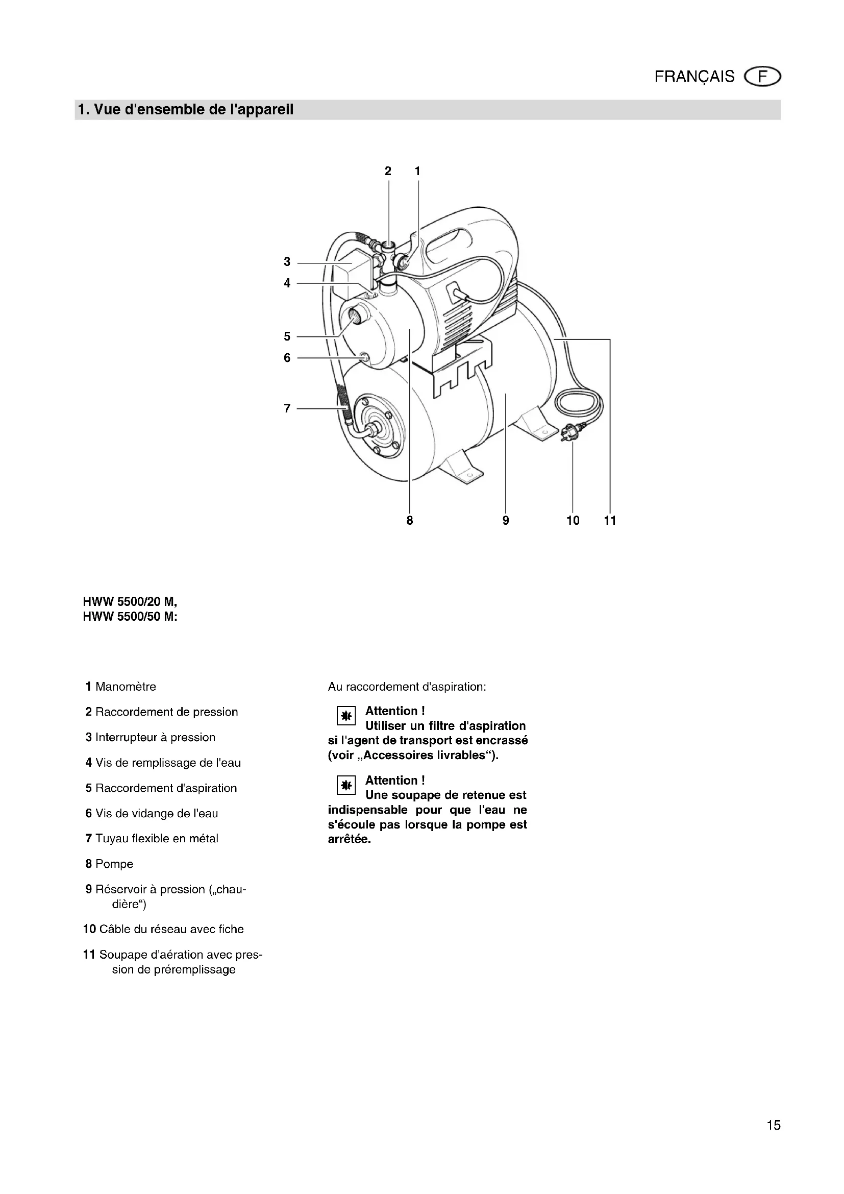 HWW 5500/20 M, HWW 5500/50 M: 1 Manomètre 2 Raccordement de pression 3 Interrupteur à pression 4 Vis de remplissage de l'eau 5 Raccordement d'aspiration 6 Vis de vidange de l'eau 7 Tuyau flexible en métal 8 Pompe 9 Réservoir à pression („chau- dière“) 10 Câble du réseau avec fiche 11 Soupape d'aération avec pres- sion de préremplissage Au raccordement d'aspiration: