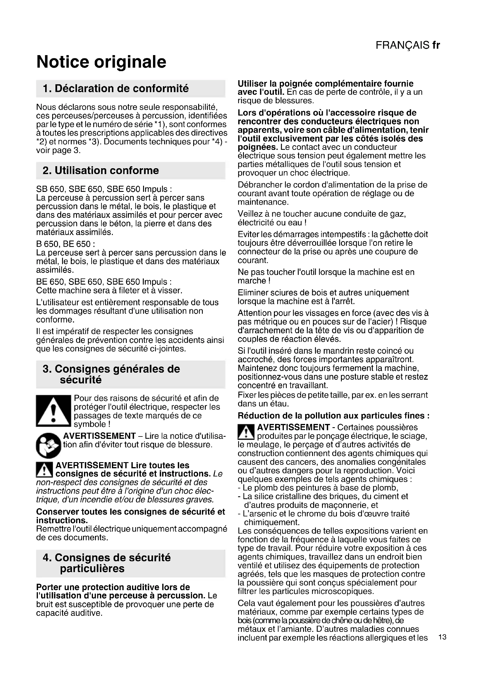 Notice originale Nous déclarons sous notre seule responsabilité, ces perceuses/perceuses à percussion, identifiées par le type et le numéro de série *1), sont conformes à toutes les prescriptions applicables des directives *2) et normes *3). Documents techniques pour *4) - voir page 3. SB 650, SBE 650, SBE 650 Impuls : La perceuse à percussion sert à percer sans percussion dans le métal, le bois, le plastique et dans des matériaux assimilés et pour percer avec percussion dans le béton, la pierre et dans des matériaux assimilés. B 650, BE 650 : La perceuse sert à percer sans percussion dans le métal, le bois, le plastique et dans des matériaux assimilés. BE 650, SBE 650, SBE 650 Impuls : Cette machine sera à fileter et à visser. L'utilisateur est entièrement responsable de tous les dommages résultant d'une utilisation non conforme. Il est impératif de respecter les consignes générales de prévention contre les accidents ainsi que les consignes de sécurité ci-jointes. Pour des raisons de sécurité et afin de protéger l'outil électrique, respecter les passages de texte marqués de ce symbole ! AVERTISSEMENT – Lire la notice d'utilisa- tion afin d'éviter tout risque de blessure. AVERTISSEMENT Lire toutes les consignes de sécurité et instructions. Le non-respect des consignes de sécurité et des instructions peut être à l'origine d'un choc élec- trique, d'un incendie et/ou de blessures graves. Conserver toutes les consignes de sécurité et instructions. Remettre l'outil électrique uniquement accompagné de ces documents. Porter une protection auditive lors de l'utilisation d'une perceuse à percussion. Le bruit est susceptible de provoquer une perte de capacité auditive. Utiliser la poignée complémentaire fournie avec l'outil. En cas de perte de contrôle, il y a un risque de blessures. Lors d'opérations où l'accessoire risque de rencontrer des conducteurs électriques non apparents, voire son câble d'alimentation, tenir l'outil exclusivement par les côtés isolés des poignées. Le contact avec un conducteur électrique sous tension peut également mettre les parties métalliques de l'outil sous tension et provoquer un choc électrique. Débrancher le cordon d'alimentation de la prise de courant avant toute opération de réglage ou de maintenance. Veillez à ne toucher aucune conduite de gaz, électricité ou eau ! Eviter les démarrages intempestifs : la gâchette doit toujours être déverrouillée lorsque l'on retire le connecteur de la prise ou après une coupure de courant. Ne pas toucher l'outil lorsque la machine est en marche ! Eliminer sciures de bois et autres uniquement lorsque la machine est à l'arrêt. Attention pour les vissages en force (avec des vis à pas métrique ou en pouces sur de l'acier) ! Risque d'arrachement de la tête de vis ou d'apparition de couples de réaction élevés. Si l'outil inséré dans le mandrin reste coincé ou accroché, des forces importantes apparaîtront. Maintenez donc toujours fermement la machine, positionnez-vous dans une posture stable et restez concentré en travaillant. Fixer les pièces de petite taille, par ex. en les serrant dans un étau. Réduction de la pollution aux particules fines : AVERTISSEMENT - Certaines poussières produites par le ponçage électrique, le sciage, le meulage, le perçage et d’autres activités de construction contiennent des agents chimiques qui causent des cancers, des anomalies congénitales ou d’autres dangers pour la reproduction. Voici quelques exemples de tels agents chimiques : - Le plomb des peintures à base de plomb, - La silice cristalline des briques, du ciment et d’autres produits de maçonnerie, et - L’arsenic et le chrome du bois d'œuvre traité chimiquement. Les conséquences de telles expositions varient en fonction de la fréquence à laquelle vous faites ce type de travail. Pour réduire votre exposition à ces agents chimiques, travaillez dans un endroit bien ventilé et utilisez des équipements de protection agréés, tels que les masques de protection contre la poussière qui sont conçus spécialement pour filtrer les particules microscopiques. Cela vaut également pour les poussières d’autres matériaux, comme par exemple certains types de bois (comme la poussière de chêne ou de hêtre), de métaux et l’amiante. D’autres maladies connues incluent par exemple les réactions allergiques et les