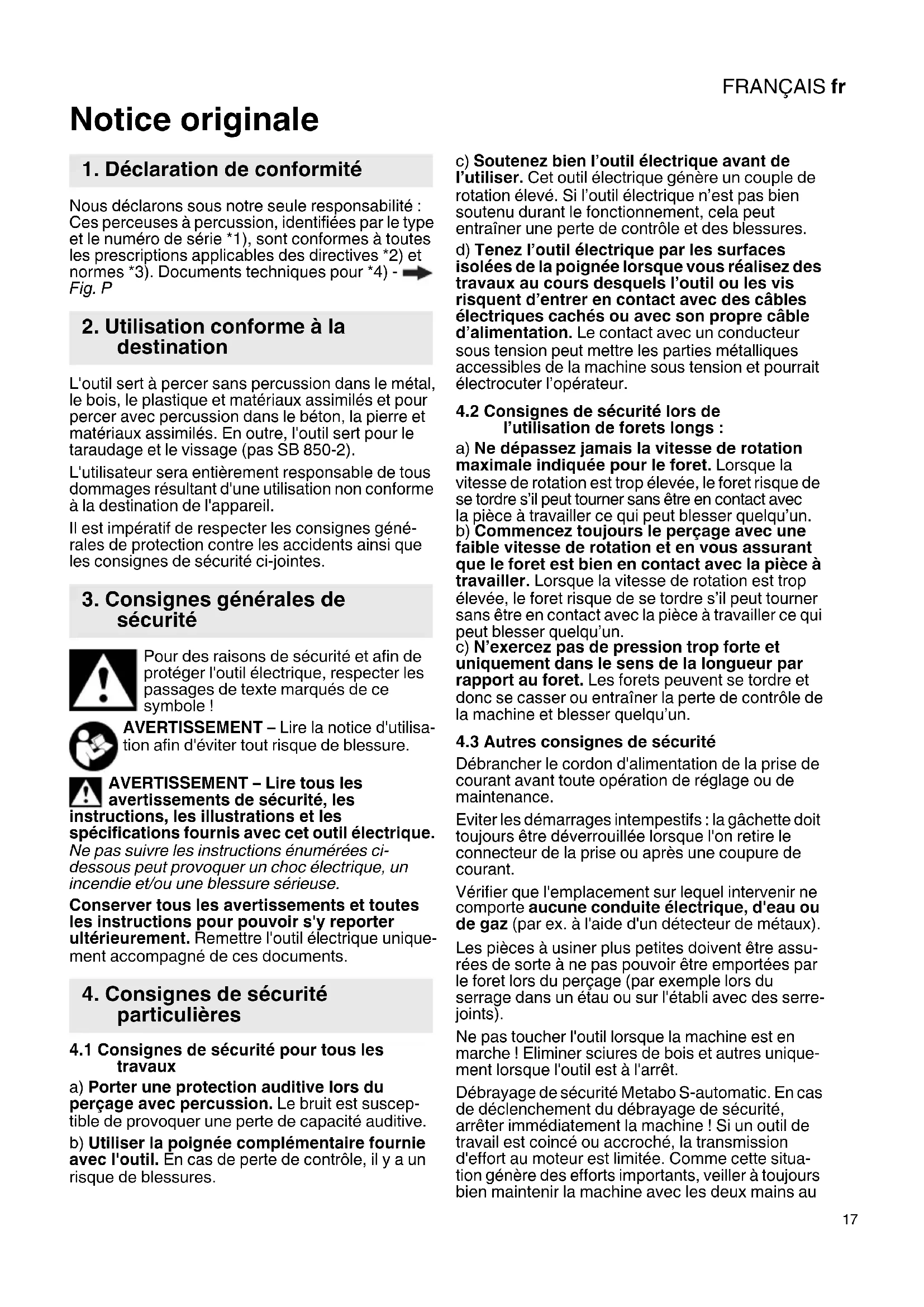 ig. P L'outil sert à percer sans percussion dans le métal, le bois, le plastique et matériaux assimilés et pour percer avec percussion dans le béton, la pierre et matériaux assimilés. En outre, l'outil sert pour le taraudage et le vissage (pas SB 850-2). L'utilisateur sera entièrement responsable de tous dommages résultant d'une utilisation non conforme à la destination de l'appareil. Il est impératif de respecter les consignes géné- rales de protection contre les accidents ainsi que les consignes de sécurité ci-jointes. Pour des raisons de sécurité et afin de protéger l'outil électrique, respecter les passages de texte marqués de ce symbole ! AVERTISSEMENT – Lire la notice d'utilisa- tion afin d'éviter tout risque de blessure. AVERTISSEMENT – Lire tous les avertissements de sécurité, les instructions, les illustrations et les spécifications fournis avec cet outil électrique. Ne pas suivre les instructions énumérées ci- dessous peut provoquer un choc électrique, un incendie et/ou une blessure sérieuse. Conserver tous les avertissements et toutes les instructions pour pouvoir s'y reporter ultérieurement. Remettre l'outil électrique unique- ment accompagné de ces documents.