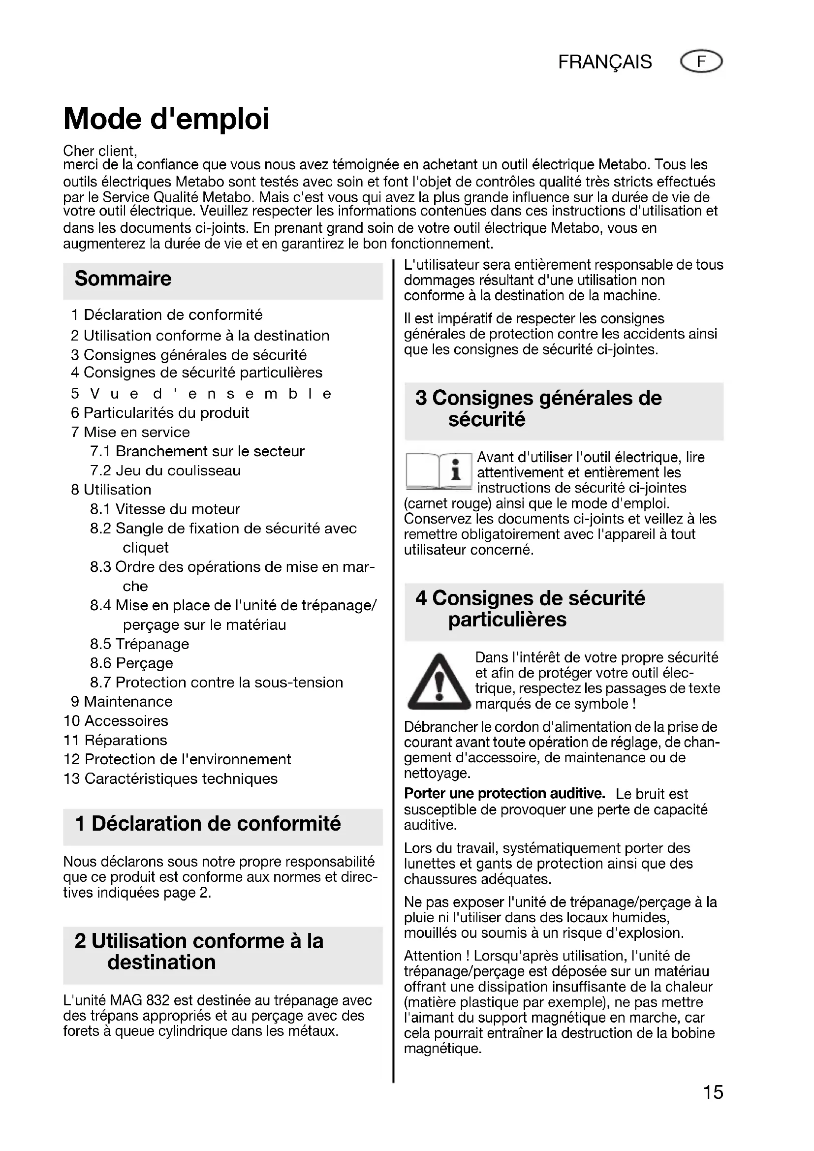 9 Maintenance 10 Accessoires 11 Réparations 12 Protection de l'environnement 13 Caractéristiques techniques Nous déclarons sous notre propre responsabilité que ce produit est conforme aux normes et direc- tives indiquées page 2. L'unité MAG 832 est destinée au trépanage avec des trépans appropriés et au perçage avec des forets à queue cylindrique dans les métaux. L'utilisateur sera entièrement responsable de tous dommages résultant d'une utilisation non conforme à la destination de la machine. Il est impératif de respecter les consignes générales de protection contre les accidents ainsi que les consignes de sécurité ci-jointes. Avant d'utiliser l'outil électrique, lire attentivement et entièrement les instructions de sécurité ci-jointes (carnet rouge) ainsi que le mode d'emploi. Conservez les documents ci-joints et veillez à les remettre obligatoirement avec l'appareil à tout utilisateur concerné. Dans l'intérêt de votre propre sécurité et afin de protéger votre outil élec- trique, respectez les passages de texte marqués de ce symbole ! Débrancher le cordon d'alimentation de la prise de courant avant toute opération de réglage, de chan- gement d'accessoire, de maintenance ou de nettoyage. Porter une protection auditive. Le bruit est susceptible de provoquer une perte de capacité auditive. Lors du travail, systématiquement porter des lunettes et gants de protection ainsi que des chaussures adéquates. Ne pas exposer l'unité de trépanage/perçage à la pluie ni l'utiliser dans des locaux humides, mouillés ou soumis à un risque d'explosion. Attention ! Lorsqu'après utilisation, l'unité de trépanage/perçage est déposée sur un matériau offrant une dissipation insuffisante de la chaleur (matière plastique par exemple), ne pas mettre l'aimant du support magnétique en marche, car cela pourrait entraîner la destruction de la bobine magnétique. Mode d'emploi Cher client, merci de la confiance que vous nous avez témoignée en achetant un outil électrique Metabo. Tous les outils électriques Metabo sont testés avec soin et font l'objet de contrôles qualité très stricts effectués par le Service Qualité Metabo. Mais c'est vous qui avez la plus grande influence sur la durée de vie de votre outil électrique. Veuillez respecter les informations contenues dans ces instructions d'utilisation et dans les documents ci-joints. En prenant grand soin de votre outil électrique Metabo, vous en augmenterez la durée de vie et en garantirez le bon fonctionnement. Sommaire 1 Déclaration de conformité 2 Utilisation conforme à la destination 3 Consignes générales de sécurité 4 Consignes de sécurité particulières 170 22 3900 - MAG.book Seite 15 Donnerstag, 27. Oktober 2005 11:39 1116 FRANÇAIS
