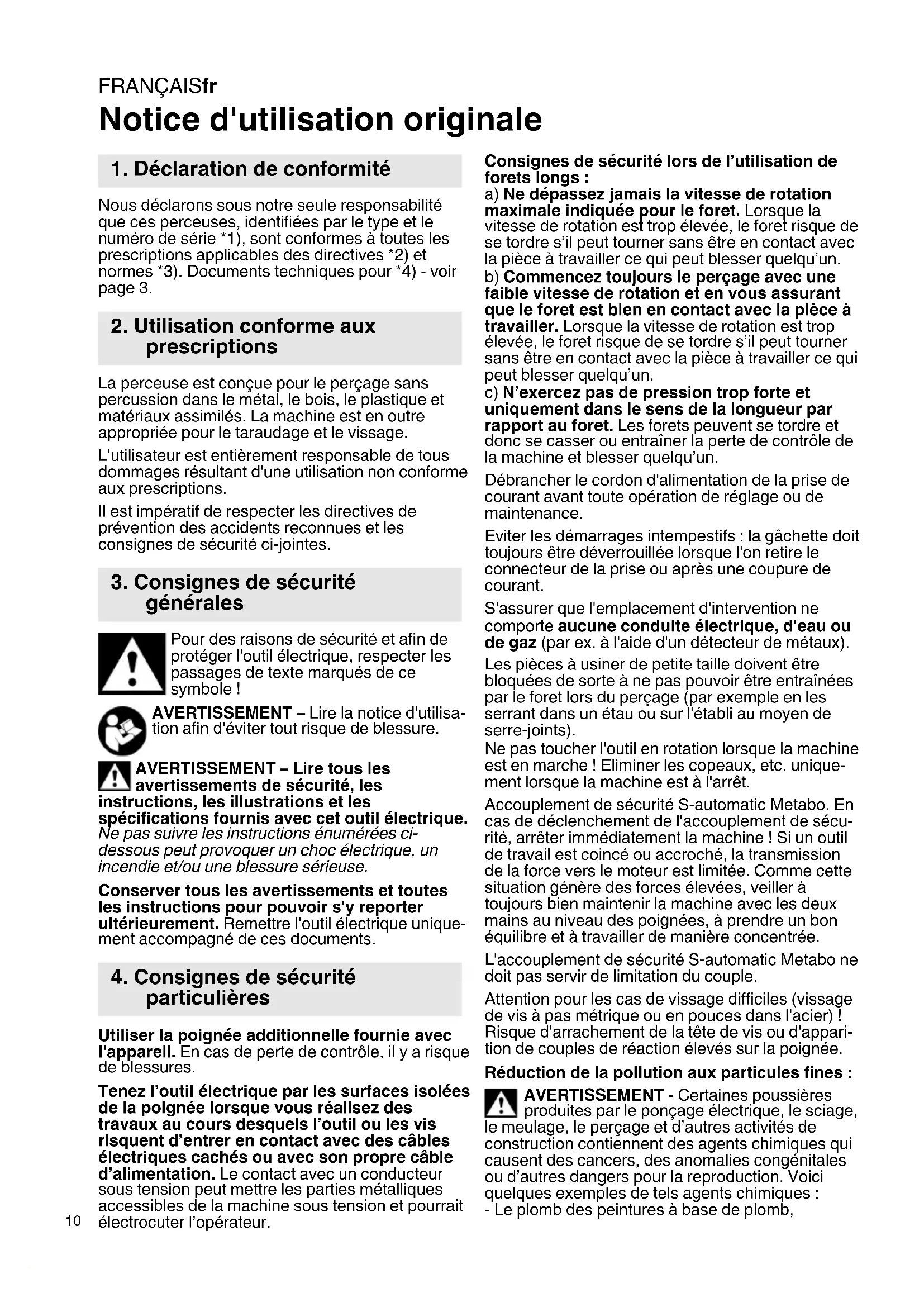 Notice d'utilisation originale Nous déclarons sous notre seule responsabilité que ces perceuses, identifiées par le type et le numéro de série *1), sont conformes à toutes les prescriptions applicables des directives *2) et normes *3). Documents techniques pour *4) - voir page 3. La perceuse est conçue pour le perçage sans percussion dans le métal, le bois, le plastique et matériaux assimilés. La machine est en outre appropriée pour le taraudage et le vissage. L'utilisateur est entièrement responsable de tous dommages résultant d'une utilisation non conforme aux prescriptions. Il est impératif de respecter les directives de prévention des accidents reconnues et les consignes de sécurité ci-jointes. Pour des raisons de sécurité et afin de protéger l'outil électrique, respecter les passages de texte marqués de ce symbole ! AVERTISSEMENT – Lire la notice d'utilisa- tion afin d'éviter tout risque de blessure. AVERTISSEMENT – Lire tous les avertissements de sécurité, les instructions, les illustrations et les spécifications fournis avec cet outil électrique. Ne pas suivre les instructions énumérées ci- dessous peut provoquer un choc électrique, un incendie et/ou une blessure sérieuse. Conserver tous les avertissements et toutes les instructions pour pouvoir s'y reporter ultérieurement. Remettre l'outil électrique unique- ment accompagné de ces documents. Utiliser la poignée additionnelle fournie avec l'appareil. En cas de perte de contrôle, il y a risque de blessures. Tenez l’outil électrique par les surfaces isolées de la poignée lorsque vous réalisez des travaux au cours desquels l’outil ou les vis risquent d’entrer en contact avec des câbles électriques cachés ou avec son propre câble d’alimentation. Le contact avec un conducteur sous tension peut mettre les parties métalliques accessibles de la machine sous tension et pourrait électrocuter l’opérateur. Consignes de sécurité lors de l’utilisation de forets longs : a) Ne dépassez jamais la vitesse de rotation maximale indiquée pour le foret. Lorsque la vitesse de rotation est trop élevée, le foret risque de se tordre s’il peut tourner sans être en contact avec la pièce à travailler ce qui peut blesser quelqu’un. b) Commencez toujours le perçage avec une faible vitesse de rotation et en vous assurant que le foret est bien en contact avec la pièce à travailler. Lorsque la vitesse de rotation est trop élevée, le foret risque de se tordre s’il peut tourner sans être en contact avec la pièce à travailler ce qui peut blesser quelqu’un. c) N’exercez pas de pression trop forte et uniquement dans le sens de la longueur par rapport au foret. Les forets peuvent se tordre et donc se casser ou entraîner la perte de contrôle de la machine et blesser quelqu’un. Débrancher le cordon d'alimentation de la prise de courant avant toute opération de réglage ou de maintenance. Eviter les démarrages intempestifs : la gâchette doit toujours être déverrouillée lorsque l'on retire le connecteur de la prise ou après une coupure de courant. S'assurer que l'emplacement d'intervention ne comporte aucune conduite électrique, d'eau ou de gaz (par ex. à l'aide d'un détecteur de métaux). Les pièces à usiner de petite taille doivent être bloquées de sorte à ne pas pouvoir être entraînées par le foret lors du perçage (par exemple en les serrant dans un étau ou sur l'établi au moyen de serre-joints). Ne pas toucher l'outil en rotation lorsque la machine est en marche ! Eliminer les copeaux, etc. unique- ment lorsque la machine est à l'arrêt. Accouplement de sécurité S-automatic Metabo. En cas de déclenchement de l'accouplement de sécu- rité, arrêter immédiatement la machine ! Si un outil de travail est coincé ou accroché, la transmission de la force vers le moteur est limitée. Comme cette situation génère des forces élevées, veiller à toujours bien maintenir la machine avec les deux mains au niveau des poignées, à prendre un bon équilibre et à travailler de manière concentrée. L'accouplement de sécurité S-automatic Metabo ne doit pas servir de limitation du couple. Attention pour les cas de vissage difficiles (vissage de vis à pas métrique ou en pouces dans l'acier) ! Risque d'arrachement de la tête de vis ou d'appari- tion de couples de réaction élevés sur la poignée. Réduction de la pollution aux particules fines : AVERTISSEMENT - Certaines poussières produites par le ponçage électrique, le sciage, le meulage, le perçage et d’autres activités de construction contiennent des agents chimiques qui causent des cancers, des anomalies congénitales ou d’autres dangers pour la reproduction. Voici quelques exemples de tels agents chimiques : - Le plomb des peintures à base de plomb,