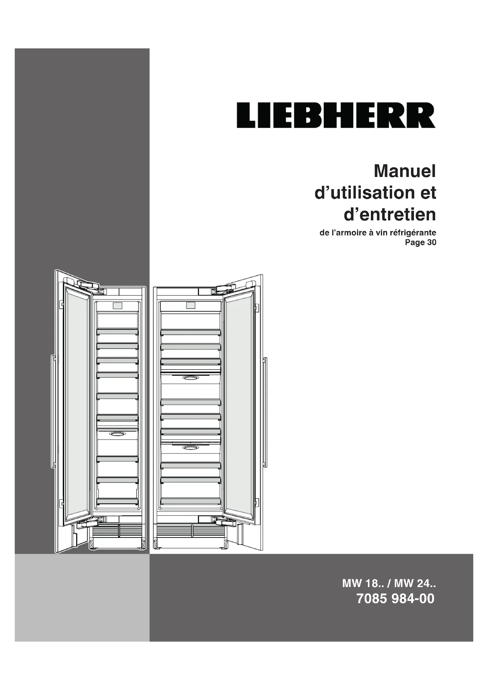 echerche des pannes Service clientèle Si aucune des causes possibles ci-dessus ne s’ap-plique et que vous ne pouvez pas rectifier vous-même le problème, rejoignez le représentant du service clien-tèle le plus proche.Indiquer le type (1) d’appareil, le numéro de service (2) et le numéro d’appareil/série (3), indiqué sur la plaque du modèle ou dans les informations sur l’appa-reil du menu configura-tion du système de commande électronique.L’emplacement de la plaque du modèle gure dans le chapitre Description de l’appareil. Information de l’appareil Conserver cette information au moment de l’installation de l’appareil.Désignation du type: ___________________________Numéro de service: ___________________________Numéro de l’appareil/série: ______________________Date d’achat: _________________________________Lieu d’achat: _________________________________ Problème Cause possible et solution L’appareil ne fonctionne pas, l’affichage est éteint.- L’appareil a-t-il été correctement mis en marche? - La fiche du cordon d’alimentation est-elle correctement enfichée? - Le disjoncteur ou le fusible est-il en bon état de fonctionnement?L’éclairage intérieur ne s’allume pas.- L’appareil est-il en marche?Le moteur semblefonctionner trop long-temps.- La température ambiante est-elle trop élevée? Voir Contraintes de sécurité.- L’appareil a-t-il été ouvert trop souvent ou est-il resté ouvert trop longtemps?La température n’est pas assez basse.- Le réglage de la température est-il correct? Voir Réglage de la température.- Trop de bouteilles de vin ont-elles été placées dans l’appareil?- Le thermomètre installé séparément indique-t-il la température correcte?- La ventilation de l’appareil fonctionne-t-elle correctement?- L’appareil est-il installé à proximité d’une source de chaleur?Les ventilateurs situés à l’intérieur de l’appareil fonctionnent bien que la fonction ventilateur soit désactivée et le compresseur (groupe frigorifique) arrêté. - Il s’agit d’un fonctionnement normal en fonction de la température intérieure réglée et de la température ambiante du lieu d’installation. Recherche des pannes Si un problème survient en cours d’utilisation, vérifiez s’il est dû à une erreur d’utilisation. Il est important de noter que même pendant la période de garantie, certains coûts de réparation peuvent être imputés au propriétaire.Vous serez peut-être en mesure de remédier aux pannes suivantes en vérifiant vous-même les causes possibles.For Service in the U.S. Liebherr Service Center Toll Free: 1-866-LIEBHER or 1-866-543-2437 Email: Service-appliances.us@liebherr.com PlusOne Solutions, Inc. 3501 Quadrangle Blvd, Suite 120 Orlando, FL 32817 For Service in Canada Liebherr Service Center Toll Free: 1-888-LIEBHER or 1-888-543-2437 www.euro-parts.ca EURO-PARTS CANADA 39822 Belgrave Road Belgrave, Ontario, N0G 1E0 Phone: (519) 357-3320 Fax: (519) 357-1326 www.liebherr-appliances.com *708598400*
