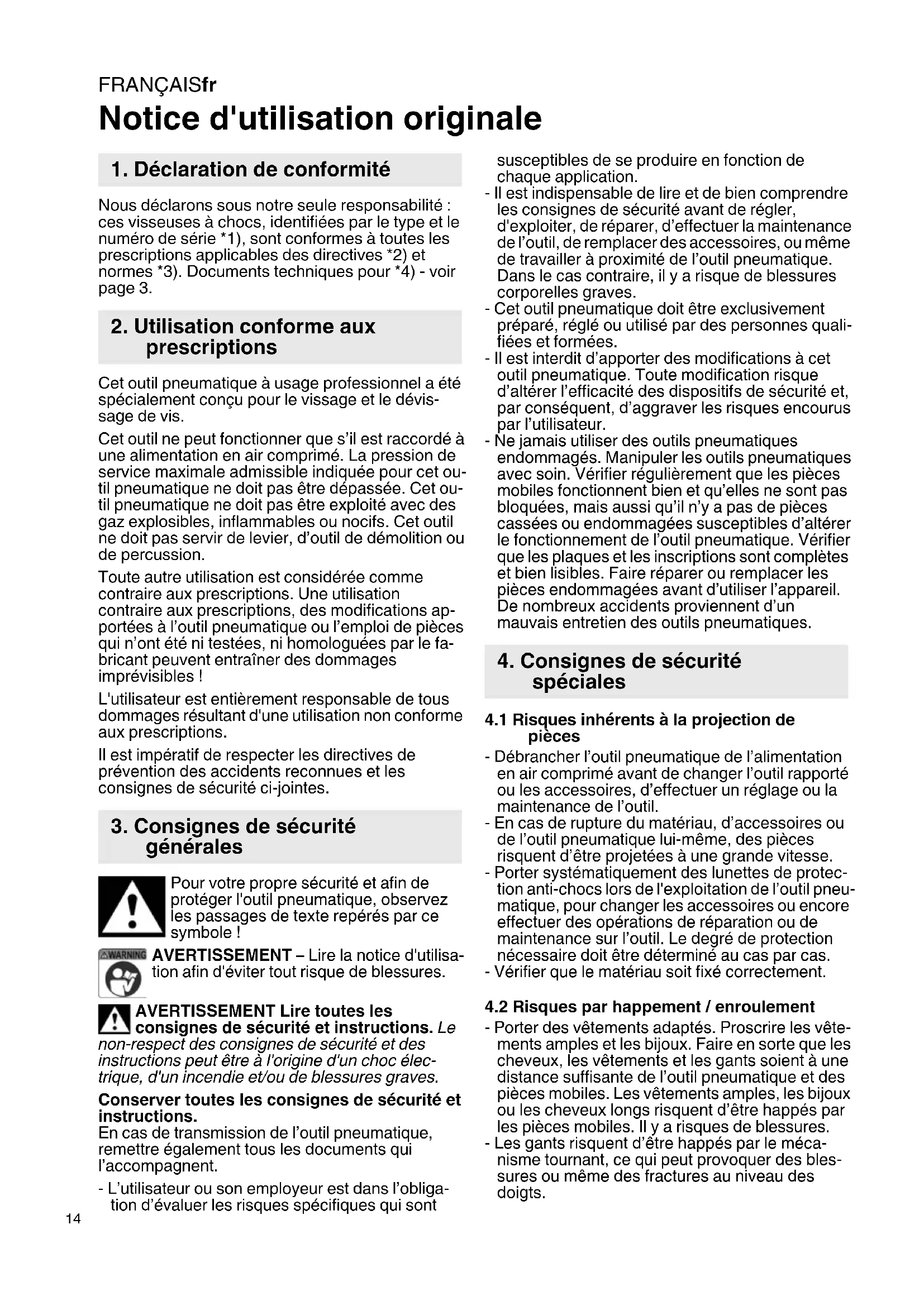 Notice d'utilisation originale Nous déclarons sous notre seule responsabilité : ces visseuses à chocs, identifiées par le type et le numéro de série *1), sont conformes à toutes les prescriptions applicables des directives *2) et normes *3). Documents techniques pour *4) - voir page 3. Cet outil pneumatique à usage professionnel a été spécialement conçu pour le vissage et le dévis- sage de vis. Cet outil ne peut fonctionner que s’il est raccordé à une alimentation en air comprimé. La pression de service maximale admissible indiquée pour cet ou- til pneumatique ne doit pas être dépassée. Cet ou- til pneumatique ne doit pas être exploité avec des gaz explosibles, inflammables ou nocifs. Cet outil ne doit pas servir de levier, d’outil de démolition ou de percussion. Toute autre utilisation est considérée comme contraire aux prescriptions. Une utilisation contraire aux prescriptions, des modifications ap- portées à l’outil pneumatique ou l’emploi de pièces qui n’ont été ni testées, ni homologuées par le fa- bricant peuvent entraîner des dommages imprévisibles ! L'utilisateur est entièrement responsable de tous dommages résultant d'une utilisation non conforme aux prescriptions. Il est impératif de respecter les directives de prévention des accidents reconnues et les consignes de sécurité ci-jointes. Pour votre propre sécurité et afin de protéger l'outil pneumatique, observez les passages de texte repérés par ce symbole ! AVERTISSEMENT – Lire la notice d'utilisa- tion afin d'éviter tout risque de blessures. AVERTISSEMENT Lire toutes les consignes de sécurité et instructions. Le non-respect des consignes de sécurité et des instructions peut être à l'origine d'un choc élec- trique, d'un incendie et/ou de blessures graves. Conserver toutes les consignes de sécurité et instructions. En cas de transmission de l’outil pneumatique, remettre également tous les documents qui l’accompagnent. - L’utilisateur ou son employeur est dans l’obliga- tion d’évaluer les risques spécifiques qui sont susceptibles de se produire en fonction de chaque application. - Il est indispensable de lire et de bien comprendre les consignes de sécurité avant de régler, d'exploiter, de réparer, d’effectuer la maintenance de l’outil, de remplacer des accessoires, ou même de travailler à proximité de l’outil pneumatique. Dans le cas contraire, il y a risque de blessures corporelles graves. - Cet outil pneumatique doit être exclusivement préparé, réglé ou utilisé par des personnes quali- fiées et formées. - Il est interdit d’apporter des modifications à cet outil pneumatique. Toute modification risque d’altérer l’efficacité des dispositifs de sécurité et, par conséquent, d’aggraver les risques encourus par l’utilisateur. - Ne jamais utiliser des outils pneumatiques endommagés. Manipuler les outils pneumatiques avec soin. Vérifier régulièrement que les pièces mobiles fonctionnent bien et qu’elles ne sont pas bloquées, mais aussi qu’il n’y a pas de pièces cassées ou endommagées susceptibles d’altérer le fonctionnement de l’outil pneumatique. Vérifier que les plaques et les inscriptions sont complètes et bien lisibles. Faire réparer ou remplacer les pièces endommagées avant d’utiliser l’appareil. De nombreux accidents proviennent d’un mauvais entretien des outils pneumatiques.