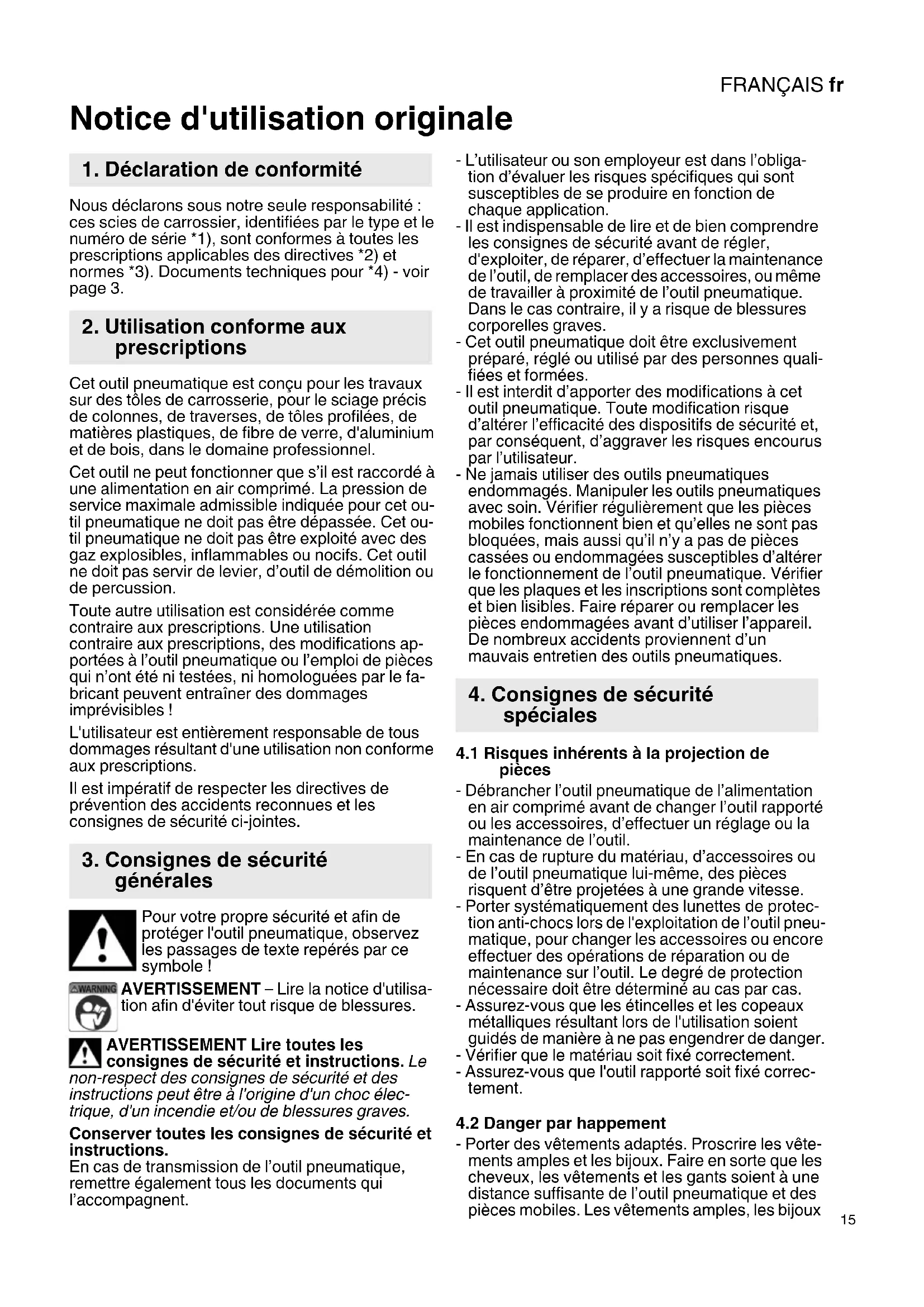 Notice d'utilisation originale Nous déclarons sous notre seule responsabilité : ces scies de carrossier, identifiées par le type et le numéro de série *1), sont conformes à toutes les prescriptions applicables des directives *2) et normes *3). Documents techniques pour *4) - voir page 3. Cet outil pneumatique est conçu pour les travaux sur des tôles de carrosserie, pour le sciage précis de colonnes, de traverses, de tôles profilées, de matières plastiques, de fibre de verre, d'aluminium et de bois, dans le domaine professionnel. Cet outil ne peut fonctionner que s’il est raccordé à une alimentation en air comprimé. La pression de service maximale admissible indiquée pour cet ou- til pneumatique ne doit pas être dépassée. Cet ou- til pneumatique ne doit pas être exploité avec des gaz explosibles, inflammables ou nocifs. Cet outil ne doit pas servir de levier, d’outil de démolition ou de percussion. Toute autre utilisation est considérée comme contraire aux prescriptions. Une utilisation contraire aux prescriptions, des modifications ap- portées à l’outil pneumatique ou l’emploi de pièces qui n’ont été ni testées, ni homologuées par le fa- bricant peuvent entraîner des dommages imprévisibles ! L'utilisateur est entièrement responsable de tous dommages résultant d'une utilisation non conforme aux prescriptions. Il est impératif de respecter les directives de prévention des accidents reconnues et les consignes de sécurité ci-jointes. Pour votre propre sécurité et afin de protéger l'outil pneumatique, observez les passages de texte repérés par ce symbole ! AVERTISSEMENT – Lire la notice d'utilisa- tion afin d'éviter tout risque de blessures. AVERTISSEMENT Lire toutes les consignes de sécurité et instructions. Le non-respect des consignes de sécurité et des instructions peut être à l'origine d'un choc élec- trique, d'un incendie et/ou de blessures graves. Conserver toutes les consignes de sécurité et instructions. En cas de transmission de l’outil pneumatique, remettre également tous les documents qui l’accompagnent. - L’utilisateur ou son employeur est dans l’obliga- tion d’évaluer les risques spécifiques qui sont susceptibles de se produire en fonction de chaque application. - Il est indispensable de lire et de bien comprendre les consignes de sécurité avant de régler, d'exploiter, de réparer, d’effectuer la maintenance de l’outil, de remplacer des accessoires, ou même de travailler à proximité de l’outil pneumatique. Dans le cas contraire, il y a risque de blessures corporelles graves. - Cet outil pneumatique doit être exclusivement préparé, réglé ou utilisé par des personnes quali- fiées et formées. - Il est interdit d’apporter des modifications à cet outil pneumatique. Toute modification risque d’altérer l’efficacité des dispositifs de sécurité et, par conséquent, d’aggraver les risques encourus par l’utilisateur. - Ne jamais utiliser des outils pneumatiques endommagés. Manipuler les outils pneumatiques avec soin. Vérifier régulièrement que les pièces mobiles fonctionnent bien et qu’elles ne sont pas bloquées, mais aussi qu’il n’y a pas de pièces cassées ou endommagées susceptibles d’altérer le fonctionnement de l’outil pneumatique. Vérifier que les plaques et les inscriptions sont complètes et bien lisibles. Faire réparer ou remplacer les pièces endommagées avant d’utiliser l’appareil. De nombreux accidents proviennent d’un mauvais entretien des outils pneumatiques.
