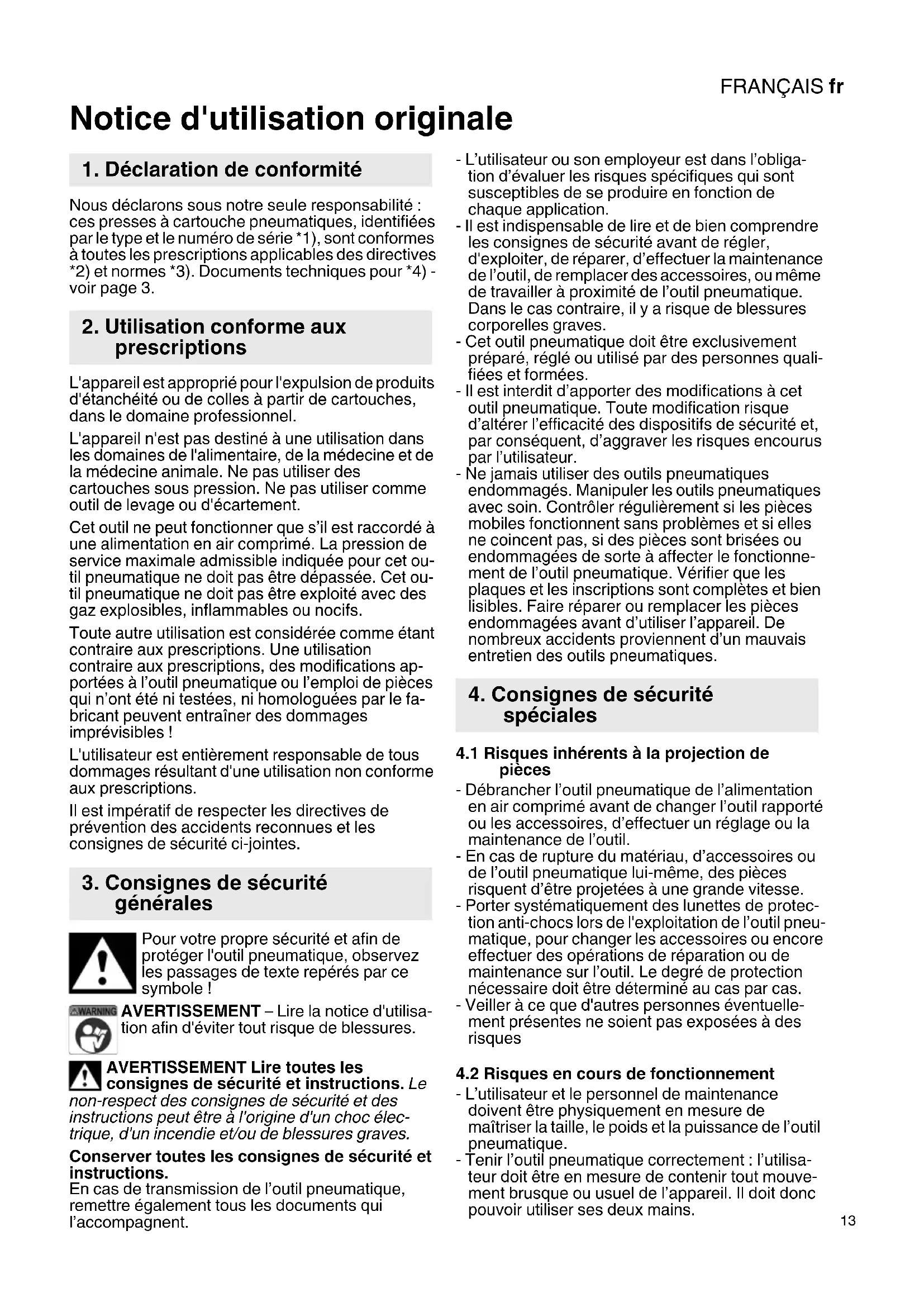 Notice d'utilisation originale Nous déclarons sous notre seule responsabilité : ces presses à cartouche pneumatiques, identifiées par le type et le numéro de série *1), sont conformes à toutes les prescriptions applicables des directives *2) et normes *3). Documents techniques pour *4) - voir page 3. L'appareil est approprié pour l'expulsion de produits d'étanchéité ou de colles à partir de cartouches, dans le domaine professionnel. L'appareil n'est pas destiné à une utilisation dans les domaines de l'alimentaire, de la médecine et de la médecine animale. Ne pas utiliser des cartouches sous pression. Ne pas utiliser comme outil de levage ou d'écartement. Cet outil ne peut fonctionner que s’il est raccordé à une alimentation en air comprimé. La pression de service maximale admissible indiquée pour cet ou- til pneumatique ne doit pas être dépassée. Cet ou- til pneumatique ne doit pas être exploité avec des gaz explosibles, inflammables ou nocifs. Toute autre utilisation est considérée comme étant contraire aux prescriptions. Une utilisation contraire aux prescriptions, des modifications ap- portées à l’outil pneumatique ou l’emploi de pièces qui n’ont été ni testées, ni homologuées par le fa- bricant peuvent entraîner des dommages imprévisibles ! L'utilisateur est entièrement responsable de tous dommages résultant d'une utilisation non conforme aux prescriptions. Il est impératif de respecter les directives de prévention des accidents reconnues et les consignes de sécurité ci-jointes. Pour votre propre sécurité et afin de protéger l'outil pneumatique, observez les passages de texte repérés par ce symbole ! AVERTISSEMENT – Lire la notice d'utilisa- tion afin d'éviter tout risque de blessures. AVERTISSEMENT Lire toutes les consignes de sécurité et instructions. Le non-respect des consignes de sécurité et des instructions peut être à l'origine d'un choc élec- trique, d'un incendie et/ou de blessures graves. Conserver toutes les consignes de sécurité et instructions. En cas de transmission de l’outil pneumatique, remettre également tous les documents qui l’accompagnent. - L’utilisateur ou son employeur est dans l’obliga- tion d’évaluer les risques spécifiques qui sont susceptibles de se produire en fonction de chaque application. - Il est indispensable de lire et de bien comprendre les consignes de sécurité avant de régler, d'exploiter, de réparer, d’effectuer la maintenance de l’outil, de remplacer des accessoires, ou même de travailler à proximité de l’outil pneumatique. Dans le cas contraire, il y a risque de blessures corporelles graves. - Cet outil pneumatique doit être exclusivement préparé, réglé ou utilisé par des personnes quali- fiées et formées. - Il est interdit d’apporter des modifications à cet outil pneumatique. Toute modification risque d’altérer l’efficacité des dispositifs de sécurité et, par conséquent, d’aggraver les risques encourus par l’utilisateur. - Ne jamais utiliser des outils pneumatiques endommagés. Manipuler les outils pneumatiques avec soin. Contrôler régulièrement si les pièces mobiles fonctionnent sans problèmes et si elles ne coincent pas, si des pièces sont brisées ou endommagées de sorte à affecter le fonctionne- ment de l’outil pneumatique. Vérifier que les plaques et les inscriptions sont complètes et bien lisibles. Faire réparer ou remplacer les pièces endommagées avant d’utiliser l’appareil. De nombreux accidents proviennent d’un mauvais entretien des outils pneumatiques.