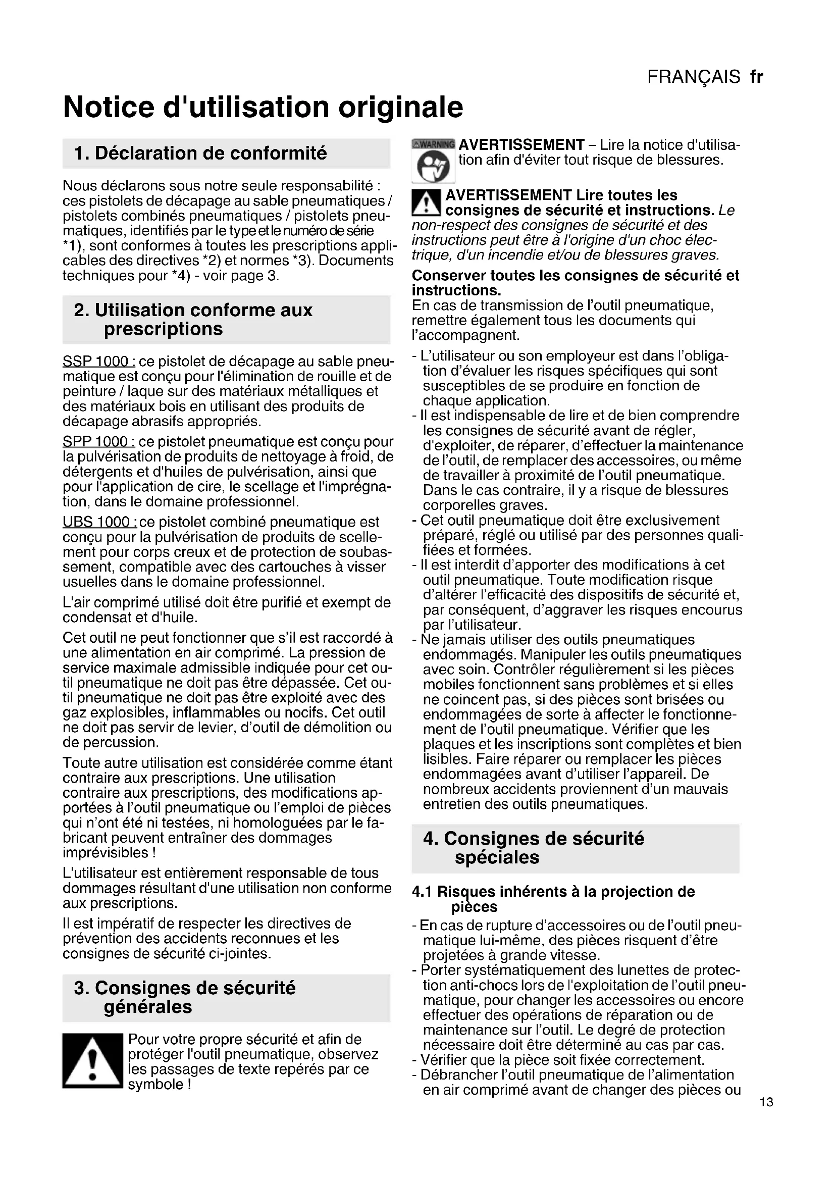 Notice d'utilisation originale Nous déclarons sous notre seule responsabilité : ces pistolets de décapage au sable pneumatiques / pistolets combinés pneumatiques / pistolets pneu- matiques, identifiés par le type et le numéro de série *1), sont conformes à toutes les prescriptions appli- cables des directives *2) et normes *3). Documents techniques pour *4) - voir page 3. SSP 1000 : ce pistolet de décapage au sable pneu- matique est conçu pour l'élimination de rouille et de peinture / laque sur des matériaux métalliques et des matériaux bois en utilisant des produits de décapage abrasifs appropriés. SPP 1000 : ce pistolet pneumatique est conçu pour la pulvérisation de produits de nettoyage à froid, de détergents et d'huiles de pulvérisation, ainsi que pour l'application de cire, le scellage et l'imprégna- tion, dans le domaine professionnel. UBS 1000 : ce pistolet combiné pneumatique est conçu pour la pulvérisation de produits de scelle- ment pour corps creux et de protection de soubas- sement, compatible avec des cartouches à visser usuelles dans le domaine professionnel. L'air comprimé utilisé doit être purifié et exempt de condensat et d'huile. Cet outil ne peut fonctionner que s’il est raccordé à une alimentation en air comprimé. La pression de service maximale admissible indiquée pour cet ou- til pneumatique ne doit pas être dépassée. Cet ou- til pneumatique ne doit pas être exploité avec des gaz explosibles, inflammables ou nocifs. Cet outil ne doit pas servir de levier, d’outil de démolition ou de percussion. Toute autre utilisation est considérée comme étant contraire aux prescriptions. Une utilisation contraire aux prescriptions, des modifications ap- portées à l’outil pneumatique ou l’emploi de pièces qui n’ont été ni testées, ni homologuées par le fa- bricant peuvent entraîner des dommages imprévisibles ! L'utilisateur est entièrement responsable de tous dommages résultant d'une utilisation non conforme aux prescriptions. Il est impératif de respecter les directives de prévention des accidents reconnues et les consignes de sécurité ci-jointes. Pour votre propre sécurité et afin de protéger l'outil pneumatique, observez les passages de texte repérés par ce symbole ! AVERTISSEMENT – Lire la notice d'utilisa- tion afin d'éviter tout risque de blessures. AVERTISSEMENT Lire toutes les consignes de sécurité et instructions. Le non-respect des consignes de sécurité et des instructions peut être à l'origine d'un choc élec- trique, d'un incendie et/ou de blessures graves. Conserver toutes les consignes de sécurité et instructions. En cas de transmission de l’outil pneumatique, remettre également tous les documents qui l’accompagnent. - L’utilisateur ou son employeur est dans l’obliga- tion d’évaluer les risques spécifiques qui sont susceptibles de se produire en fonction de chaque application. - Il est indispensable de lire et de bien comprendre les consignes de sécurité avant de régler, d'exploiter, de réparer, d’effectuer la maintenance de l’outil, de remplacer des accessoires, ou même de travailler à proximité de l’outil pneumatique. Dans le cas contraire, il y a risque de blessures corporelles graves. - Cet outil pneumatique doit être exclusivement préparé, réglé ou utilisé par des personnes quali- fiées et formées. - Il est interdit d’apporter des modifications à cet outil pneumatique. Toute modification risque d’altérer l’efficacité des dispositifs de sécurité et, par conséquent, d’aggraver les risques encourus par l’utilisateur. - Ne jamais utiliser des outils pneumatiques endommagés. Manipuler les outils pneumatiques avec soin. Contrôler régulièrement si les pièces mobiles fonctionnent sans problèmes et si elles ne coincent pas, si des pièces sont brisées ou endommagées de sorte à affecter le fonctionne- ment de l’outil pneumatique. Vérifier que les plaques et les inscriptions sont complètes et bien lisibles. Faire réparer ou remplacer les pièces endommagées avant d’utiliser l’appareil. De nombreux accidents proviennent d’un mauvais entretien des outils pneumatiques.
