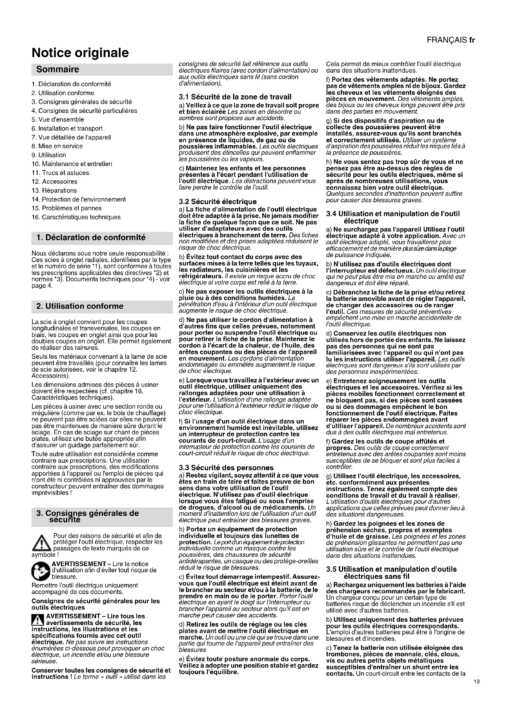 Nous déclarons sous notre seule responsabilité : Ces scies à onglet radiales, identifiées par le type et le numéro de série *1), sont conformes à toutes les prescriptions applicables des directives *2) et normes *3). Documents techniques pour *4) - voir page 4. La scie à onglet convient pour les coupes longitudinales et transversales, les coupes en biais, les coupes en onglet ainsi que pour les doubles coupes en onglet. Elle permet également de réaliser des rainures. Seuls les matériaux convenant à la lame de scie peuvent être travaillés (pour connaître les lames de scie autorisées, voir le chapitre 12. Accessoires). Les dimensions admises des pièces à usiner doivent être respectées (cf. chapitre 16. Caractéristiques techniques). Les pièces à usiner avec une section ronde ou irrégulière (comme par ex. le bois de chauffage) ne peuvent pas être sciées car elles ne peuvent pas être maintenues de manière sûre durant le sciage. En cas de sciage sur chant de pièces plates, utilisez une butée appropriée afin d'assurer un guidage parfaitement sûr. Toute autre utilisation est considérée comme contraire aux prescriptions. Une utilisation contraire aux prescriptions, des modifications apportées à l'appareil ou l'emploi de pièces qui n'ont été ni contrôlées ni approuvées par le constructeur peuvent entraîner des dommages imprévisibles ! Pour des raisons de sécurité et afin de protéger l'outil électrique, respecter les passages de texte marqués de ce symbole ! AVERTISSEMENT – Lire la notice d'utilisation afin d'éviter tout risque de blessure. Remettre l'outil électrique uniquement accompagné de ces documents. Consignes de sécurité générales pour les outils électriques AVERTISSEMENT – Lire tous les avertissements de sécurité, les instructions, les illustrations et les spécifications fournis avec cet outil électrique. Ne pas suivre les instructions énumérées ci-dessous peut provoquer un choc électrique, un incendie et/ou une blessure sérieuse. Conserver toutes les consignes de sécurité et instructions ! Le terme « outil » utilisé dans les consignes de sécurité fait référence aux outils électriques filaires (avec cordon d'alimentation) ou aux outils électriques sans fil (sans cordon d'alimentation).