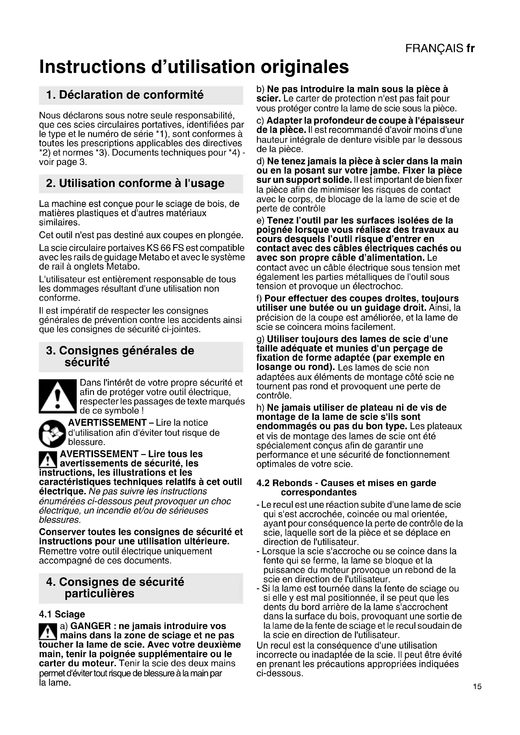 Instructions d’utilisation originales Nous déclarons sous notre seule responsabilité, que ces scies circulaires portatives, identifiées par le type et le numéro de série *1), sont conformes à toutes les prescriptions applicables des directives *2) et normes *3). Documents techniques pour *4) - voir page 3. La machine est conçue pour le sciage de bois, de matières plastiques et d'autres matériaux similaires. Cet outil n'est pas destiné aux coupes en plongée. La scie circulaire portaives KS 66 FS est compatible avec les rails de guidage Metabo et avec le système de rail à onglets Metabo. L'utilisateur est entièrement responsable de tous les dommages résultant d'une utilisation non conforme. Il est impératif de respecter les consignes générales de prévention contre les accidents ainsi que les consignes de sécurité ci-jointes. Dans l'intérêt de votre propre sécurité et afin de protéger votre outil électrique, respecter les passages de texte marqués de ce symbole ! AVERTISSEMENT – Lire la notice d'utilisation afin d'éviter tout risque de blessure. AVERTISSEMENT – Lire tous les avertissements de sécurité, les instructions, les illustrations et les caractéristiques techniques relatifs à cet outil électrique. Ne pas suivre les instructions énumérées ci-dessous peut provoquer un choc électrique, un incendie et/ou de sérieuses blessures. Conserver toutes les consignes de sécurité et instructions pour une utilisation ultérieure. Remettre votre outil électrique uniquement accompagné de ces documents.