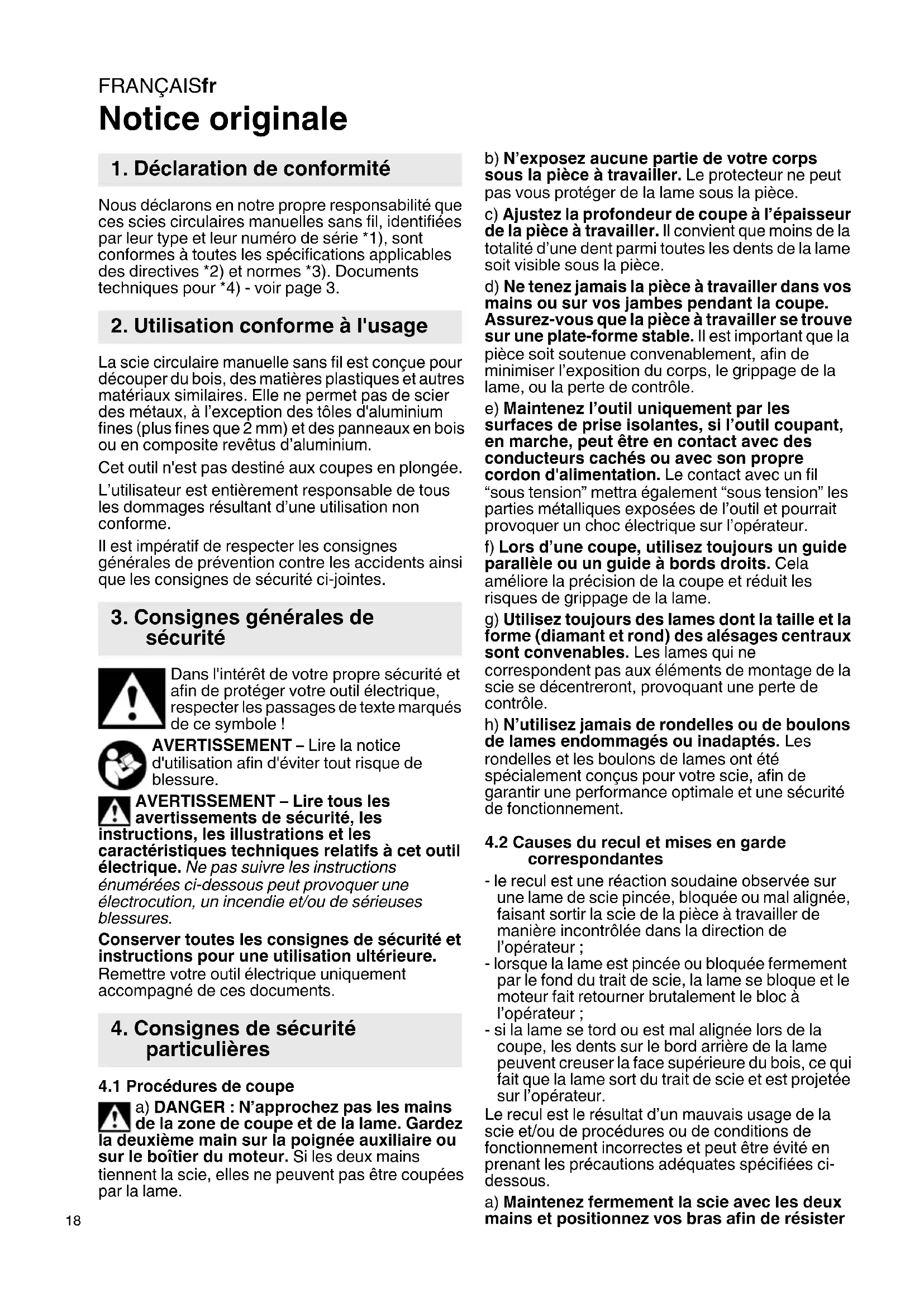 Notice originale Nous déclarons en notre propre responsabilité que ces scies circulaires manuelles sans fil, identifiées par leur type et leur numéro de série *1), sont conformes à toutes les spécifications applicables des directives *2) et normes *3). Documents techniques pour *4) - voir page 3. La scie circulaire manuelle sans fil est conçue pour découper du bois, des matières plastiques et autres matériaux similaires. Elle ne permet pas de scier des métaux, à l’exception des tôles d'aluminium fines (plus fines que 2 mm) et des panneaux en bois ou en composite revêtus d’aluminium. Cet outil n'est pas destiné aux coupes en plongée. L’utilisateur est entièrement responsable de tous les dommages résultant d’une utilisation non conforme. Il est impératif de respecter les consignes générales de prévention contre les accidents ainsi que les consignes de sécurité ci-jointes. Dans l'intérêt de votre propre sécurité et afin de protéger votre outil électrique, respecter les passages de texte marqués de ce symbole ! AVERTISSEMENT – Lire la notice d'utilisation afin d'éviter tout risque de blessure. AVERTISSEMENT – Lire tous les avertissements de sécurité, les instructions, les illustrations et les caractéristiques techniques relatifs à cet outil électrique. Ne pas suivre les instructions énumérées ci-dessous peut provoquer une électrocution, un incendie et/ou de sérieuses blessures. Conserver toutes les consignes de sécurité et instructions pour une utilisation ultérieure. Remettre votre outil électrique uniquement accompagné de ces documents.