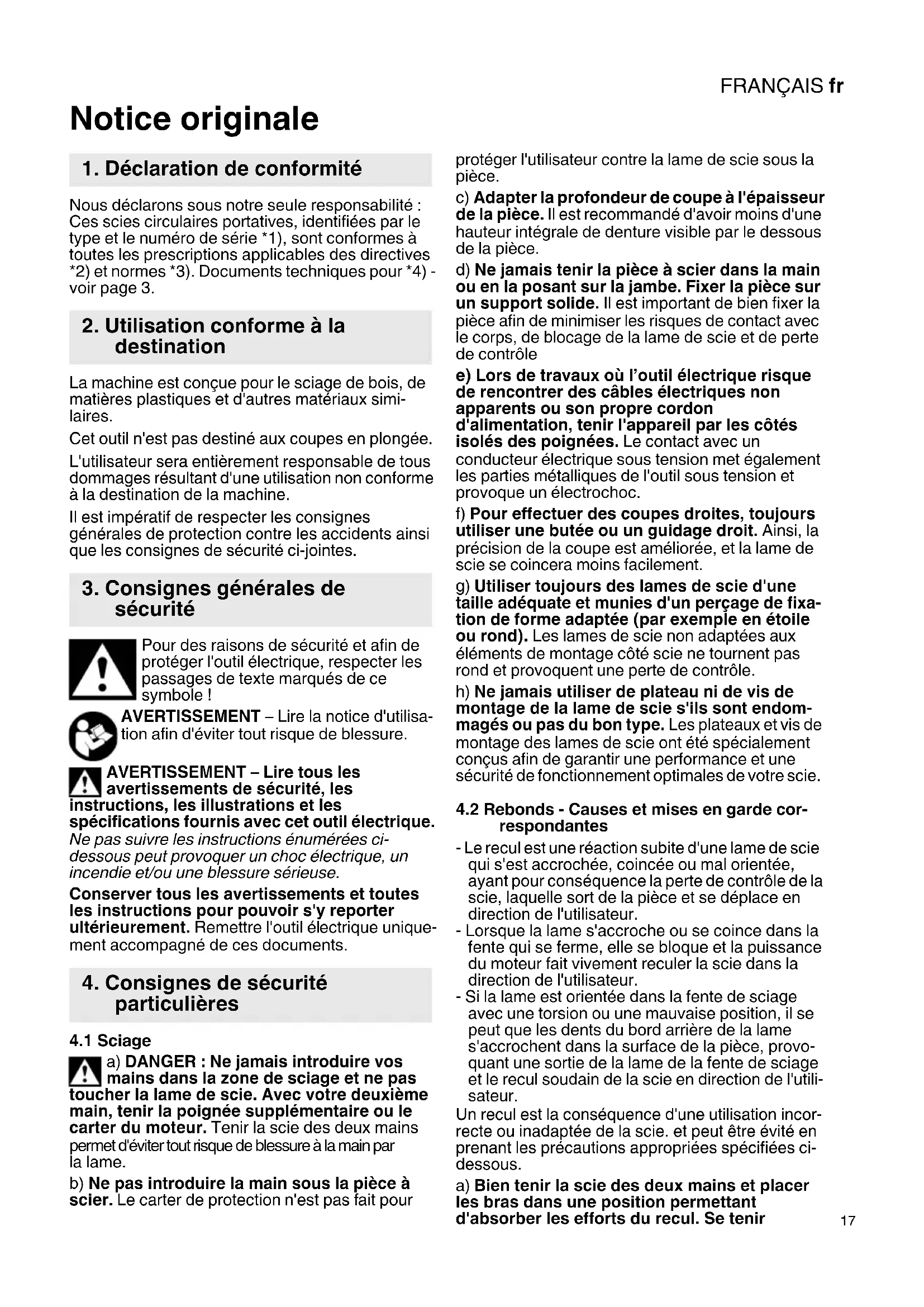 Notice originale Nous déclarons sous notre seule responsabilité : Ces scies circulaires portatives, identifiées par le type et le numéro de série *1), sont conformes à toutes les prescriptions applicables des directives *2) et normes *3). Documents techniques pour *4) - voir page 3. La machine est conçue pour le sciage de bois, de matières plastiques et d'autres matériaux simi- laires. Cet outil n'est pas destiné aux coupes en plongée. L'utilisateur sera entièrement responsable de tous dommages résultant d'une utilisation non conforme à la destination de la machine. Il est impératif de respecter les consignes générales de protection contre les accidents ainsi que les consignes de sécurité ci-jointes. Pour des raisons de sécurité et afin de protéger l'outil électrique, respecter les passages de texte marqués de ce symbole ! AVERTISSEMENT – Lire la notice d'utilisa- tion afin d'éviter tout risque de blessure. AVERTISSEMENT – Lire tous les avertissements de sécurité, les instructions, les illustrations et les spécifications fournis avec cet outil électrique. Ne pas suivre les instructions énumérées ci- dessous peut provoquer un choc électrique, un incendie et/ou une blessure sérieuse. Conserver tous les avertissements et toutes les instructions pour pouvoir s'y reporter ultérieurement. Remettre l'outil électrique unique- ment accompagné de ces documents.