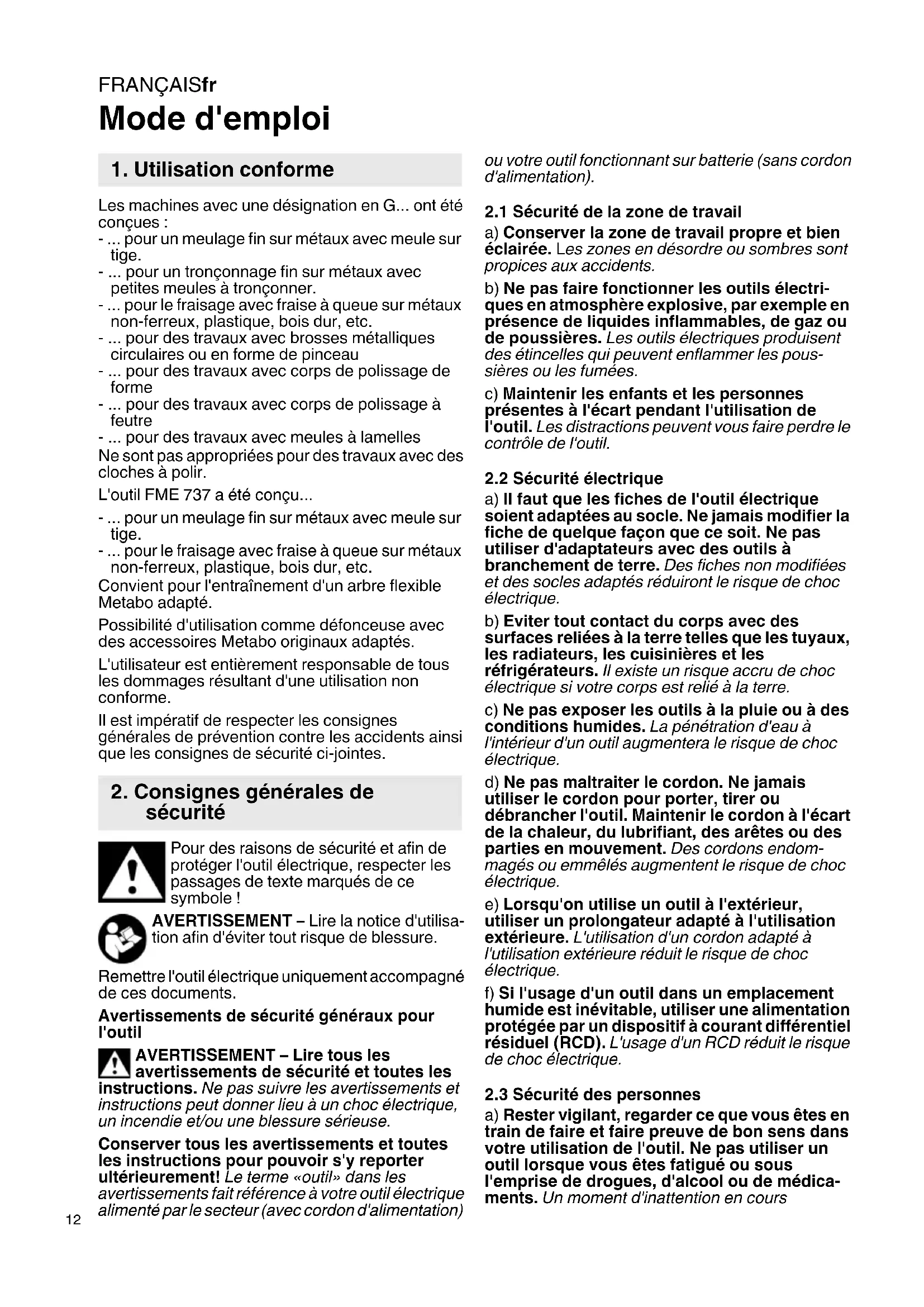 Mode d'emploi Les machines avec une désignation en G... ont été conçues : - ... pour un meulage fin sur métaux avec meule sur tige. - ... pour un tronçonnage fin sur métaux avec petites meules à tronçonner. - ... pour le fraisage avec fraise à queue sur métaux non-ferreux, plastique, bois dur, etc. - ... pour des travaux avec brosses métalliques circulaires ou en forme de pinceau - ... pour des travaux avec corps de polissage de forme - ... pour des travaux avec corps de polissage à feutre - ... pour des travaux avec meules à lamelles Ne sont pas appropriées pour des travaux avec des cloches à polir. L'outil FME 737 a été conçu... - ... pour un meulage fin sur métaux avec meule sur tige. - ... pour le fraisage avec fraise à queue sur métaux non-ferreux, plastique, bois dur, etc. Convient pour l'entraînement d'un arbre flexible Metabo adapté. Possibilité d'utilisation comme défonceuse avec des accessoires Metabo originaux adaptés. L'utilisateur est entièrement responsable de tous les dommages résultant d'une utilisation non conforme. Il est impératif de respecter les consignes générales de prévention contre les accidents ainsi que les consignes de sécurité ci-jointes. Pour des raisons de sécurité et afin de protéger l'outil électrique, respecter les passages de texte marqués de ce symbole ! AVERTISSEMENT – Lire la notice d'utilisa- tion afin d'éviter tout risque de blessure. Remettre l'outil électrique uniquement accompagné de ces documents. Avertissements de sécurité généraux pour l'outil AVERTISSEMENT – Lire tous les avertissements de sécurité et toutes les instructions. Ne pas suivre les avertissements et instructions peut donner lieu à un choc électrique, un incendie et/ou une blessure sérieuse. Conserver tous les avertissements et toutes les instructions pour pouvoir s'y reporter ultérieurement! Le terme «outil» dans les avertissements fait référence à votre outil électrique alimenté par le secteur (avec cordon d'alimentation) ou votre outil fonctionnant sur batterie (sans cordon d'alimentation).