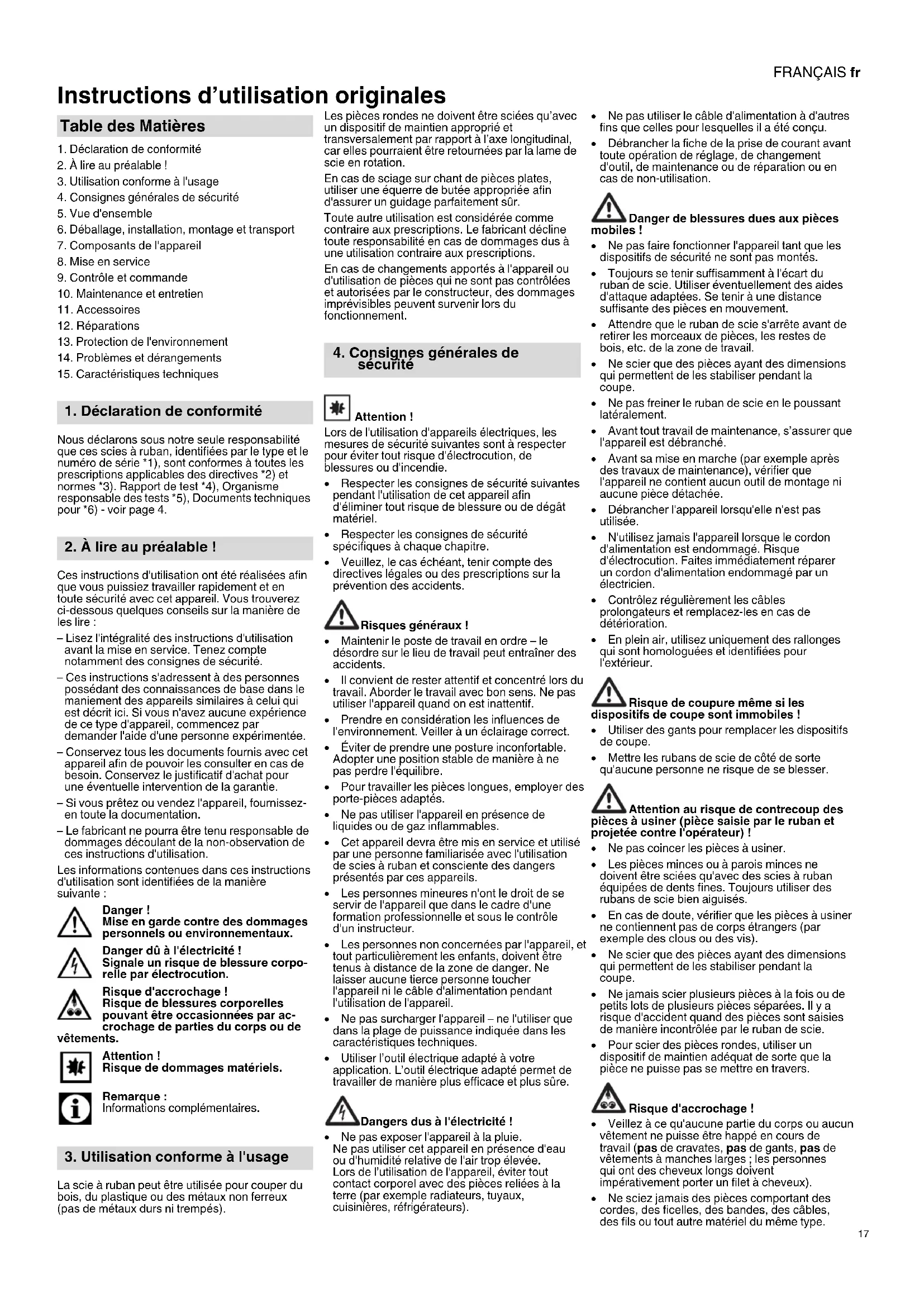 Nous déclarons sous notre seule responsabilité que ces scies à ruban, identifiées par le type et le numéro de série *1), sont conformes à toutes les prescriptions applicables des directives *2) et normes *3). Rapport de test *4), Organisme responsable des tests *5), Documents techniques pour *6) - voir page 4. Ces instructions d'utilisation ont été réalisées afin que vous puissiez travailler rapidement et en toute sécurité avec cet appareil. Vous trouverez ci-dessous quelques conseils sur la manière de les lire : – Lisez l'intégralité des instructions d'utilisation avant la mise en service. Tenez compte notamment des consignes de sécurité. – Ces instructions s'adressent à des personnes possédant des connaissances de base dans le maniement des appareils similaires à celui qui est décrit ici. Si vous n'avez aucune expérience de ce type d'appareil, commencez par demander l'aide d'une personne expérimentée. – Conservez tous les documents fournis avec cet appareil afin de pouvoir les consulter en cas de besoin. Conservez le justificatif d'achat pour une éventuelle intervention de la garantie. – Si vous prêtez ou vendez l'appareil, fournissez- en toute la documentation. – Le fabricant ne pourra être tenu responsable de dommages découlant de la non-observation de ces instructions d'utilisation. Les informations contenues dans ces instructions d'utilisation sont identifiées de la manière suivante : Danger ! Mise en garde contre des dommages personnels ou environnementaux. Danger dû à l'électricité ! Signale un risque de blessure corpo- relle par électrocution. Risque d'accrochage ! Risque de blessures corporelles pouvant être occasionnées par ac- crochage de parties du corps ou de vêtements. Attention ! Risque de dommages matériels. Remarque : Informations complémentaires. La scie à ruban peut être utilisée pour couper du bois, du plastique ou des métaux non ferreux (pas de métaux durs ni trempés). Les pièces rondes ne doivent être sciées qu’avec un dispositif de maintien approprié et transversalement par rapport à l’axe longitudinal, car elles pourraient être retournées par la lame de scie en rotation. En cas de sciage sur chant de pièces plates, utiliser une équerre de butée appropriée afin d'assurer un guidage parfaitement sûr. Toute autre utilisation est considérée comme contraire aux prescriptions. Le fabricant décline toute responsabilité en cas de dommages dus à une utilisation contraire aux prescriptions. En cas de changements apportés à l'appareil ou d'utilisation de pièces qui ne sont pas contrôlées et autorisées par le constructeur, des dommages imprévisibles peuvent survenir lors du fonctionnement. Attention ! Lors de l'utilisation d'appareils électriques, les mesures de sécurité suivantes sont à respecter pour éviter tout risque d'électrocution, de blessures ou d'incendie. Respecter les consignes de sécurité suivantes pendant l'utilisation de cet appareil afin d'éliminer tout risque de blessure ou de dégât matériel. Respecter les consignes de sécurité spécifiques à chaque chapitre. Veuillez, le cas échéant, tenir compte des directives légales ou des prescriptions sur la prévention des accidents. Risques généraux ! Maintenir le poste de travail en ordre – le désordre sur le lieu de travail peut entraîner des accidents. Il convient de rester attentif et concentré lors du travail. Aborder le travail avec bon sens. Ne pas utiliser l'appareil quand on est inattentif. Prendre en considération les influences de l'environnement. Veiller à un éclairage correct. Éviter de prendre une posture inconfortable. Adopter une position stable de manière à ne pas perdre l'équilibre. Pour travailler les pièces longues, employer des porte-pièces adaptés. Ne pas utiliser l'appareil en présence de liquides ou de gaz inflammables. Cet appareil devra être mis en service et utilisé par une personne familiarisée avec l'utilisation de scies à ruban et consciente des dangers présentés par ces appareils. Les personnes mineures n'ont le droit de se servir de l'appareil que dans le cadre d'une formation professionnelle et sous le contrôle d'un instructeur. Les personnes non concernées par l'appareil, et tout particulièrement les enfants, doivent être tenus à distance de la zone de danger. Ne laisser aucune tierce personne toucher l'appareil ni le câble d'alimentation pendant l'utilisation de l'appareil. Ne pas surcharger l'appareil – ne l'utiliser que dans la plage de puissance indiquée dans les caractéristiques techniques. Utiliser l’outil électrique adapté à votre application. L’outil électrique adapté permet de travailler de manière plus efficace et plus sûre. Dangers dus à l'électricité ! Ne pas exposer l'appareil à la pluie. Ne pas utiliser cet appareil en présence d'eau ou d'humidité relative de l'air trop élevée. Lors de l’utilisation de l'appareil, éviter tout contact corporel avec des pièces reliées à la terre (par exemple radiateurs, tuyaux, cuisinières, réfrigérateurs). Ne pas utiliser le câble d'alimentation à d'autres fins que celles pour lesquelles il a été conçu. Débrancher la fiche de la prise de courant avant toute opération de réglage, de changement d'outil, de maintenance ou de réparation ou en cas de non-utilisation. Danger de blessures dues aux pièces mobiles ! Ne pas faire fonctionner l'appareil tant que les dispositifs de sécurité ne sont pas montés. Toujours se tenir suffisamment à l'écart du ruban de scie. Utiliser éventuellement des aides d'attaque adaptées. Se tenir à une distance suffisante des pièces en mouvement. Attendre que le ruban de scie s'arrête avant de retirer les morceaux de pièces, les restes de bois, etc. de la zone de travail. Ne scier que des pièces ayant des dimensions qui permettent de les stabiliser pendant la coupe. Ne pas freiner le ruban de scie en le poussant latéralement. Avant 