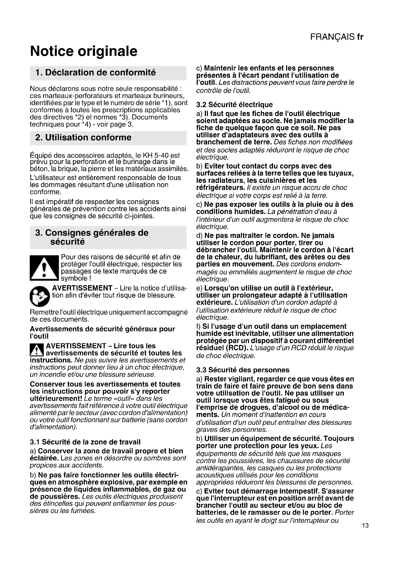 Notice originale Nous déclarons sous notre seule responsabilité : ces marteaux-perforateurs et marteaux burineurs, identifiées par le type et le numéro de série *1), sont conformes à toutes les prescriptions applicables des directives *2) et normes *3). Documents techniques pour *4) - voir page 3. Équipé des accessoires adaptés, le KH 5-40 est prévu pour la perforation et le burinage dans le béton, la brique, la pierre et les matériaux assimilés. L'utilisateur est entièrement responsable de tous les dommages résultant d'une utilisation non conforme. Il est impératif de respecter les consignes générales de prévention contre les accidents ainsi que les consignes de sécurité ci-jointes. Pour des raisons de sécurité et afin de protéger l'outil électrique, respecter les passages de texte marqués de ce symbole ! AVERTISSEMENT – Lire la notice d'utilisa- tion afin d'éviter tout risque de blessure. Remettre l'outil électrique uniquement accompagné de ces documents. Avertissements de sécurité généraux pour l'outil AVERTISSEMENT – Lire tous les avertissements de sécurité et toutes les instructions. Ne pas suivre les avertissements et instructions peut donner lieu à un choc électrique, un incendie et/ou une blessure sérieuse. Conserver tous les avertissements et toutes les instructions pour pouvoir s'y reporter ultérieurement! Le terme «outil» dans les avertissements fait référence à votre outil électrique alimenté par le secteur (avec cordon d'alimentation) ou votre outil fonctionnant sur batterie (sans cordon d'alimentation).