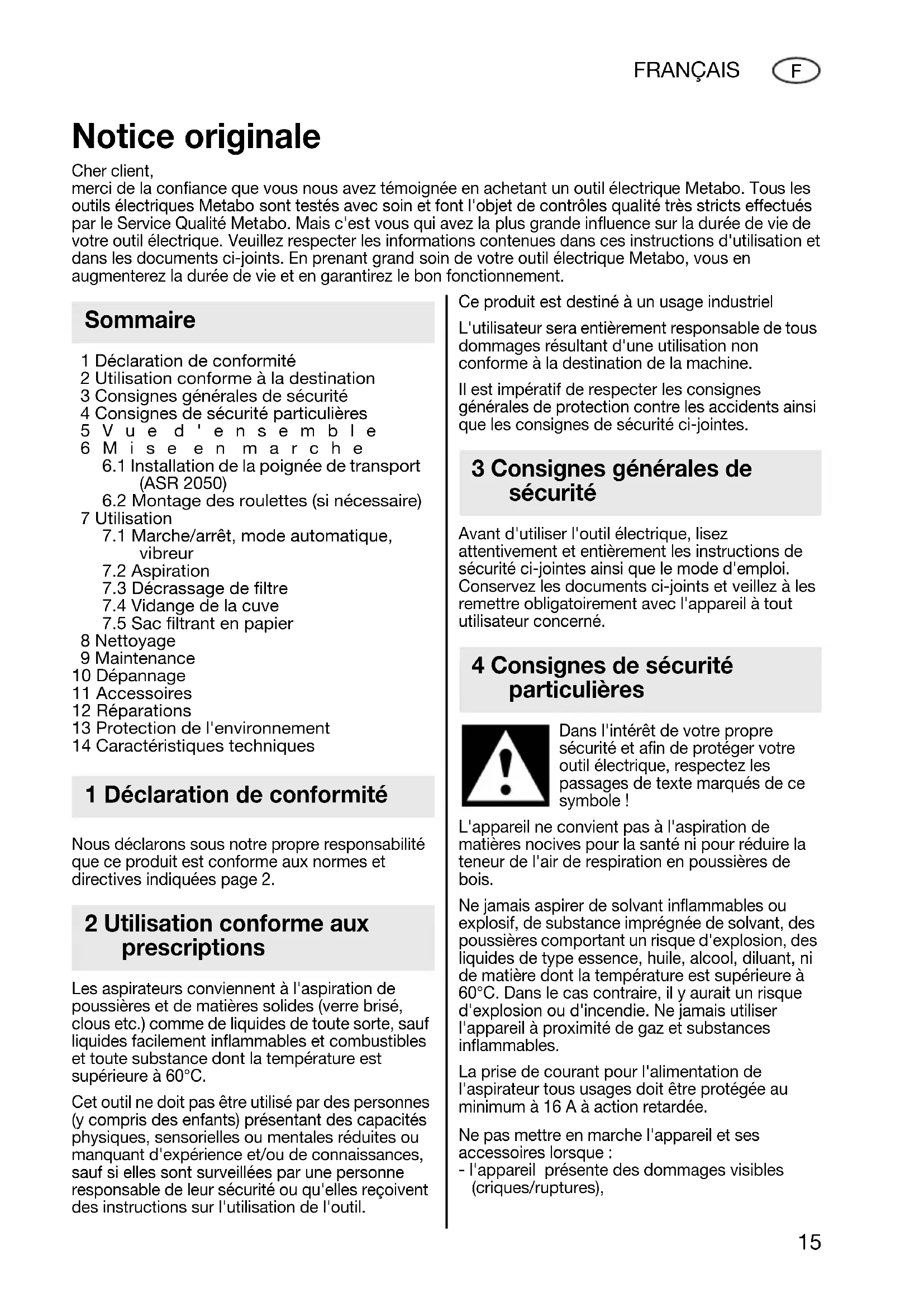 8 Nettoyage 9 Maintenance 10 Dépannage 11 Accessoires 12 Réparations 13 Protection de l'environnement 14 Caractéristiques techniques Nous déclarons sous notre propre responsabilité que ce produit est conforme aux normes et directives indiquées page 2. Les aspirateurs conviennent à l'aspiration de poussières et de matières solides (verre brisé, clous etc.) comme de liquides de toute sorte, sauf liquides facilement inflammables et combustibles et toute substance dont la température est supérieure à 60°C. Cet outil ne doit pas être utilisé par des personnes (y compris des enfants) présentant des capacités physiques, sensorielles ou mentales réduites ou manquant d'expérience et/ou de connaissances, sauf si elles sont surveillées par une personne responsable de leur sécurité ou qu'elles reçoivent des instructions sur l'utilisation de l'outil. Ce produit est destiné à un usage industriel L'utilisateur sera entièrement responsable de tous dommages résultant d'une utilisation non conforme à la destination de la machine. Il est impératif de respecter les consignes générales de protection contre les accidents ainsi que les consignes de sécurité ci-jointes. Avant d'utiliser l'outil électrique, lisez attentivement et entièrement les instructions de sécurité ci-jointes ainsi que le mode d'emploi. Conservez les documents ci-joints et veillez à les remettre obligatoirement avec l'appareil à tout utilisateur concerné. Dans l'intérêt de votre propre sécurité et afin de protéger votre outil électrique, respectez les passages de texte marqués de ce symbole ! L'appareil ne convient pas à l'aspiration de matières nocives pour la santé ni pour réduire la teneur de l'air de respiration en poussières de bois. Ne jamais aspirer de solvant inflammables ou explosif, de substance imprégnée de solvant, des poussières comportant un risque d'explosion, des liquides de type essence, huile, alcool, diluant, ni de matière dont la température est supérieure à 60°C. Dans le cas contraire, il y aurait un risque d'explosion ou d'incendie. Ne jamais utiliser l'appareil à proximité de gaz et substances inflammables. La prise de courant pour l'alimentation de l'aspirateur tous usages doit être protégée au minimum à 16 A à action retardée. Ne pas mettre en marche l'appareil et ses accessoires lorsque : - l'appareil présente des dommages visibles (criques/ruptures), Notice originale Cher client, merci de la confiance que vous nous avez témoignée en achetant un outil électrique Metabo. Tous les outils électriques Metabo sont testés avec soin et font l'objet de contrôles qualité très stricts effectués par le Service Qualité Metabo. Mais c'est vous qui avez la plus grande influence sur la durée de vie de votre outil électrique. Veuillez respecter les informations contenues dans ces instructions d'utilisation et dans les documents ci-joints. En prenant grand soin de votre outil électrique Metabo, vous en augmenterez la durée de vie et en garantirez le bon fonctionnement. Sommaire 1 Déclaration de conformité 2 Utilisation conforme aux prescriptions 3 Consignes générales de sécurité 4 Consignes de sécurité particulières 17026696_0810 ASR 2025 und ASR 2050.book Seite 15 Mittwoch, 18. August 2010 5:10 1716 FRANÇAIS