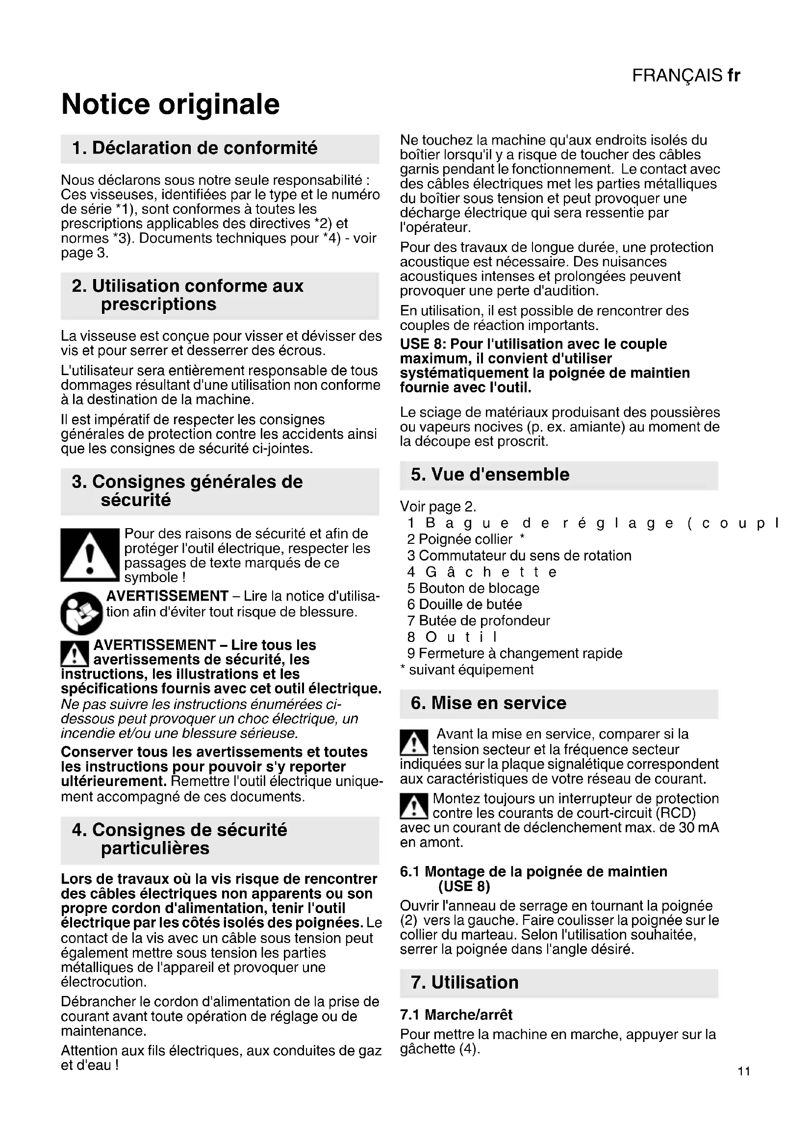 Notice originale Nous déclarons sous notre seule responsabilité : Ces visseuses, identifiées par le type et le numéro de série *1), sont conformes à toutes les prescriptions applicables des directives *2) et normes *3). Documents techniques pour *4) - voir page 3. La visseuse est conçue pour visser et dévisser des vis et pour serrer et desserrer des écrous. L'utilisateur sera entièrement responsable de tous dommages résultant d'une utilisation non conforme à la destination de la machine. Il est impératif de respecter les consignes générales de protection contre les accidents ainsi que les consignes de sécurité ci-jointes. Pour des raisons de sécurité et afin de protéger l'outil électrique, respecter les passages de texte marqués de ce symbole ! AVERTISSEMENT – Lire la notice d'utilisa- tion afin d'éviter tout risque de blessure. AVERTISSEMENT – Lire tous les avertissements de sécurité, les instructions, les illustrations et les spécifications fournis avec cet outil électrique. Ne pas suivre les instructions énumérées ci- dessous peut provoquer un choc électrique, un incendie et/ou une blessure sérieuse. Conserver tous les avertissements et toutes les instructions pour pouvoir s'y reporter ultérieurement. Remettre l'outil électrique unique- ment accompagné de ces documents. Lors de travaux où la vis risque de rencontrer des câbles électriques non apparents ou son propre cordon d'alimentation, tenir l'outil électrique par les côtés isolés des poignées. Le contact de la vis avec un câble sous tension peut également mettre sous tension les parties métalliques de l'appareil et provoquer une électrocution. Débrancher le cordon d'alimentation de la prise de courant avant toute opération de réglage ou de maintenance. Attention aux fils électriques, aux conduites de gaz et d'eau ! Ne touchez la machine qu'aux endroits isolés du boîtier lorsqu'il y a risque de toucher des câbles garnis pendant le fonctionnement. Le contact avec des câbles électriques met les parties métalliques du boîtier sous tension et peut provoquer une décharge électrique qui sera ressentie par l'opérateur. Pour des travaux de longue durée, une protection acoustique est nécessaire. Des nuisances acoustiques intenses et prolongées peuvent provoquer une perte d'audition. En utilisation, il est possible de rencontrer des couples de réaction importants. USE 8: Pour l'utilisation avec le couple maximum, il convient d'utiliser systématiquement la poignée de maintien fournie avec l'outil. Le sciage de matériaux produisant des poussières ou vapeurs nocives (p. ex. amiante) au moment de la découpe est proscrit. Voir page 2. 1Bague de réglage (couple) 2 Poignée collier