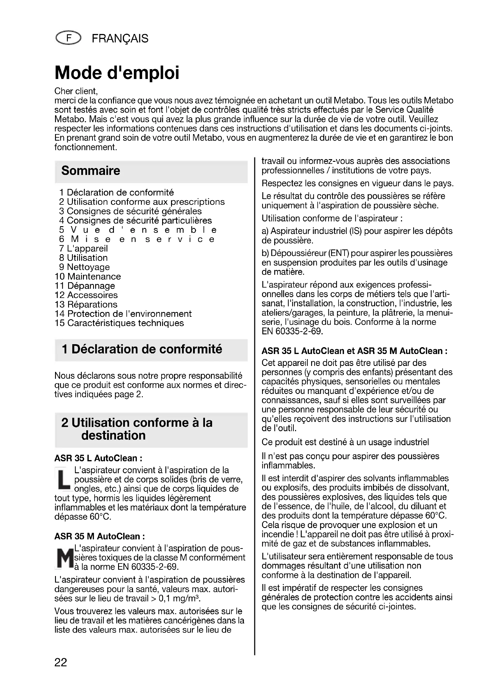 1 Déclaration de conformité 2 Utilisation conforme aux prescriptions 3 Consignes de sécurité générales 4 Consignes de sécurité particulières 5Vue d'ensemble 6Mise en service 7 L'appareil 8 Utilisation 9 Nettoyage 10 Maintenance 11 Dépannage 12 Accessoires 13 Réparations 14 Protection de l'environnement 15 Caractéristiques techniques Nous déclarons sous notre propre responsabilité que ce produit est conforme aux normes et direc- tives indiquées page 2. ASR 35 L AutoClean : L'aspirateur convient à l'aspiration de la poussière et de corps solides (bris de verre, ongles, etc.) ainsi que de corps liquides de tout type, hormis les liquides légèrement inflammables et les matériaux dont la température dépasse 60°C. ASR 35 M AutoClean : L'aspirateur convient à l'aspiration de pous- sières toxiques de la classe M conformément à la norme EN 60335-2-69. L'aspirateur convient à l'aspiration de poussières dangereuses pour la santé, valeurs max. autori- sées sur le lieu de travail > 0,1 mg/m³. Vous trouverez les valeurs max. autorisées sur le lieu de travail et les matières cancérigènes dans la liste des valeurs max. autorisées sur le lieu de travail ou informez-vous auprès des associations professionnelles / institutions de votre pays. Respectez les consignes en vigueur dans le pays. Le résultat du contrôle des poussières se réfère uniquement à l'aspiration de poussière sèche. Utilisation conforme de l'aspirateur : a) Aspirateur industriel (IS) pour aspirer les dépôts de poussière. b) Dépoussiéreur (ENT) pour aspirer les poussières en suspension produites par les outils d'usinage de matière. L'aspirateur répond aux exigences professi- onnelles dans les corps de métiers tels que l'arti- sanat, l'installation, la construction, l'industrie, les ateliers/garages, la peinture, la plâtrerie, la menui- serie, l'usinage du bois. Conforme à la norme EN 60335-2-69. ASR 35 L AutoClean et ASR 35 M AutoClean : Cet appareil ne doit pas être utilisé par des personnes (y compris des enfants) présentant des capacités physiques, sensorielles ou mentales réduites ou manquant d'expérience et/ou de connaissances, sauf si elles sont surveillées par une personne responsable de leur sécurité ou qu'elles reçoivent des instructions sur l'utilisation de l'outil. Ce produit est destiné à un usage industriel Il n'est pas conçu pour aspirer des poussières inflammables. Il est interdit d'aspirer des solvants inflammables ou explosifs, des produits imbibés de dissolvant, des poussières explosives, des liquides tels que de l'essence, de l'huile, de l'alcool, du diluant et des produits dont la température dépasse 60°C. Cela risque de provoquer une explosion et un incendie ! L'appareil ne doit pas être utilisé à proxi- mité de gaz et de substances inflammables. L'utilisateur sera entièrement responsable de tous dommages résultant d'une utilisation non conforme à la destination de l'appareil. Il est impératif de respecter les consignes générales de protection contre les accidents ainsi que les consignes de sécurité ci-jointes. Mode d'emploi Cher client, merci de la confiance que vous nous avez témoignée en achetant un outil Metabo. Tous les outils Metabo sont testés avec soin et font l'objet de contrôles qualité très stricts effectués par le Service Qualité Metabo. Mais c'est vous qui avez la plus grande influence sur la durée de vie de votre outil. Veuillez respecter les informations contenues dans ces instructions d'utilisation et dans les documents ci-joints. En prenant grand soin de votre outil Metabo, vous en augmenterez la durée de vie et en garantirez le bon fonctionnement. Sommaire 1 Déclaration de conformité 2 Utilisation conforme à la destination 17027067_0711 ASR 35 L_M AutoClean ENTWURF.book Seite 22 Montag, 25. Juli 2011 4:46 16FRANÇAIS