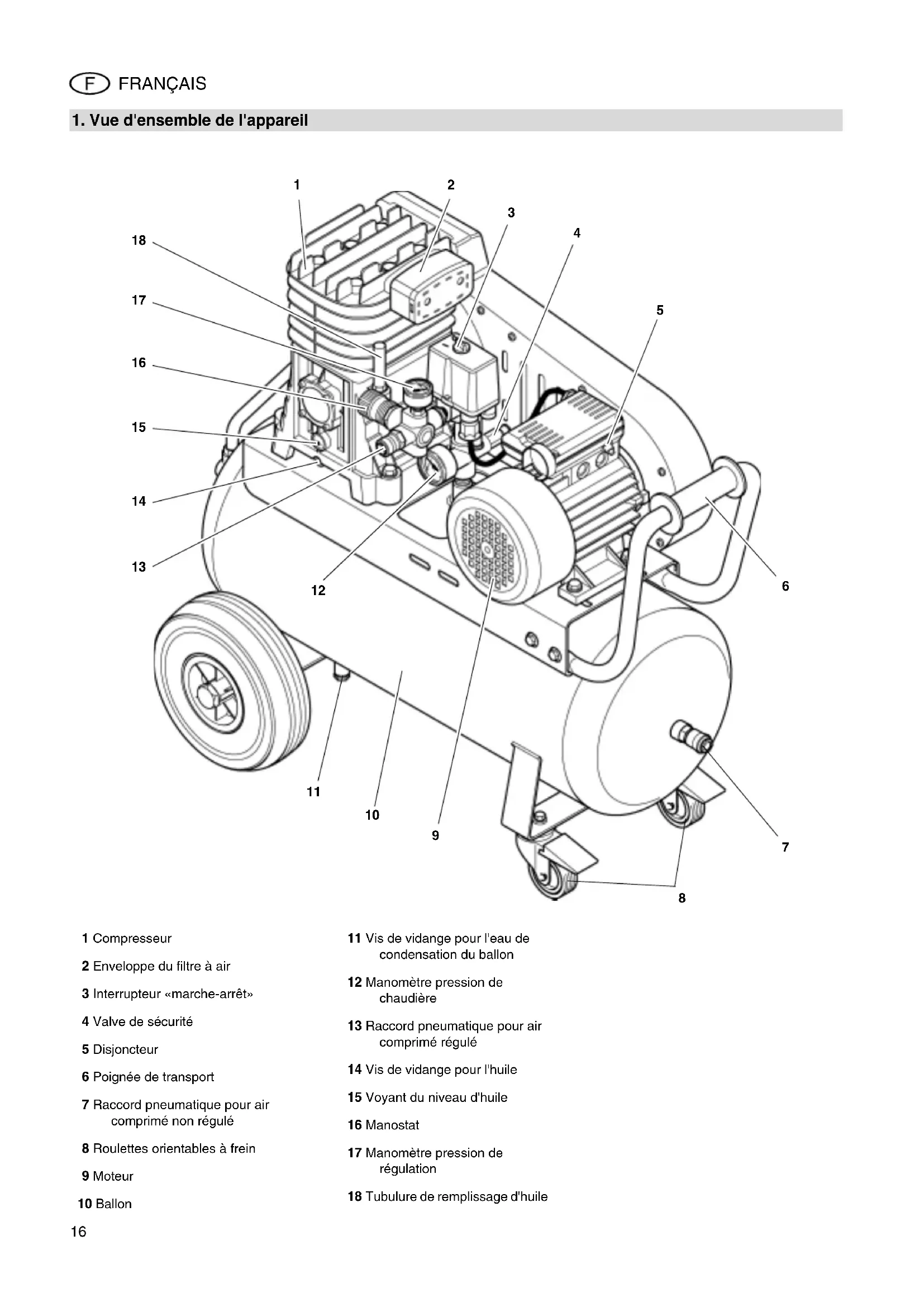 1 Compresseur 2 Enveloppe du filtre à air 3 Interrupteur «marche-arrêt» 4 Valve de sécurité 5 Disjoncteur 6 Poignée de transport 7 Raccord pneumatique pour air comprimé non régulé 8 Roulettes orientables à frein 9 Moteur 10 Ballon 11 Vis de vidange pour l'eau de condensation du ballon 12 Manomètre pression de chaudière 13 Raccord pneumatique pour air comprimé régulé 14 Vis de vidange pour l'huile 15 Voyant du niveau d'huile 16 Manostat 17 Manomètre pression de régulation 18 Tubulure de remplissage d'huile XK0022F.fm Instructions d'utilisation FRANÇAIS17 FRANÇAIS