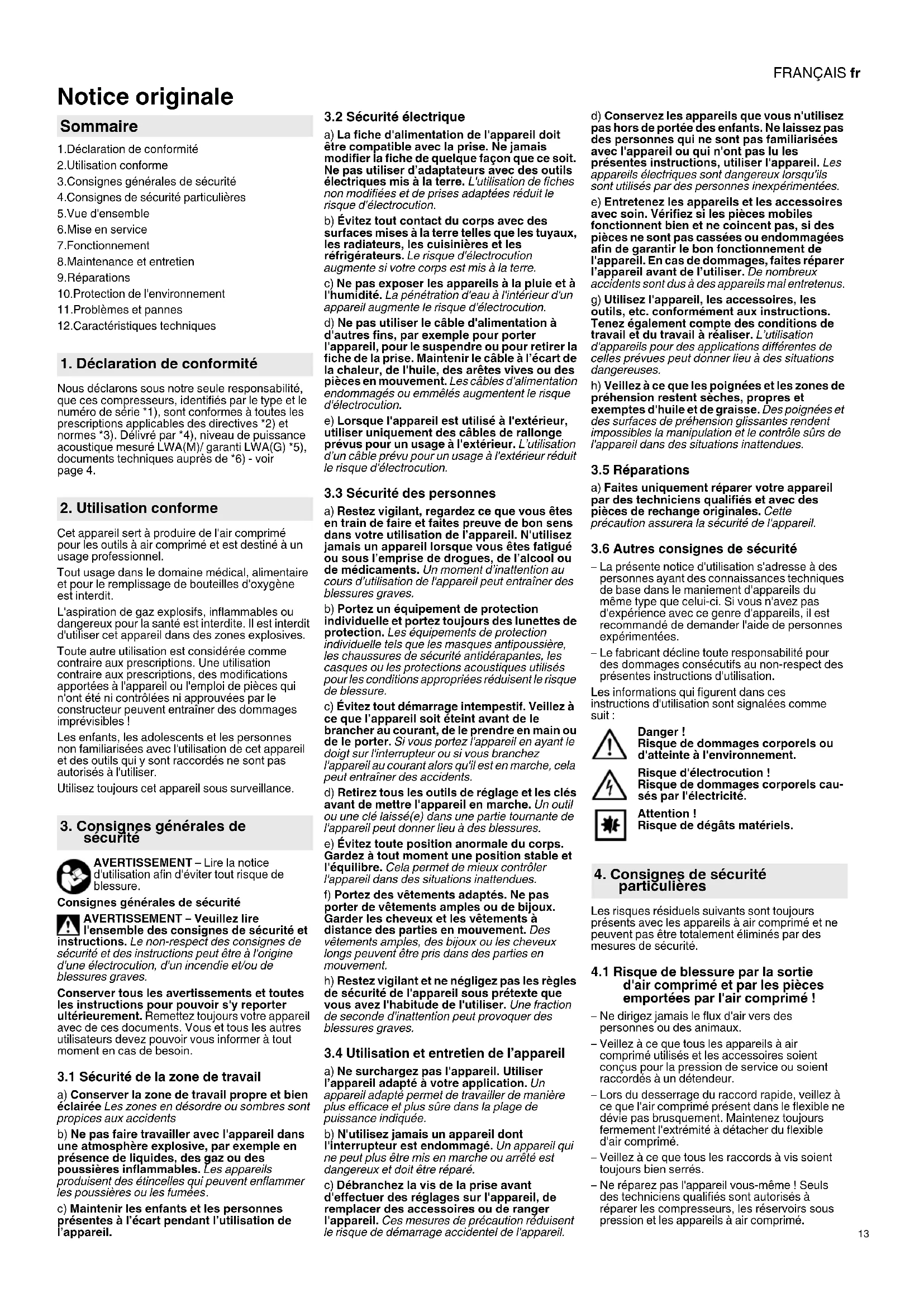 Notice originale 1.Déclaration de conformité 2.Utilisation conforme 3.Consignes générales de sécurité 4.Consignes de sécurité particulières 5.Vue d'ensemble 6.Mise en service 7.Fonctionnement 8.Maintenance et entretien 9.Réparations 10.Protection de l'environnement 11.Problèmes et pannes 12.Caractéristiques techniques Nous déclarons sous notre seule responsabilité, que ces compresseurs, identifiés par le type et le numéro de série *1), sont conformes à toutes les prescriptions applicables des directives *2) et normes *3). Délivré par *4), niveau de puissance acoustique mesuré LWA(M)/ garanti LWA(G) *5), documents techniques auprès de *6) - voir page 4. Cet appareil sert à produire de l'air comprimé pour les outils à air comprimé et est destiné à un usage professionnel. Tout usage dans le domaine médical, alimentaire et pour le remplissage de bouteilles d'oxygène est interdit. L'aspiration de gaz explosifs, inflammables ou dangereux pour la santé est interdite. Il est interdit d'utiliser cet appareil dans des zones explosives. Toute autre utilisation est considérée comme contraire aux prescriptions. Une utilisation contraire aux prescriptions, des modifications apportées à l'appareil ou l'emploi de pièces qui n'ont été ni contrôlées ni approuvées par le constructeur peuvent entraîner des dommages imprévisibles ! Les enfants, les adolescents et les personnes non familiarisées avec l'utilisation de cet appareil et des outils qui y sont raccordés ne sont pas autorisés à l'utiliser. Utilisez toujours cet appareil sous surveillance. AVERTISSEMENT – Lire la notice d'utilisation afin d'éviter tout risque de blessure. Consignes générales de sécurité AVERTISSEMENT – Veuillez lire l'ensemble des consignes de sécurité et instructions. Le non-respect des consignes de sécurité et des instructions peut être à l'origine d'une électrocution, d'un incendie et/ou de blessures graves. Conserver tous les avertissements et toutes les instructions pour pouvoir s'y reporter ultérieurement. Remettez toujours votre appareil avec de ces documents. Vous et tous les autres utilisateurs devez pouvoir vous informer à tout moment en cas de besoin.
