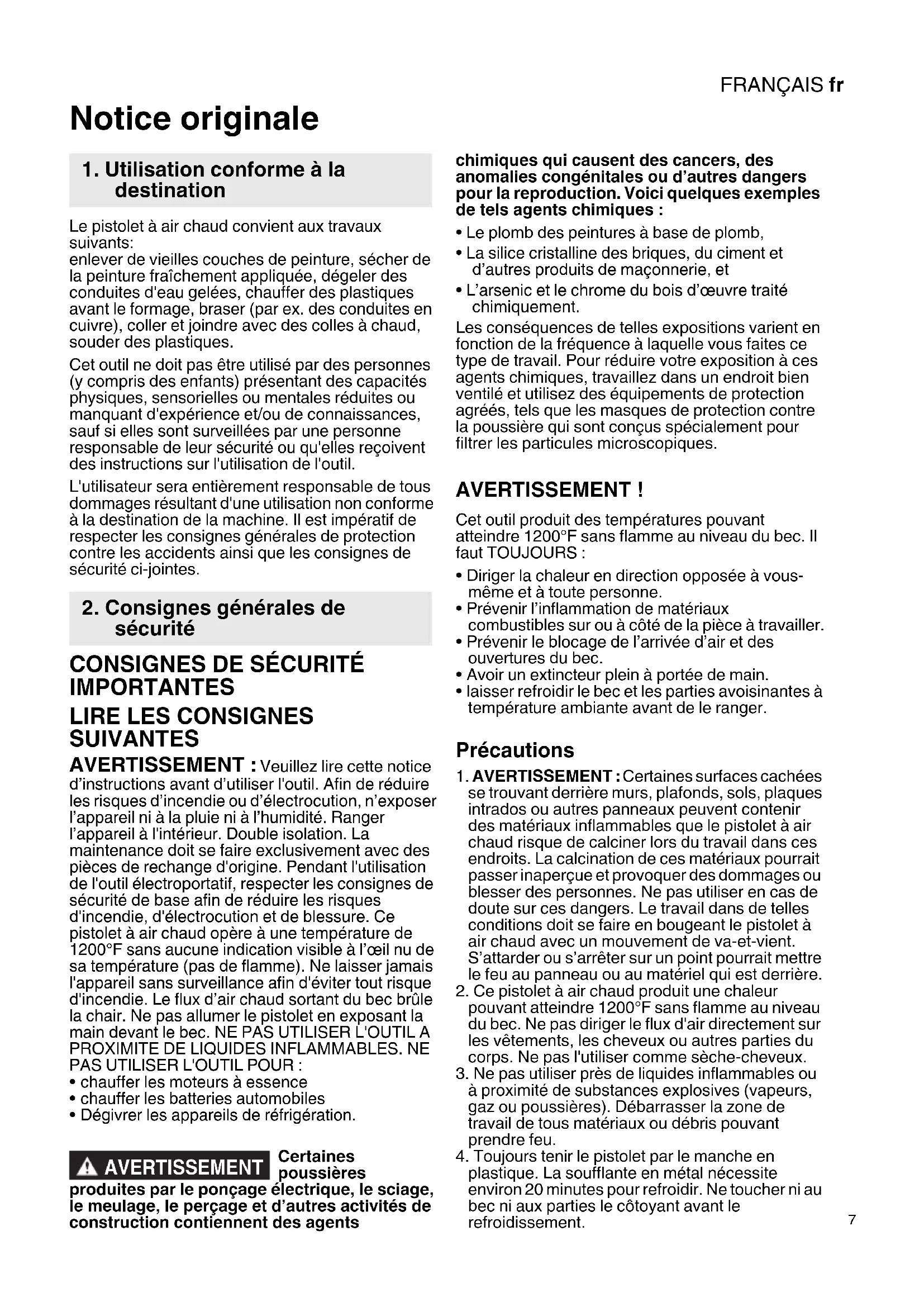 - L’arsenic et le chrome du bois d’œuvre traité chimiquement. Les conséquences de telles expositions varient en fonction de la fréquence à laquelle vous faites ce type de travail. Pour réduire votre exposition à ces agents chimiques, travaillez dans un endroit bien ventilé et utilisez des équipements de protection agréés, tels que les masques de protection contre la poussière qui sont conçus spécialement pour filtrer les particules microscopiques. AVERTISSEMENT ! Cet outil produit des températures pouvant atteindre 1200°F sans flamme au niveau du bec. Il faut TOUJOURS :