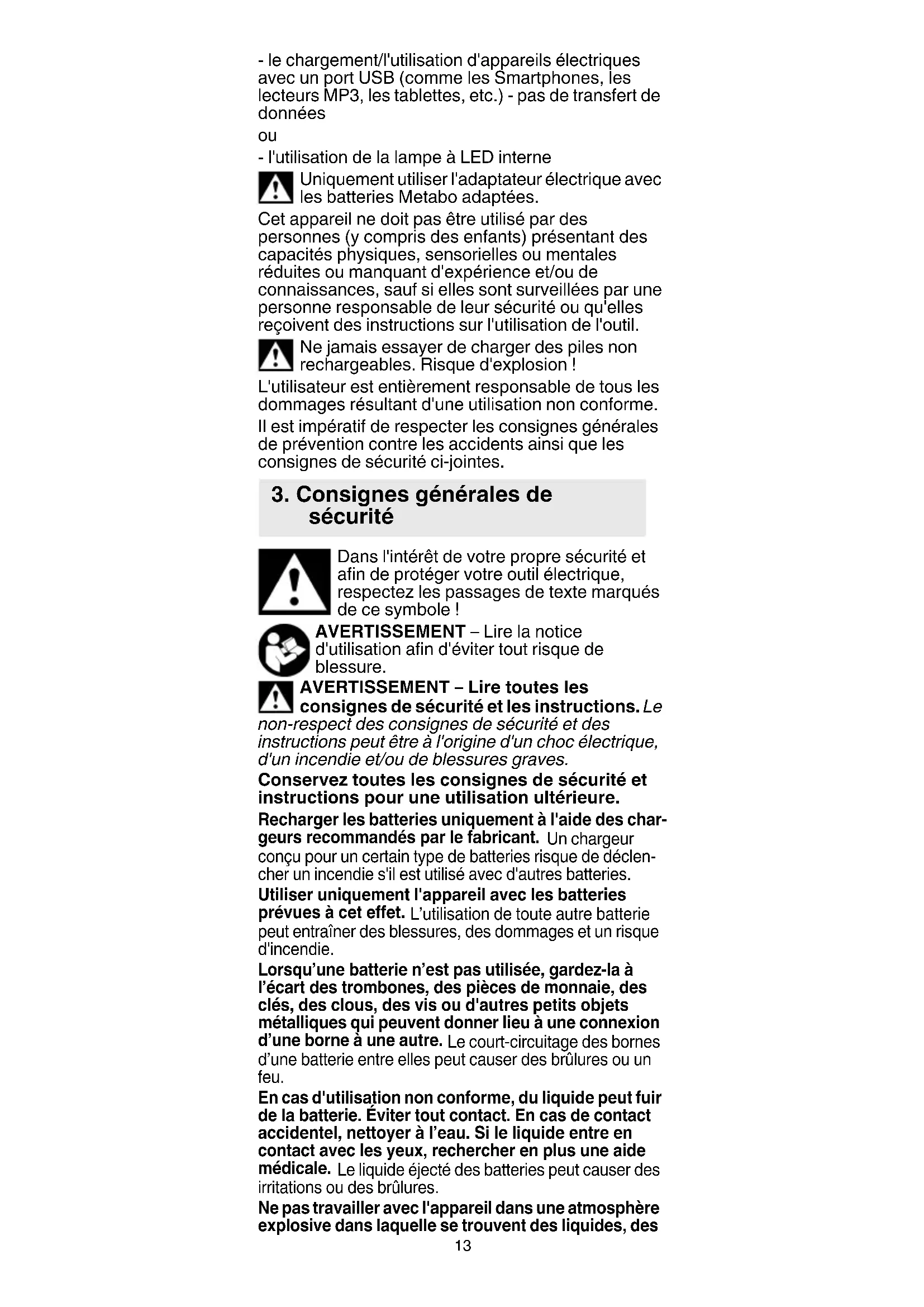 - l'utilisation de la lampe à LED interne Uniquement utiliser l'adaptateur électrique avec les batteries Metabo adaptées. Cet appareil ne doit pas être utilisé par des personnes (y compris des enfants) présentant des capacités physiques, sensorielles ou mentales réduites ou manquant d'expérience et/ou de connaissances, sauf si elles sont surveillées par une personne responsable de leur sécurité ou qu'elles reçoivent des instructions sur l'utilisation de l'outil. Ne jamais essayer de charger des piles non rechargeables. Risque d'explosion ! L'utilisateur est entièrement responsable de tous les dommages résultant d'une utilisation non conforme. Il est impératif de respecter les consignes générales de prévention contre les accidents ainsi que les consignes de sécurité ci-jointes. Dans l'intérêt de votre propre sécurité et afin de protéger votre outil électrique, respectez les passages de texte marqués de ce symbole ! AVERTISSEMENT – Lire la notice d'utilisation afin d'éviter tout risque de blessure. AVERTISSEMENT – Lire toutes les consignes de sécurité et les instructions. Le non-respect des consignes de sécurité et des instructions peut être à l'origine d'un choc électrique, d'un incendie et/ou de blessures graves. Conservez toutes les consignes de sécurité et instructions pour une utilisation ultérieure. Recharger les batteries uniquement à l'aide des char- geurs recommandés par le fabricant. Un chargeur conçu pour un certain type de batteries risque de déclen- cher un incendie s'il est utilisé avec d'autres batteries. Utiliser uniquement l'appareil avec les batteries prévues à cet effet. L’utilisation de toute autre batterie peut entraîner des blessures, des dommages et un risque d'incendie. Lorsqu’une batterie n’est pas utilisée, gardez-la à l’écart des trombones, des pièces de monnaie, des clés, des clous, des vis ou d'autres petits objets métalliques qui peuvent donner lieu à une connexion d’une borne à une autre. Le court-circuitage des bornes d’une batterie entre elles peut causer des brûlures ou un feu. En cas d'utilisation non conforme, du liquide peut fuir de la batterie. Éviter tout contact. En cas de contact accidentel, nettoyer à l’eau. Si le liquide entre en contact avec les yeux, rechercher en plus une aide médicale. Le liquide éjecté des batteries peut causer des irritations ou des brûlures. Ne pas travailler avec l'appareil dans une atmosphère explosive dans laquelle se trouvent des liquides, des