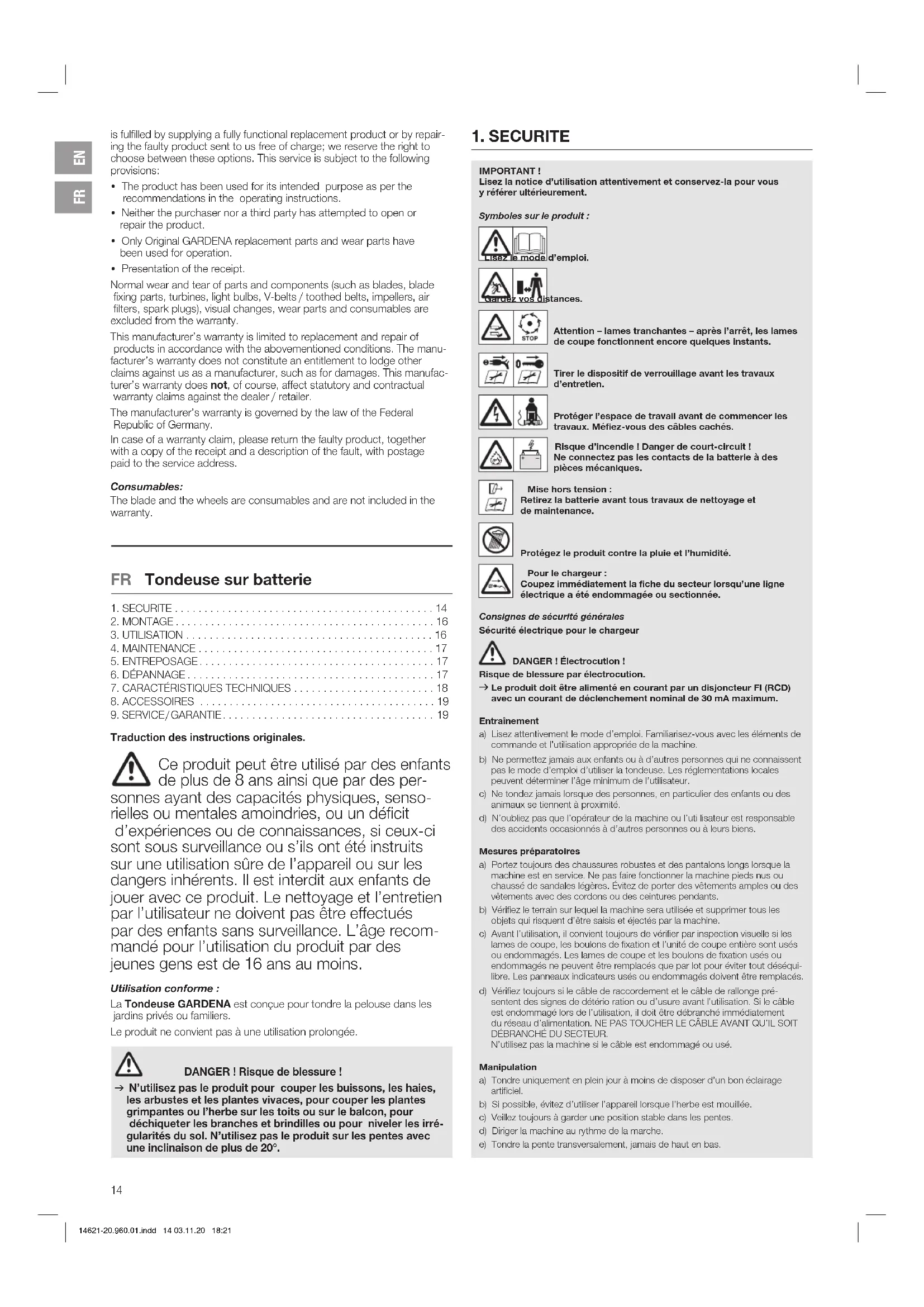 - Présentation de la preuve d’achat. L’usure normale de pièces et de composants (par exemple sur des lames, pièces de fixation des lames, turbines, éclairages, courroies trapézoïdales et crantées, turbines, filtres à air, bougies d’allumage), des modifications d’aspect ainsi que les pièces d’usure et de consommation sont exclues de la garantie. Cette garantie de fabricant est limitée à la livraison de remplacement et àla réparation en vertu des conditions mentionnées ci-avant. D’autres prétentions à notre encontre en tant que fabricant, par exemple dom- mages et intérêts, ne sont pas fondées par la garantie de fabricant. Cette garantie de fabricant ne concerne bien évidemment pas les réclamations de garantie existantes, légales et contractuelles envers le revendeur / l’acheteur. La garantie de fabricant est soumise au droit de la République Fédérale d’Allemagne. En cas de recours à la garantie, veuillez renvoyer le produit défectueux accompagné d’une copie de la preuve d’achat et d’une description du défaut, suffisamment affranchi, à l’adresse de service GARDENA. Pièces d’usure: La lame et les roues sont des pièces d’usure et ne sont donc pas couvertes par la garantie.