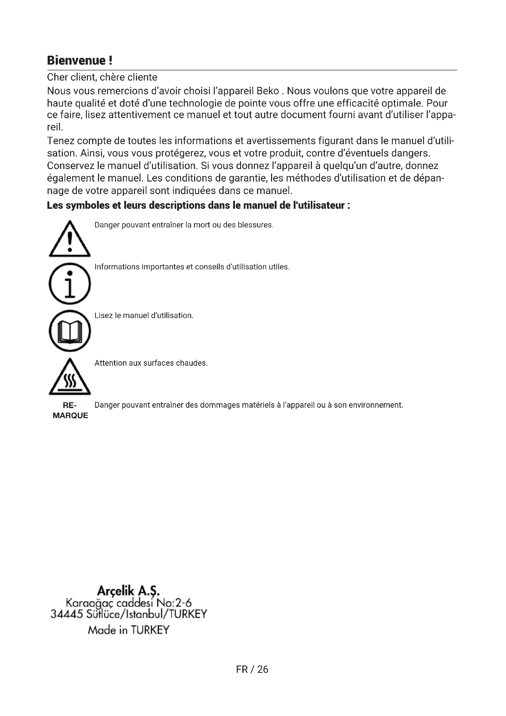 ROFR / 26 Bienvenue! Cher client, chère cliente Nous vous remercions d’avoir choisi l’appareil Beko . Nous voulons que votre appareil de haute qualité et doté d’une technologie de pointe vous offre une efficacité optimale. Pour ce faire, lisez attentivement ce manuel et tout autre document fourni avant d’utiliser l’appa- reil. Tenez compte de toutes les informations et avertissements figurant dans le manuel d’utili- sation. Ainsi, vous vous protégerez, vous et votre produit, contre d’éventuels dangers. Conservez le manuel d’utilisation. Si vous donnez l’appareil à quelqu’un d’autre, donnez également le manuel. Les conditions de garantie, les méthodes d'utilisation et de dépan- nage de votre appareil sont indiquées dans ce manuel. Les symboles et leurs descriptions dans le manuel de l'utilisateur : Danger pouvant entraîner la mort ou des blessures. Informations importantes et conseils d’utilisation utiles. Lisez le manuel d’utilisation. Attention aux surfaces chaudes. RE- MARQUE Danger pouvant entraîner des dommages matériels à l’appareil ou à son environnement.FR / 27 Table des matières 1 Consignes de sécurité.................. 28
