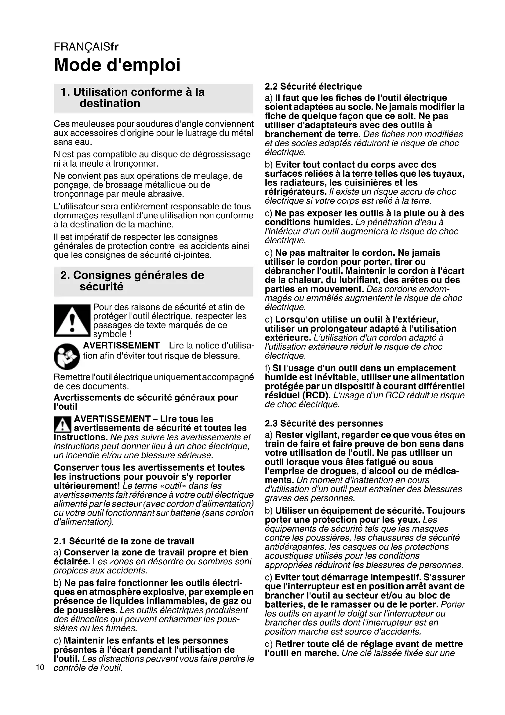 Mode d'emploi Ces meuleuses pour soudures d'angle conviennent aux accessoires d'origine pour le lustrage du métal sans eau. N'est pas compatible au disque de dégrossissage ni à la meule à tronçonner. Ne convient pas aux opérations de meulage, de ponçage, de brossage métallique ou de tronçonnage par meule abrasive. L'utilisateur sera entièrement responsable de tous dommages résultant d'une utilisation non conforme à la destination de la machine. Il est impératif de respecter les consignes générales de protection contre les accidents ainsi que les consignes de sécurité ci-jointes. Pour des raisons de sécurité et afin de protéger l'outil électrique, respecter les passages de texte marqués de ce symbole ! AVERTISSEMENT – Lire la notice d'utilisa- tion afin d'éviter tout risque de blessure. Remettre l'outil électrique uniquement accompagné de ces documents. Avertissements de sécurité généraux pour l'outil AVERTISSEMENT – Lire tous les avertissements de sécurité et toutes les instructions. Ne pas suivre les avertissements et instructions peut donner lieu à un choc électrique, un incendie et/ou une blessure sérieuse. Conserver tous les avertissements et toutes les instructions pour pouvoir s'y reporter ultérieurement! Le terme «outil» dans les avertissements fait référence à votre outil électrique alimenté par le secteur (avec cordon d'alimentation) ou votre outil fonctionnant sur batterie (sans cordon d'alimentation).