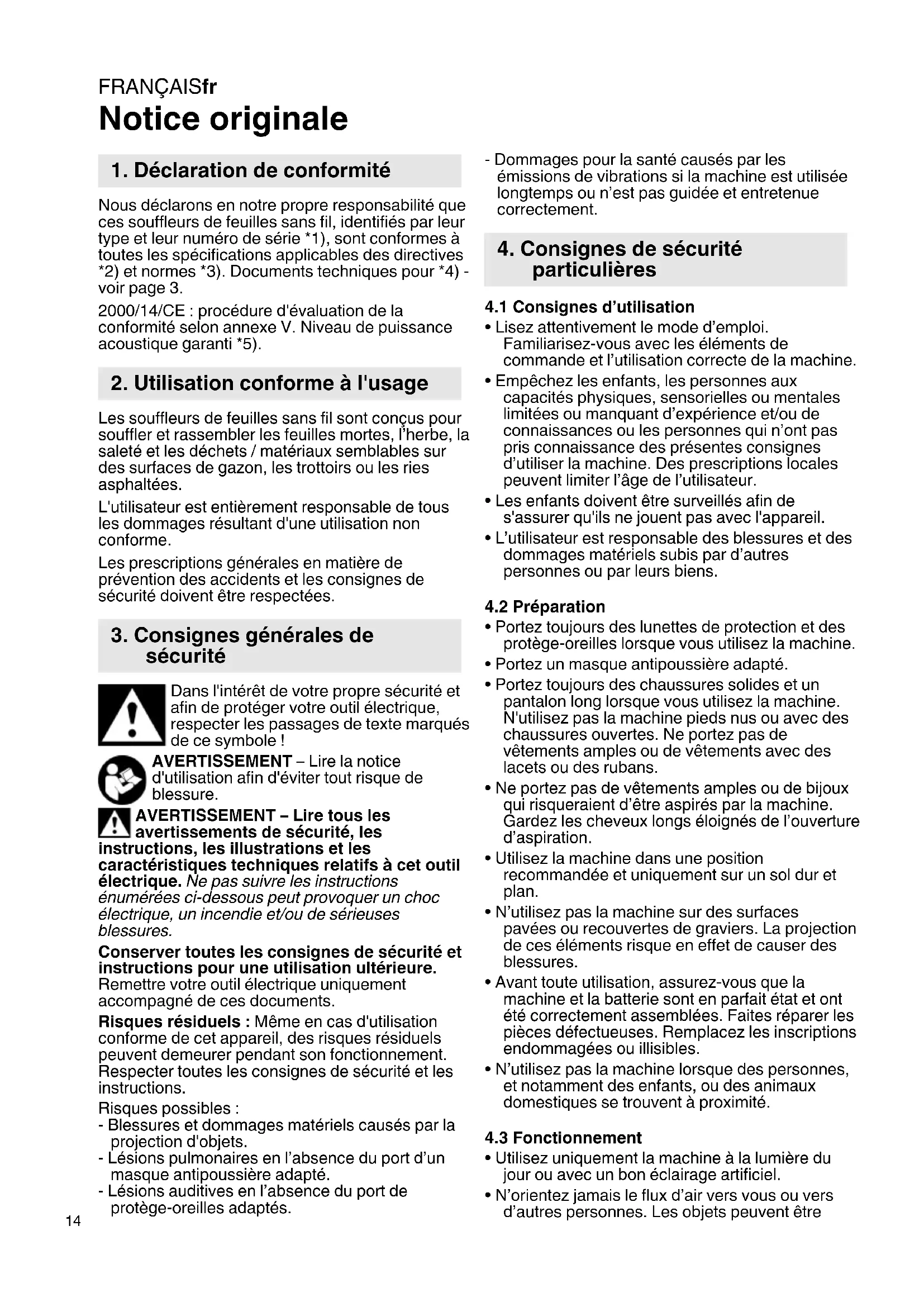 Notice originale Nous déclarons en notre propre responsabilité que ces souffleurs de feuilles sans fil, identifiés par leur type et leur numéro de série *1), sont conformes à toutes les spécifications applicables des directives *2) et normes *3). Documents techniques pour *4) - voir page 3. 2000/14/CE : procédure d'évaluation de la conformité selon annexe V. Niveau de puissance acoustique garanti *5). Les souffleurs de feuilles sans fil sont conçus pour souffler et rassembler les feuilles mortes, l’herbe, la saleté et les déchets / matériaux semblables sur des surfaces de gazon, les trottoirs ou les ries asphaltées. L'utilisateur est entièrement responsable de tous les dommages résultant d'une utilisation non conforme. Les prescriptions générales en matière de prévention des accidents et les consignes de sécurité doivent être respectées. Dans l'intérêt de votre propre sécurité et afin de protéger votre outil électrique, respecter les passages de texte marqués de ce symbole ! AVERTISSEMENT – Lire la notice d'utilisation afin d'éviter tout risque de blessure. AVERTISSEMENT – Lire tous les avertissements de sécurité, les instructions, les illustrations et les caractéristiques techniques relatifs à cet outil électrique. Ne pas suivre les instructions énumérées ci-dessous peut provoquer un choc électrique, un incendie et/ou de sérieuses blessures. Conserver toutes les consignes de sécurité et instructions pour une utilisation ultérieure. Remettre votre outil électrique uniquement accompagné de ces documents. Risques résiduels : Même en cas d'utilisation conforme de cet appareil, des risques résiduels peuvent demeurer pendant son fonctionnement. Respecter toutes les consignes de sécurité et les instructions. Risques possibles : - Blessures et dommages matériels causés par la projection d'objets. - Lésions pulmonaires en l’absence du port d’un masque antipoussière adapté. - Lésions auditives en l’absence du port de protège-oreilles adaptés. - Dommages pour la santé causés par les émissions de vibrations si la machine est utilisée longtemps ou n’est pas guidée et entretenue correctement.