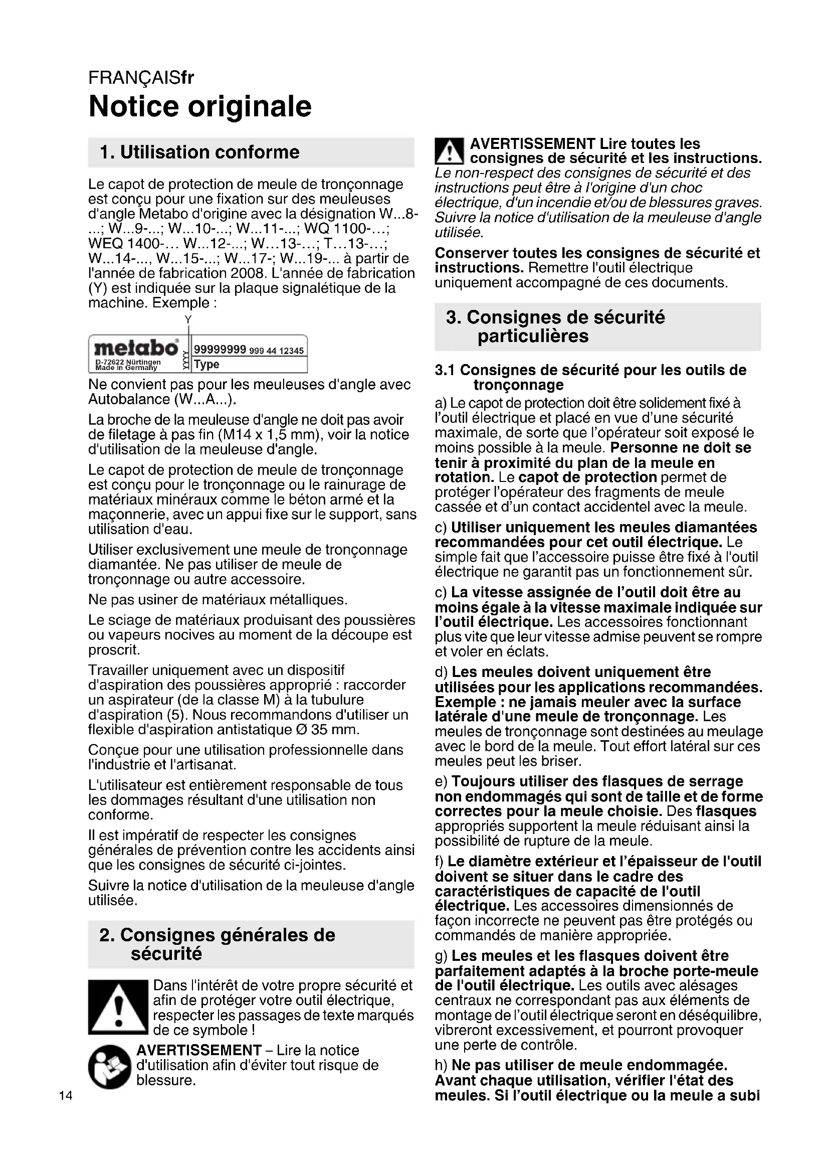 - -; W - à partir de l'année de fabrication 2008. L'année de fabrication (Y) est indiquée sur la plaque signalétique de la machine. Exemple : Ne convient pas pour les meuleuses d'angle avec Autobalance (W A ). La broche de la meuleuse d'angle ne doit pas avoir de filetage à pas fin (M14 x 1,5 mm), voir la notice d'utilisation de la meuleuse d'angle. Le capot de protection de meule de tronçonnage est conçu pour le tronçonnage ou le rainurage de matériaux minéraux comme le béton armé et la maçonnerie, avec un appui fixe sur le support, sans utilisation d'eau. Utiliser exclusivement une meule de tronçonnage diamantée. Ne pas utiliser de meule de tronçonnage ou autre accessoire. Ne pas usiner de matériaux métalliques. Le sciage de matériaux produisant des poussières ou vapeurs nocives au moment de la découpe est proscrit. Travailler uniquement avec un dispositif d'aspiration des poussières approprié : raccorder un aspirateur (de la classe M) à la tubulure d'aspiration (5). Nous recommandons d'utiliser un flexible d'aspiration antistatique Ø 35 mm. Conçue pour une utilisation professionnelle dans l'industrie et l'artisanat. L'utilisateur est entièrement responsable de tous les dommages résultant d'une utilisation non conforme. Il est impératif de respecter les consignes générales de prévention contre les accidents ainsi que les consignes de sécurité ci-jointes. Suivre la notice d'utilisation de la meuleuse d'angle utilisée. Dans l'intérêt de votre propre sécurité et afin de protéger votre outil électrique, respecter les passages de texte marqués de ce symbole ! AVERTISSEMENT – Lire la notice d'utilisation afin d'éviter tout risque de blessure. AVERTISSEMENT Lire toutes les consignes de sécurité et les instructions. Le non-respect des consignes de sécurité et des instructions peut être à l'origine d'un choc électrique, d'un incendie et/ou de blessures graves. Suivre la notice d'utilisation de la meuleuse d'angle utilisée. Conserver toutes les consignes de sécurité et instructions. Remettre l'outil électrique uniquement accompagné de ces documents. p. 19