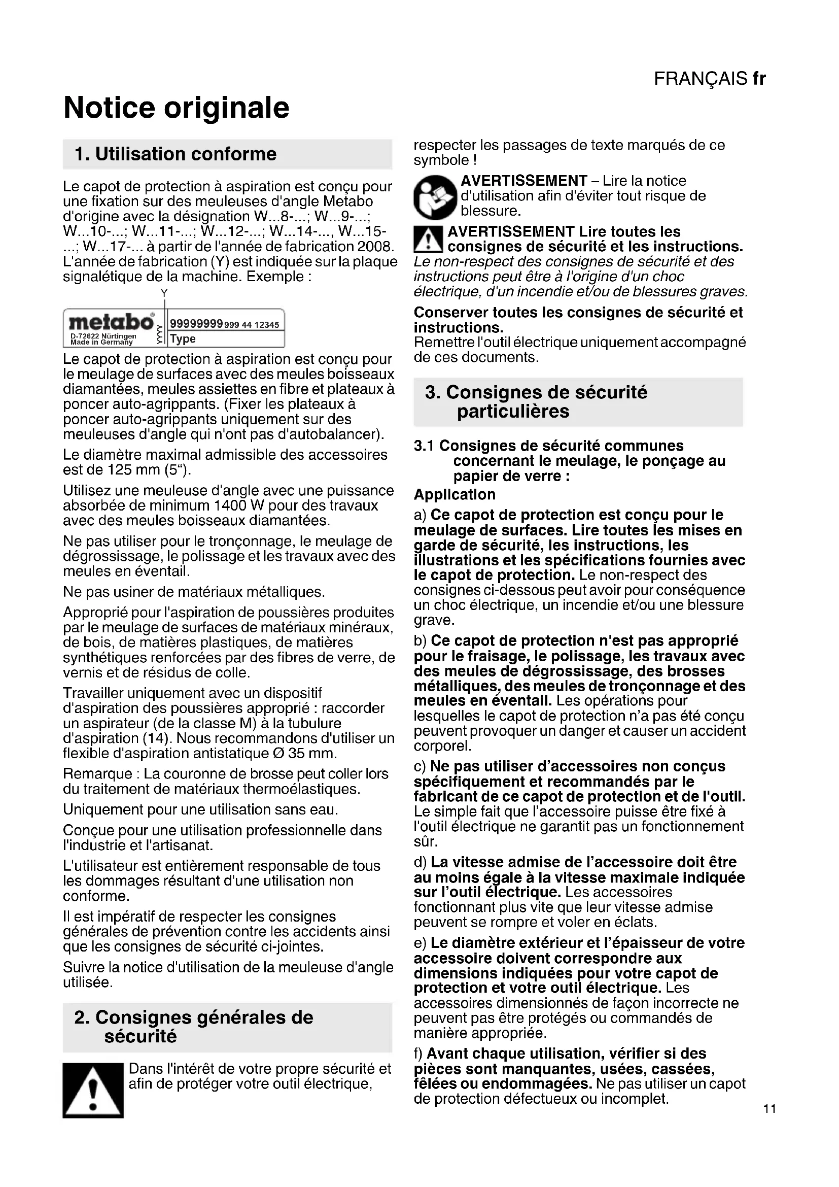 - Notice originale Le capot de protection à aspiration est conçu pour une fixation sur des meuleuses d'angle Metabo d'origine avec la désignation W - p. 8