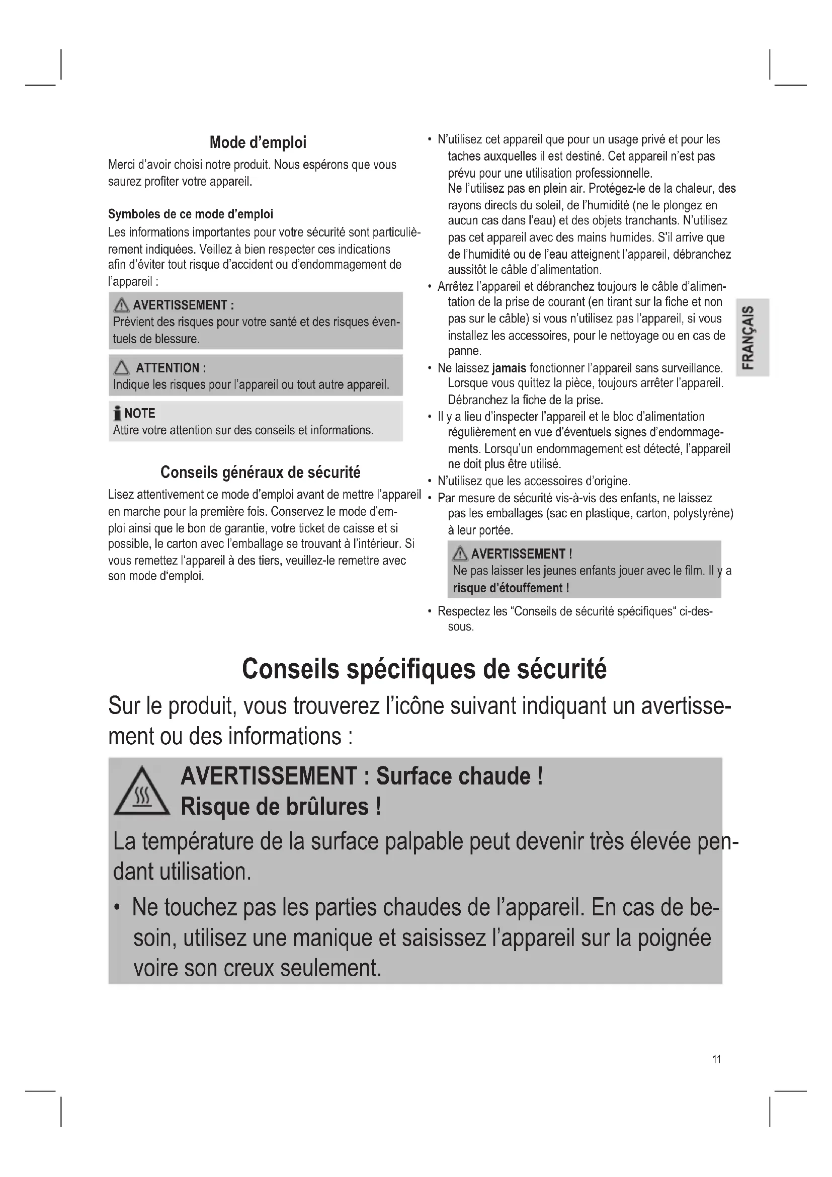 Prévient des risques pour votre santé et des risques éven- tuels de blessure. ATTENTION : Indique les risques pour l’appareil ou tout autre appareil. NOTE Attire votre attention sur des conseils et informations. Conseils généraux de sécurité Lisez attentivement ce mode d’emploi avant de mettre l’appareil en marche pour la première fois. Conservez le mode d’em- ploi ainsi que le bon de garantie, votre ticket de caisse et si possible, le carton avec l’emballage se trouvant à l’intérieur. Si vous remettez l‘appareil à des tiers, veuillez-le remettre avec son mode d‘emploi.
