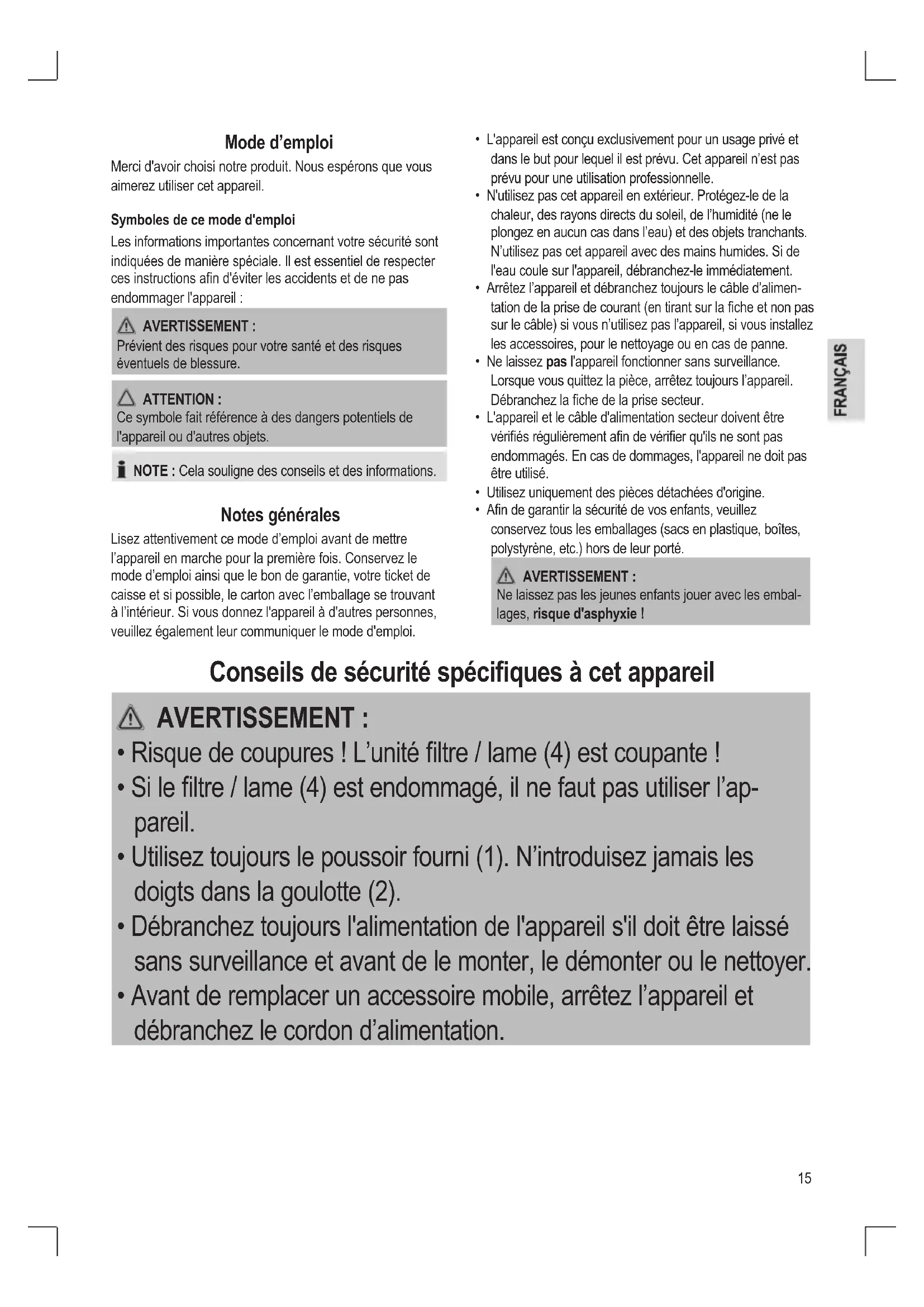 | Caractéristiques techniques | Extracteur de jus à vis sans fin, puissance de 150 W, vitesse de rotation de 60 tours/minute. |