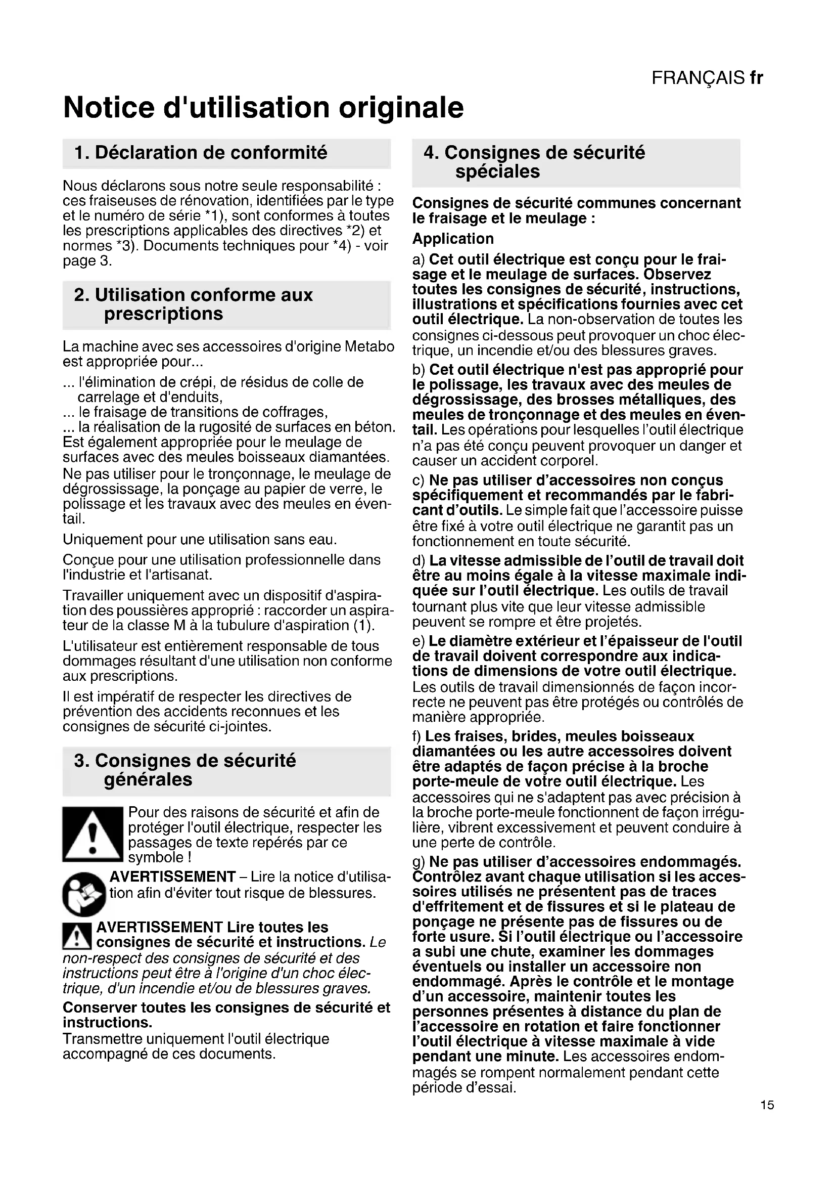Notice d'utilisation originale Nous déclarons sous notre seule responsabilité : ces fraiseuses de rénovation, identifiées par le type et le numéro de série *1), sont conformes à toutes les prescriptions applicables des directives *2) et normes *3). Documents techniques pour *4) - voir page 3. La machine avec ses accessoires d'origine Metabo est appropriée pour... ... l'élimination de crépi, de résidus de colle de carrelage et d'enduits, ... le fraisage de transitions de coffrages, ... la réalisation de la rugosité de surfaces en béton. Est également appropriée pour le meulage de surfaces avec des meules boisseaux diamantées. Ne pas utiliser pour le tronçonnage, le meulage de dégrossissage, la ponçage au papier de verre, le polissage et les travaux avec des meules en éven- tail. Uniquement pour une utilisation sans eau. Conçue pour une utilisation professionnelle dans l'industrie et l'artisanat. Travailler uniquement avec un dispositif d'aspira- tion des poussières approprié : raccorder un aspira- teur de la classe M à la tubulure d'aspiration (1). L'utilisateur est entièrement responsable de tous dommages résultant d'une utilisation non conforme aux prescriptions. Il est impératif de respecter les directives de prévention des accidents reconnues et les consignes de sécurité ci-jointes. Pour des raisons de sécurité et afin de protéger l'outil électrique, respecter les passages de texte repérés par ce symbole ! AVERTISSEMENT – Lire la notice d'utilisa- tion afin d'éviter tout risque de blessures. AVERTISSEMENT Lire toutes les consignes de sécurité et instructions. Le non-respect des consignes de sécurité et des instructions peut être à l'origine d'un choc élec- trique, d'un incendie et/ou de blessures graves. Conserver toutes les consignes de sécurité et instructions. Transmettre uniquement l'outil électrique accompagné de ces documents. Consignes de sécurité communes concernant le fraisage et le meulage : Application a) Cet outil électrique est conçu pour le frai- sage et le meulage de surfaces. Observez toutes les consignes de sécurité , instructions, illustrations et spécifications fournies avec cet outil électrique. La non-observation de toutes les consignes ci-dessous peut provoquer un choc élec- trique, un incendie et/ou des blessures graves. b) Cet outil électrique n'est pas approprié pour le polissage, les travaux avec des meules de dégrossissage, des brosses métalliques, des meules de tronçonnage et des meules en éven- tail. Les opérations pour lesquelles l’outil électrique n’a pas été conçu peuvent provoquer un danger et causer un accident corporel. c) Ne pas utiliser d’accessoires non conçus spécifiquement et recommandés par le fabri- cant d’outils. Le simple fait que l’accessoire puisse être fixé à votre outil électrique ne garantit pas un fonctionnement en toute sécurité. d) La vitesse admissible de l’outil de travail doit être au moins égale à la vitesse maximale indi- quée sur l’outil électrique. Les outils de travail tournant plus vite que leur vitesse admissible peuvent se rompre et être projetés. e) Le diamètre extérieur et l’épaisseur de l'outil de travail doivent correspondre aux indica- tions de dimensions de votre outil électrique. Les outils de travail dimensionnés de façon incor- recte ne peuvent pas être protégés ou contrôlés de manière appropriée. f) Les fraises, brides, meules boisseaux diamantées ou les autre accessoires doivent être adaptés de façon précise à la broche porte-meule de votre outil électrique. Les accessoires qui ne s'adaptent pas avec précision à la broche porte-meule fonctionnent de façon irrégu- lière, vibrent excessivement et peuvent conduire à une perte de contrôle. g) Ne pas utiliser d’accessoires endommagés. Contrôlez avant chaque utilisation si les acces- soires utilisés ne présentent pas de traces d'effritement et de fissures et si le plateau de ponçage ne présente pas de fissures ou de forte usure. Si l’outil électrique ou l’accessoire a subi une chute, examiner les dommages éventuels ou installer un accessoire non endommagé. Après le contrôle et le montage d’un accessoire, maintenir toutes les personnes présentes à distance du plan de l’accessoire en rotation et faire fonctionner l’outil électrique à vitesse maximale à vide pendant une minute. Les accessoires endom- magés se rompent normalement pendant cette période d’essai.
