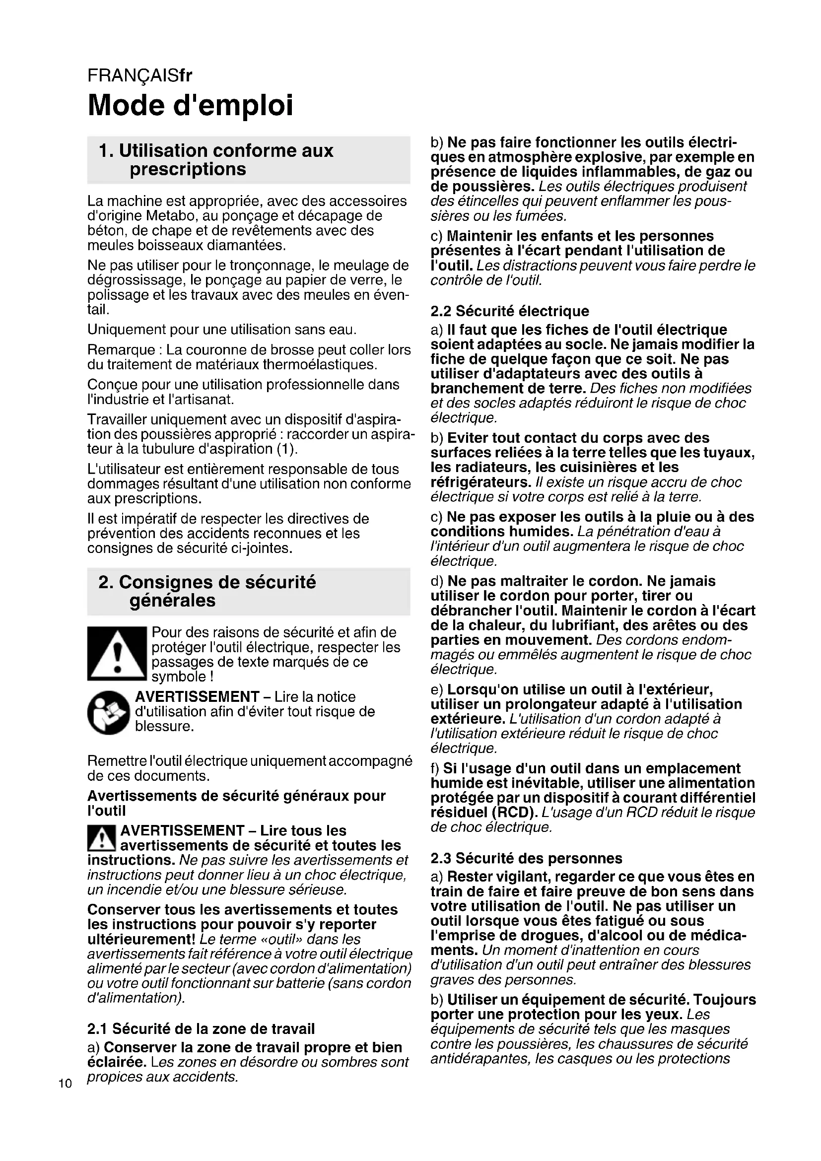 Mode d'emploi La machine est appropriée, avec des accessoires d'origine Metabo, au ponçage et décapage de béton, de chape et de revêtements avec des meules boisseaux diamantées. Ne pas utiliser pour le tronçonnage, le meulage de dégrossissage, le ponçage au papier de verre, le polissage et les travaux avec des meules en éven- tail. Uniquement pour une utilisation sans eau. Remarque : La couronne de brosse peut coller lors du traitement de matériaux thermoélastiques. Conçue pour une utilisation professionnelle dans l'industrie et l'artisanat. Travailler uniquement avec un dispositif d'aspira- tion des poussières approprié : raccorder un aspira- teur à la tubulure d'aspiration (1). L'utilisateur est entièrement responsable de tous dommages résultant d'une utilisation non conforme aux prescriptions. Il est impératif de respecter les directives de prévention des accidents reconnues et les consignes de sécurité ci-jointes. Pour des raisons de sécurité et afin de protéger l'outil électrique, respecter les passages de texte marqués de ce symbole ! AVERTISSEMENT – Lire la notice d'utilisation afin d'éviter tout risque de blessure. Remettre l'outil électrique uniquement accompagné de ces documents. Avertissements de sécurité généraux pour l'outil AVERTISSEMENT – Lire tous les avertissements de sécurité et toutes les instructions. Ne pas suivre les avertissements et instructions peut donner lieu à un choc électrique, un incendie et/ou une blessure sérieuse. Conserver tous les avertissements et toutes les instructions pour pouvoir s'y reporter ultérieurement! Le terme «outil» dans les avertissements fait référence à votre outil électrique alimenté par le secteur (avec cordon d'alimentation) ou votre outil fonctionnant sur batterie (sans cordon d'alimentation).