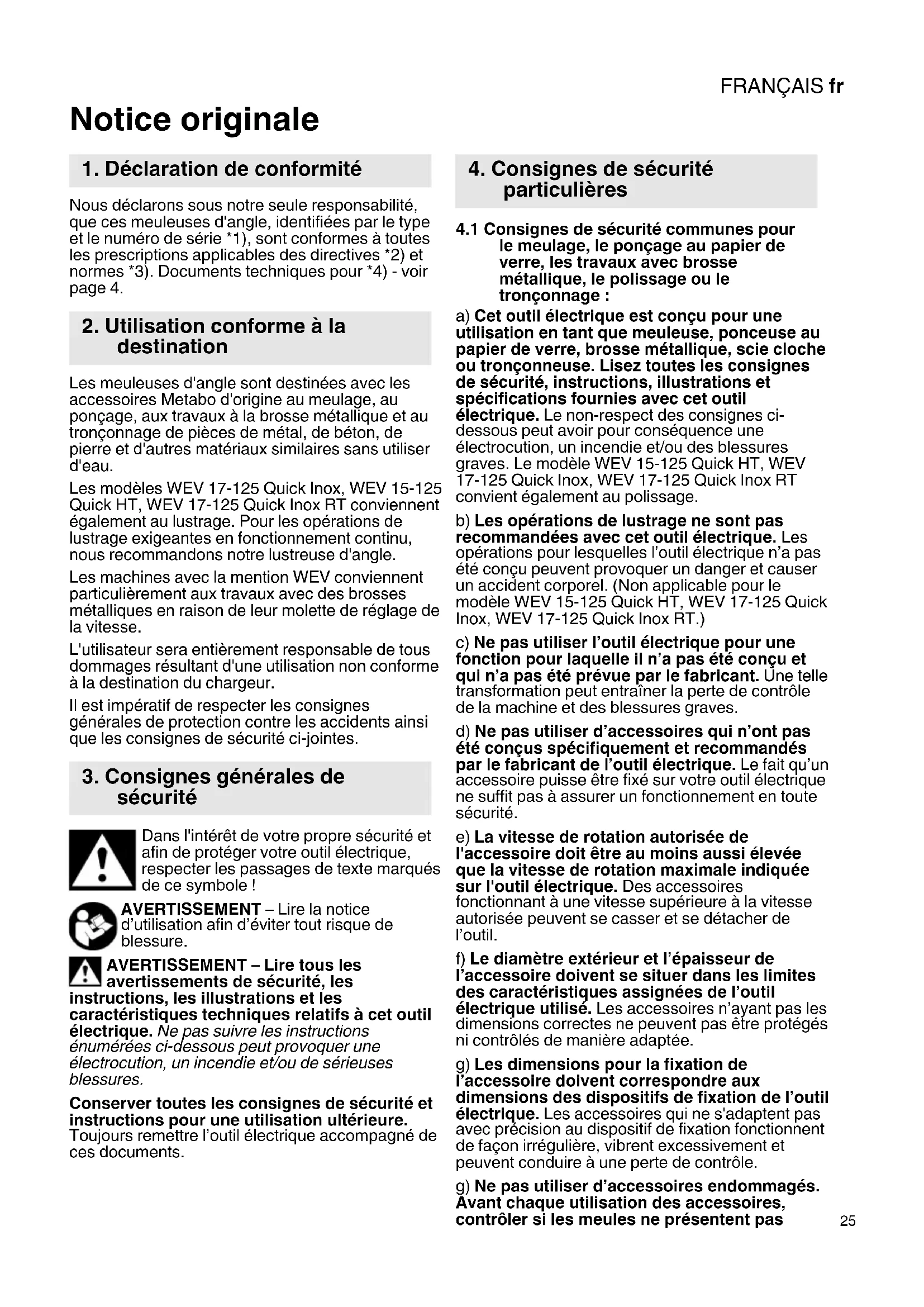 Notice originale Nous déclarons sous notre seule responsabilité, que ces meuleuses d'angle, identifiées par le type et le numéro de série *1), sont conformes à toutes les prescriptions applicables des directives *2) et normes *3). Documents techniques pour *4) - voir page 4. Les meuleuses d'angle sont destinées avec les accessoires Metabo d'origine au meulage, au ponçage, aux travaux à la brosse métallique et au tronçonnage de pièces de métal, de béton, de pierre et d'autres matériaux similaires sans utiliser d'eau. Les modèles WEV 17-125 Quick Inox, WEV 15-125 Quick HT, WEV 17-125 Quick Inox RT conviennent également au lustrage. Pour les opérations de lustrage exigeantes en fonctionnement continu, nous recommandons notre lustreuse d'angle. Les machines avec la mention WEV conviennent particulièrement aux travaux avec des brosses métalliques en raison de leur molette de réglage de la vitesse. L'utilisateur sera entièrement responsable de tous dommages résultant d'une utilisation non conforme à la destination du chargeur. Il est impératif de respecter les consignes générales de protection contre les accidents ainsi que les consignes de sécurité ci-jointes. Dans l'intérêt de votre propre sécurité et afin de protéger votre outil électrique, respecter les passages de texte marqués de ce symbole ! AVERTISSEMENT – Lire la notice d’utilisation afin d’éviter tout risque de blessure. AVERTISSEMENT – Lire tous les avertissements de sécurité, les instructions, les illustrations et les caractéristiques techniques relatifs à cet outil électrique. Ne pas suivre les instructions énumérées ci-dessous peut provoquer une électrocution, un incendie et/ou de sérieuses blessures. Conserver toutes les consignes de sécurité et instructions pour une utilisation ultérieure. Toujours remettre l’outil électrique accompagné de ces documents.