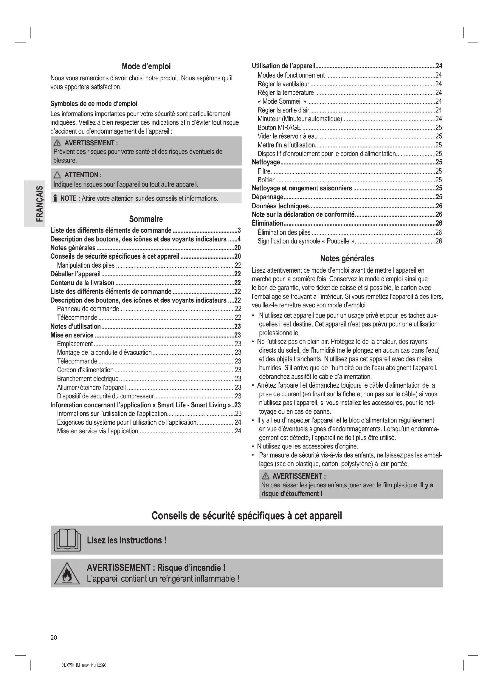 - Appuyez à nouveau sur le bouton POWER pour éteindre l’appareil. Le volet pivotant se ferme automatiquement. Dispositif de sécurité du compresseur Si le fonctionnement est interrompu, le dispositif de sécurité du com- presseur est activé. Ceci empêche l’utilisation du compresseur pendant environ 3 minutes, pour laisser s’évacuer la pression dans le circuit de refroidissement. Ceci n’est pas un défaut de l’appareil. Patientez donc au moins 3 minutes avant de remettre l’appareil en fonctionnement. Information concernant l’application « Smart Life - Smart Living » L’application Smart Life - Smart Living est disponible sur android et iOS. Analysez le code QR correspondant pour vous rendre immédiate- ment sur la page de téléchargement. NOTE : En fonction du fournisseur, le téléchargement de l’application peut don- ner lieu a des frais. Google Play App Store Informations sur l’utilisation de l’application Cette application vous permet d’utiliser l’appareil via votre réseau domes- tique. La condition préalable est une connexion Wi-Fi permanente à votre routeur, et l’application gratuite « Smart Life - Smart Living ». Vous pouvez contrôler aisément toutes les fonctions de l’appareil via l’ap- plication. L’application est constamment améliorée, c’est pourquoi nous ne pouvons pas en faire une description plus détaillée ici. Nous vous recommandons de débrancher l’appareil de l’alimentation si vous n’êtes pas à votre domicile pour empêcher toute mise en service involontaire lorsque vous voyagez !24 CL3750_IM_new 11.11.2020 Exigences du système pour l’utilisation de l’application