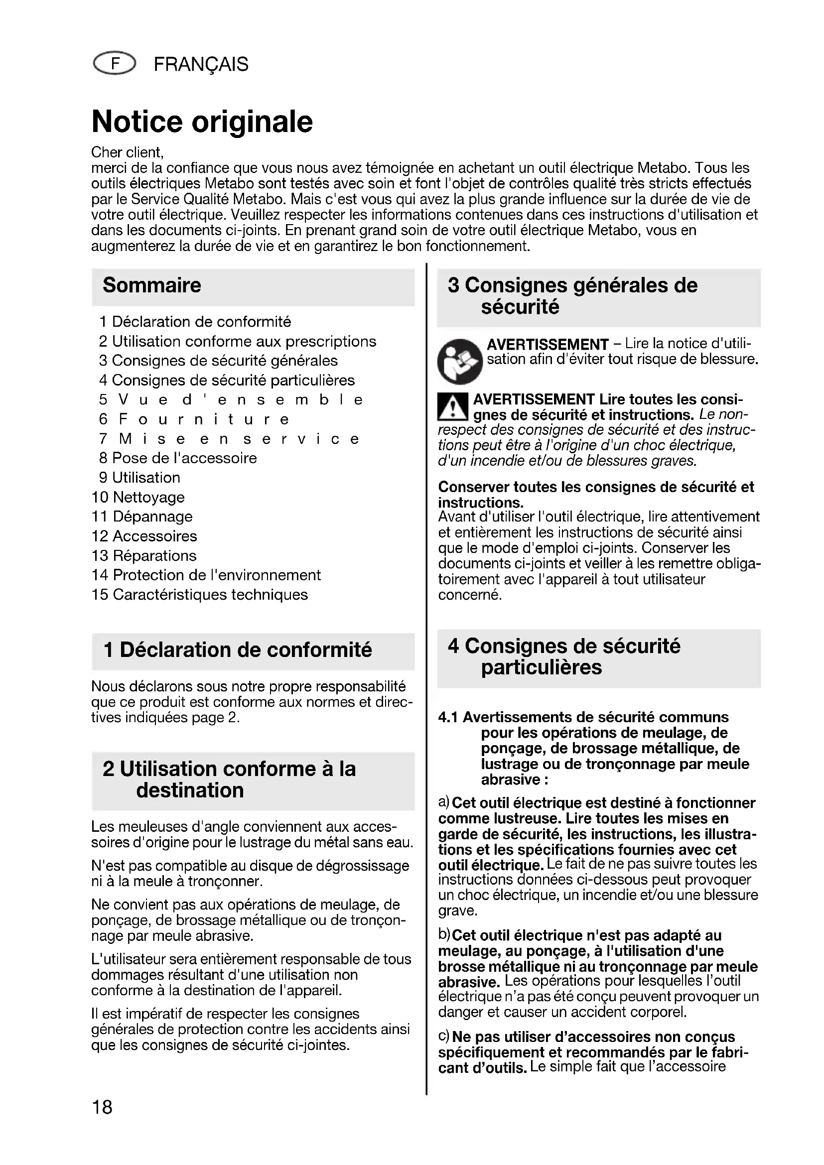 1 Déclaration de conformité 2 Utilisation conforme aux prescriptions 3 Consignes de sécurité générales 4 Consignes de sécurité particulières 5Vue d'ensemble 6Fourniture 7Mise en service 8 Pose de l'accessoire 9 Utilisation 10 Nettoyage 11 Dépannage 12 Accessoires 13 Réparations 14 Protection de l'environnement 15 Caractéristiques techniques Nous déclarons sous notre propre responsabilité que ce produit est conforme aux normes et direc- tives indiquées page 2. Les meuleuses d'angle conviennent aux acces- soires d'origine pour le lustrage du métal sans eau. N'est pas compatible au disque de dégrossissage ni à la meule à tronçonner. Ne convient pas aux opérations de meulage, de ponçage, de brossage métallique ou de tronçon- nage par meule abrasive. L'utilisateur sera entièrement responsable de tous dommages résultant d'une utilisation non conforme à la destination de l'appareil. Il est impératif de respecter les consignes générales de protection contre les accidents ainsi que les consignes de sécurité ci-jointes. AVERTISSEMENT – Lire la notice d'utili- sation afin d'éviter tout risque de blessure. AVERTISSEMENT Lire toutes les consi- gnes de sécurité et instructions. Le non- respect des consignes de sécurité et des instruc- tions peut être à l'origine d'un choc électrique, d'un incendie et/ou de blessures graves. Conserver toutes les consignes de sécurité et instructions. Avant d'utiliser l'outil électrique, lire attentivement et entièrement les instructions de sécurité ainsi que le mode d'emploi ci-joints. Conserver les documents ci-joints et veiller à les remettre obliga- toirement avec l'appareil à tout utilisateur concerné.